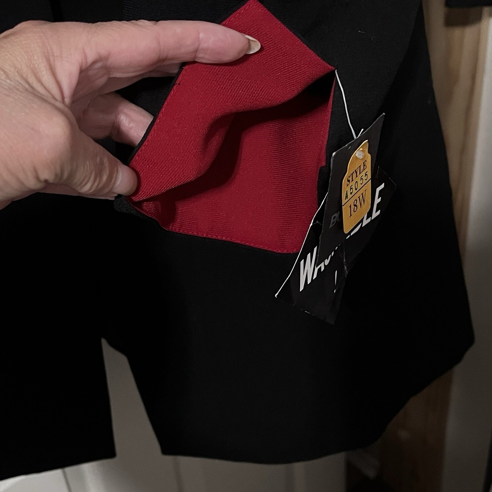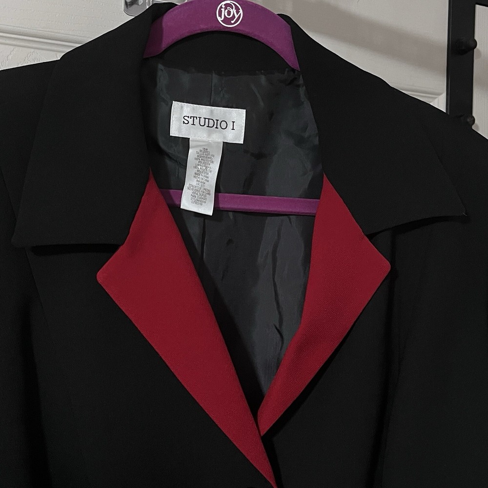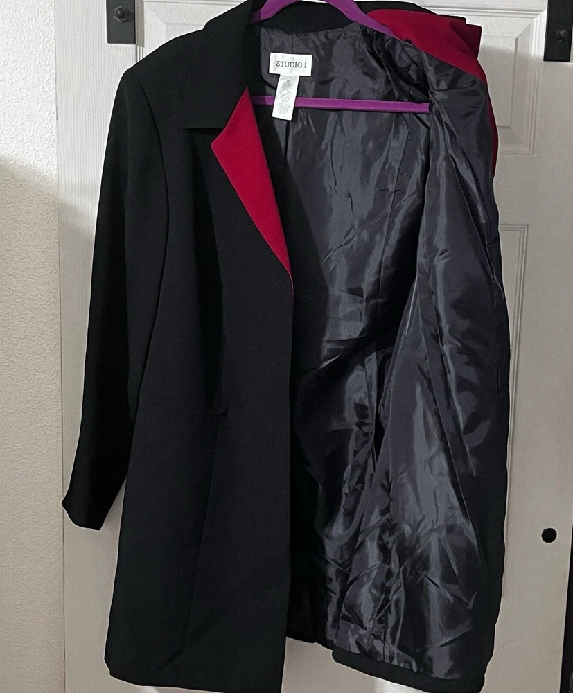 25363 Studio 1 Womans SZ 18 W Lightweight Over Coat Contoured Timeless Stylish Dressy Classy Black Red Trim Above Knee This Studio 1 Women's Lightweight Coat in size 18W Classy design with a black exterior and red trim accents on the lapel and cuffs Mid-length, single-breasted button closure. It is perfect for various occasions like church, weddings, or professional settings, offering a Stylish and timeless look. Church, weddings, or professional settings Machine wash HANG DRY Tailored silhouette and elegant details, this coat is a versatile and chic addition to any wardrobe. New With Tags Pit to Pit 23 " Length 38" 1 Day Shipping Free 30 Day Returns