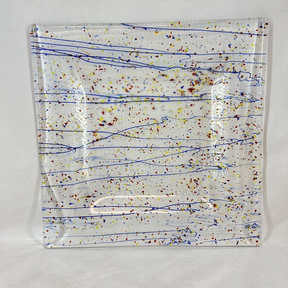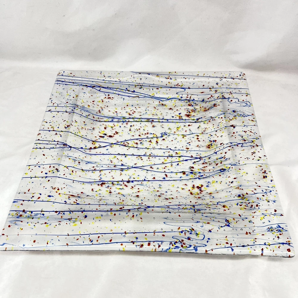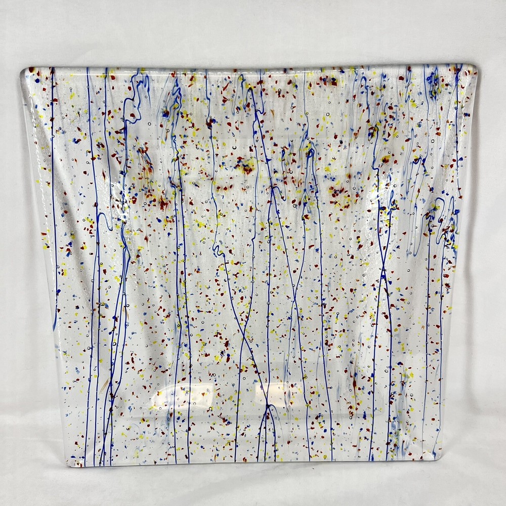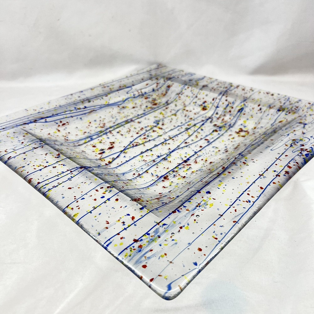 This beautiful square serving tray plate is made of fused art glass, featuring a multicolor abstract pattern with streamers and confetti. Measuring 14 inches in length, this tray is perfect for serving desserts or cheese. It is handmade with a glossy finish, and its production style is art glass. The tray is a perfect addition to your MCM product line. The origin of this tray is North America, and it is made in the United States.