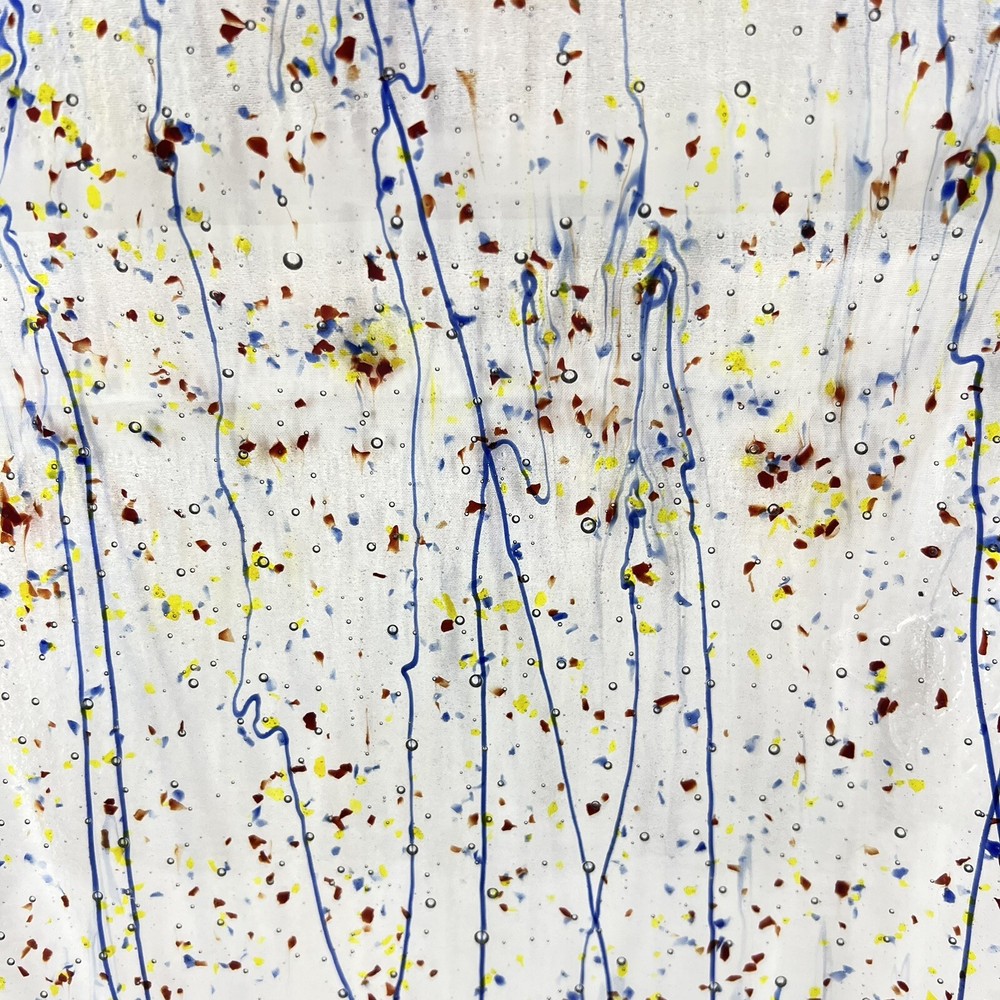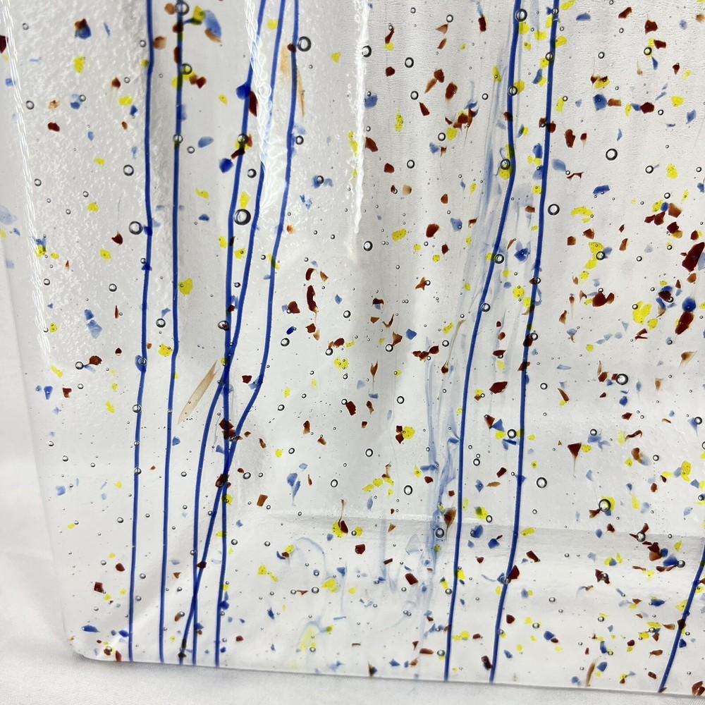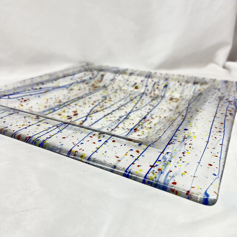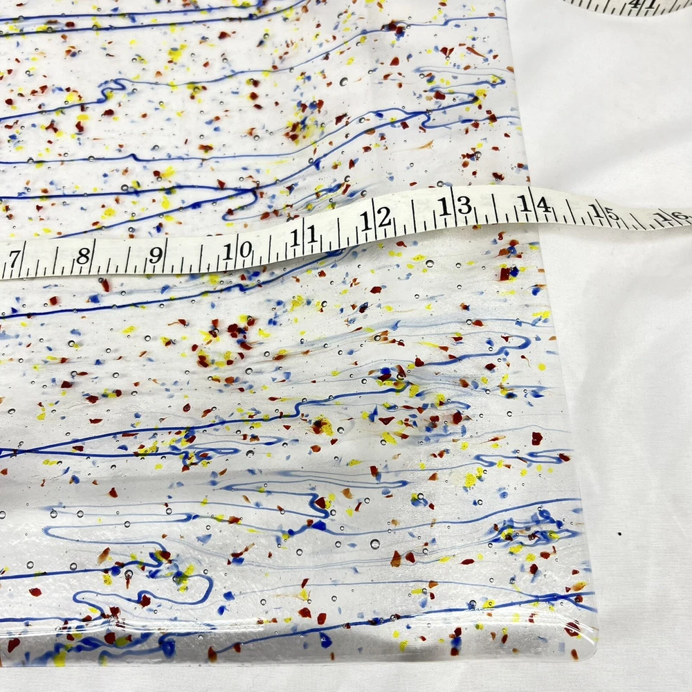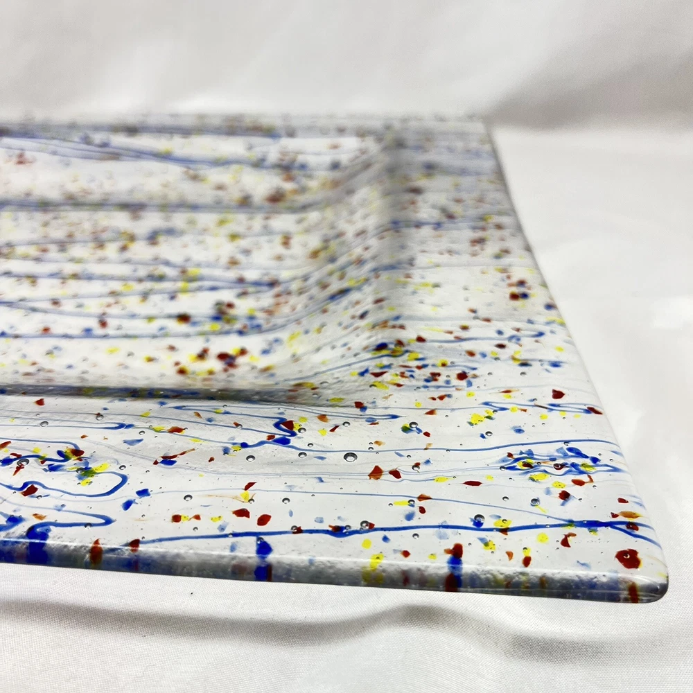This beautiful square serving tray plate is made of fused art glass, featuring a multicolor abstract pattern with streamers and confetti. Measuring 14 inches in length, this tray is perfect for serving desserts or cheese. It is handmade with a glossy finish, and its production style is art glass. The tray is a perfect addition to your MCM product line. The origin of this tray is North America, and it is made in the United States.