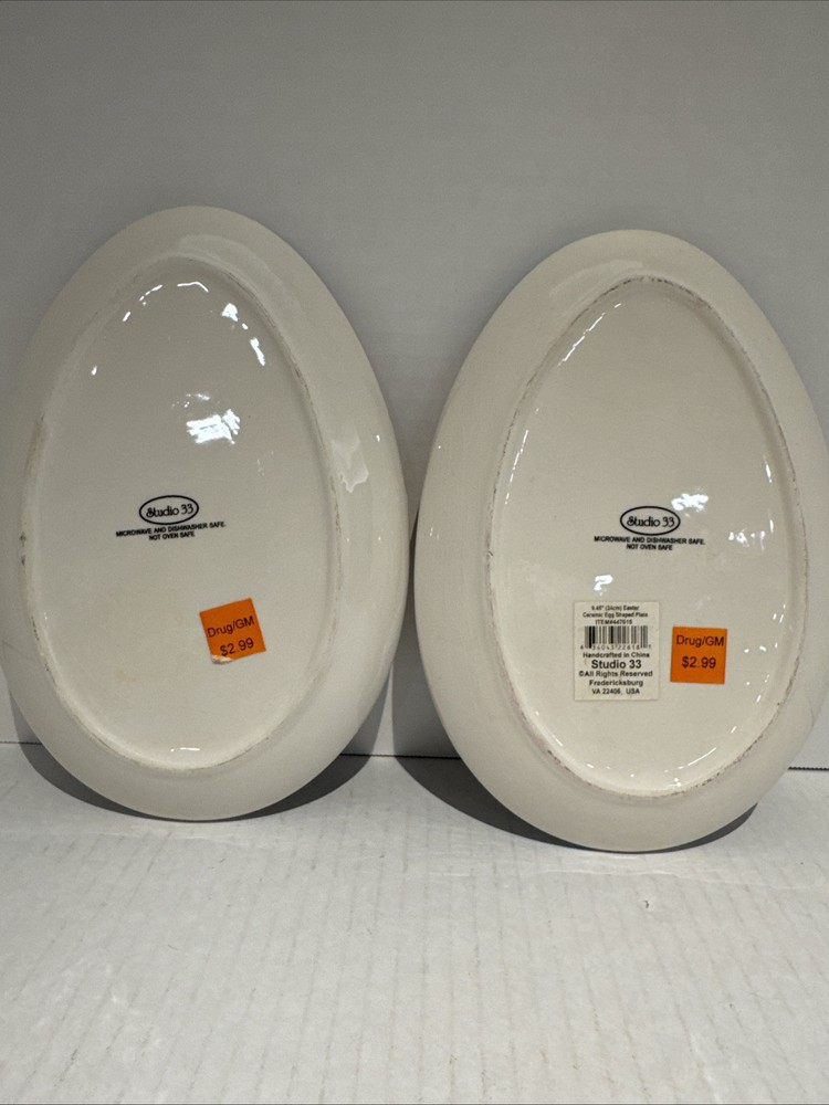 Celebrate Easter with this charming pair of Studio 33 ceramic decorative plates, each shaped like an oval egg and adorned with delightful bunnies. These plates measure 9 1/4 inches in height and width, making them a medium-sized addition to any room's decor. Their glazed finish and multicolor design bring a touch of whimsy to your Easter festivities. Crafted from high-quality ceramic and porcelain, these collector plates are not only a festive delight but also an easy-care addition to your home. The plates are unboxed, and no additional parts are required. They stand at 4 inches in length and weigh 14 ounces each. Perfect for any space, these plates will serve as a cheerful reminder of the Easter spirit throughout the year.