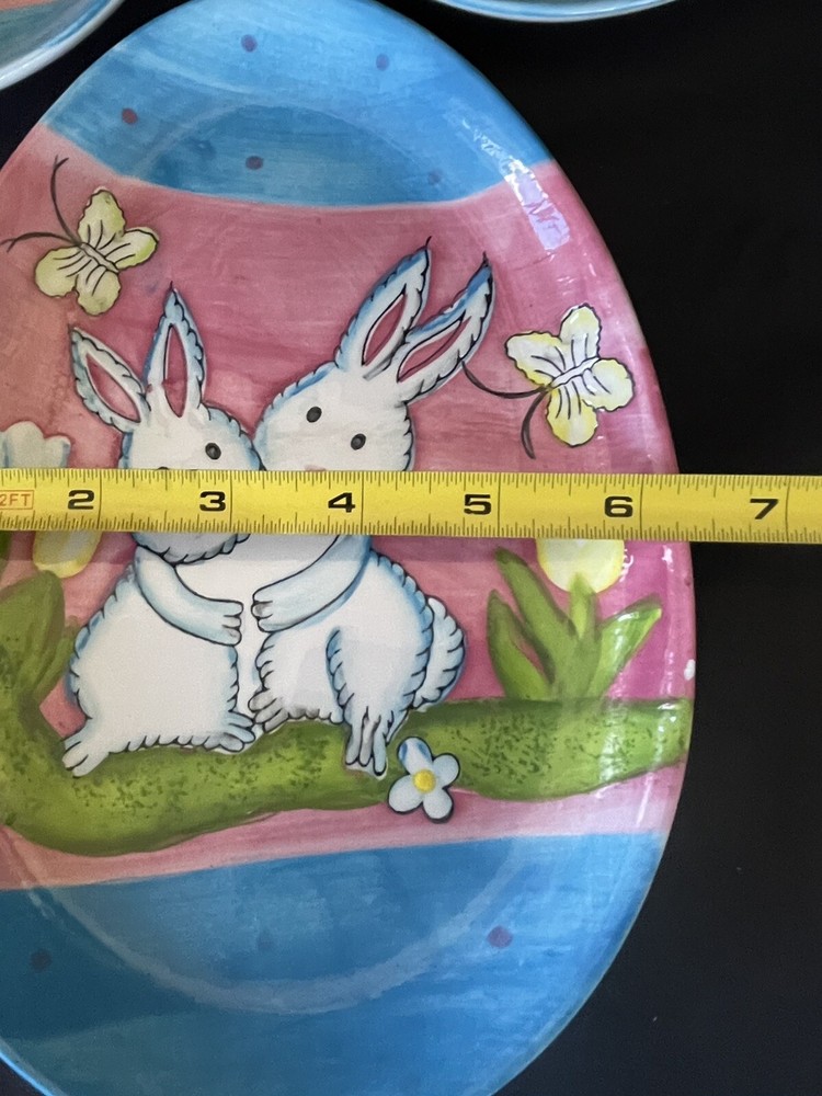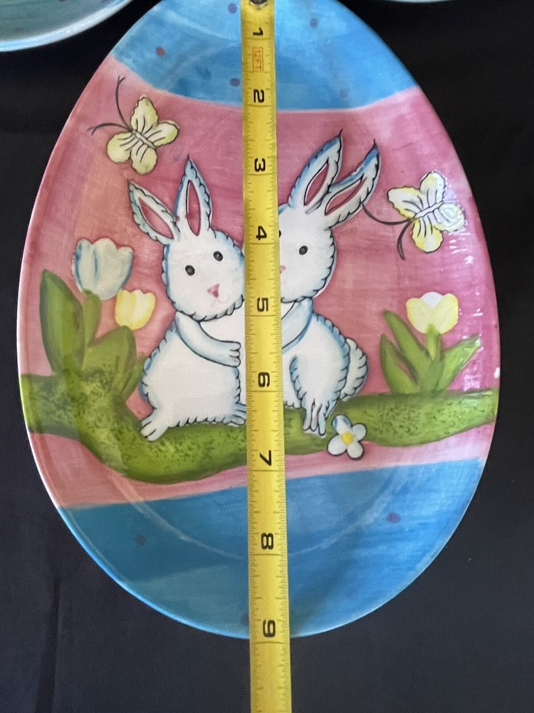 Add a touch of Easter charm to any room with these Studio 33 Ceramic Decorative Easter Egg Shaped Plates. The oval egg shape and glazed finish make them perfect for display or use as a decorative accent. The plates feature adorable bunnies and rabbits in multicolor, making them a great addition to any Easter-themed occasion.