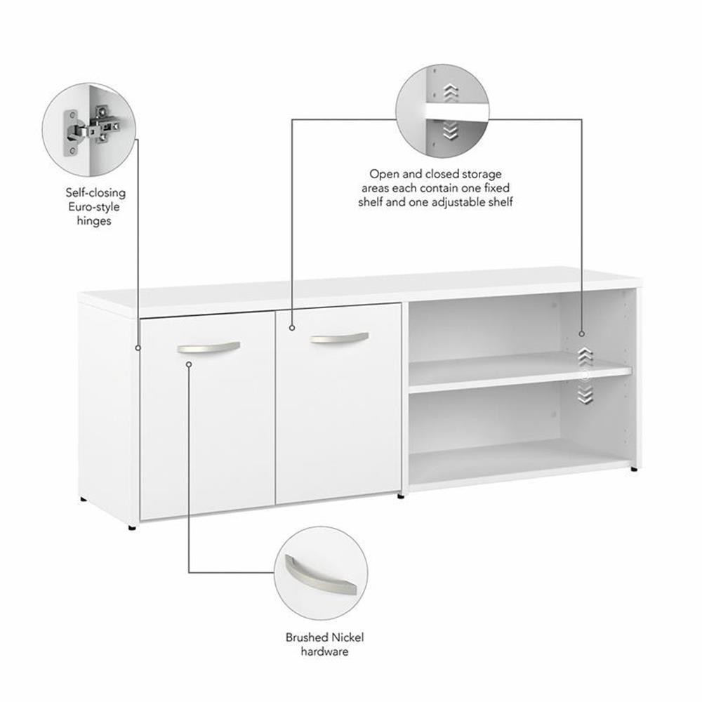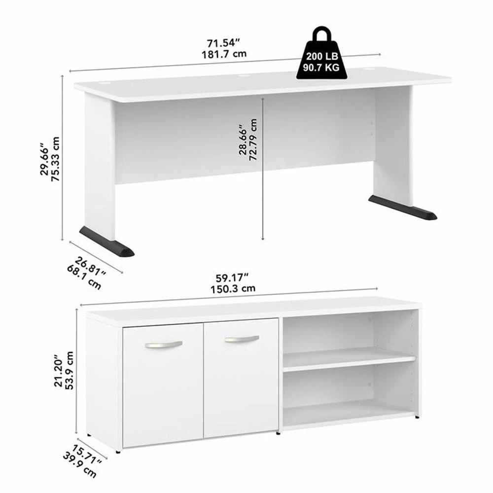 The Bush Business Furniture Studio A 72W L Shaped Gaming Desk with Storage features a fresh, contemporary appearance and commercial quality construction that promises to withstand years of regular use. Take your gaming setup to the next level with a 72-inch desktop that accommodates all the components and equipment you need to power through long sessions in your favorite virtual world. The durable surface supports up to 200 pounds and includes three built-in wire management grommets to keep cords and cables in order. The Low Storage Cabinet's open and closed compartments each have one fixed shelf and one adjustable shelf to hold books, game manuals and more. This gaming computer desk with storage has been meticulously tested to meet or exceed ANSI/BIFMA standards for safety, durability and performance and is backed by a 10 Year Warranty. American made with U.S. and imported parts. Features: Bundle includes: 72W Gaming Desk, 60W Low Storage Cabinet with Doors and Shelves Durable desktop easily supports components and equipment with a weight capacity of 200 pounds 72-inch desk surface includes three built-in wire management grommets to keep cords and cables in order Thoughtfully designed for maximum stability and includes hardware to anchor the gaming computer desk to a wall Storage credenza can be placed on either side of the work surface for a right- or left-handed L Shaped Gaming Desk setup Cabinet doors conceal the equipment and supplies you want kept out of sight; open shelving is perfect for frequently used materials Open and closed storage areas each contain one fixed shelf and one adjustable shelf to accommodate items of various sizes Bush Business Furniture's commitment to safety includes rigorous testing that meets or exceeds ANSI/BIFMA standards Backed by a 10 Year Manufacturer's Warranty Specifications: Product Dimensions: 60W Low Storage Return: 59.17"W x 15.71"D x 21.20"H Product Dimensions: 72W Desk: 4.30"W x 26.81"D x 29.66"H Product Weight: 196.65 Product Color: White Assembly Required: Yes