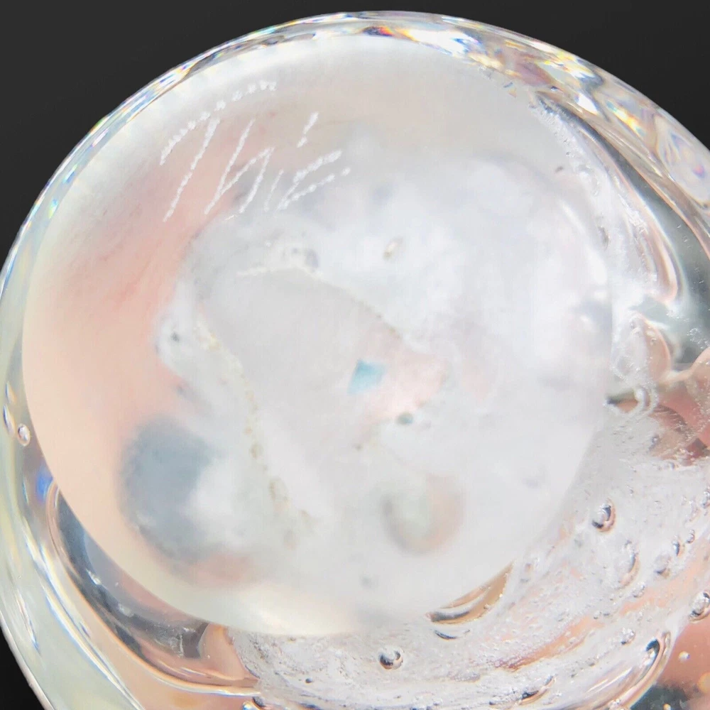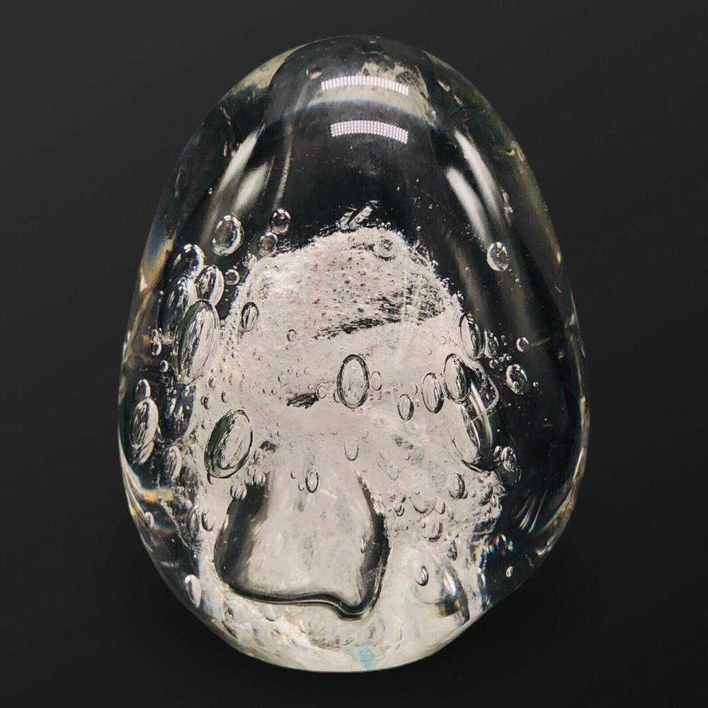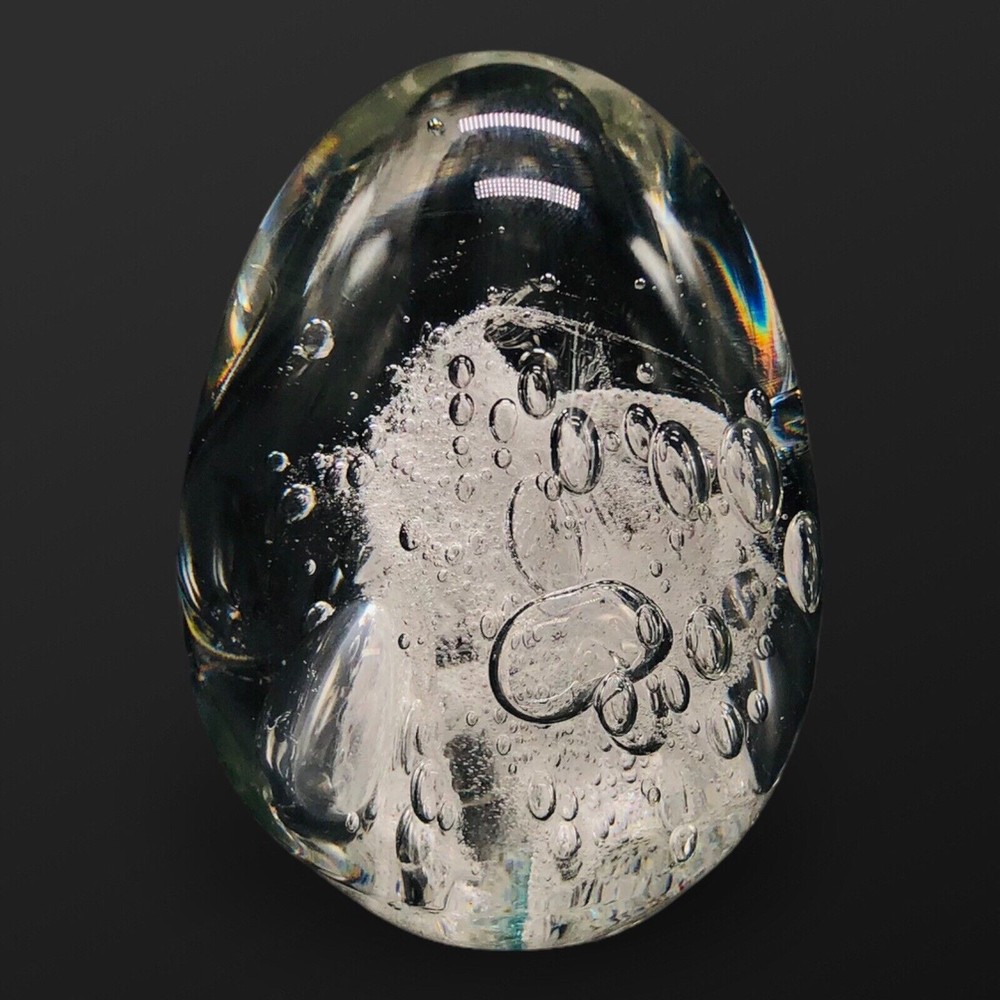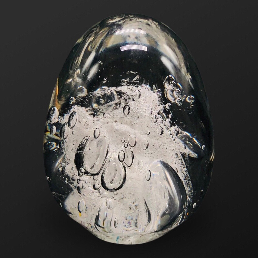 This stunning blown glass paperweight is a true work of art! The egg-shaped design features mesmerizing bubbles and swirls that catch the light beautifully. At 4 inches, it has a satisfying weight and flawless craftsmanship, signed by artist Thie. The frosted base adds an elegant touch, making it perfect for display or practical use. A gorgeous conversation piece that adds sophistication to any space. I love how the waves of color seem to move when turned in the light – absolutely captivating!