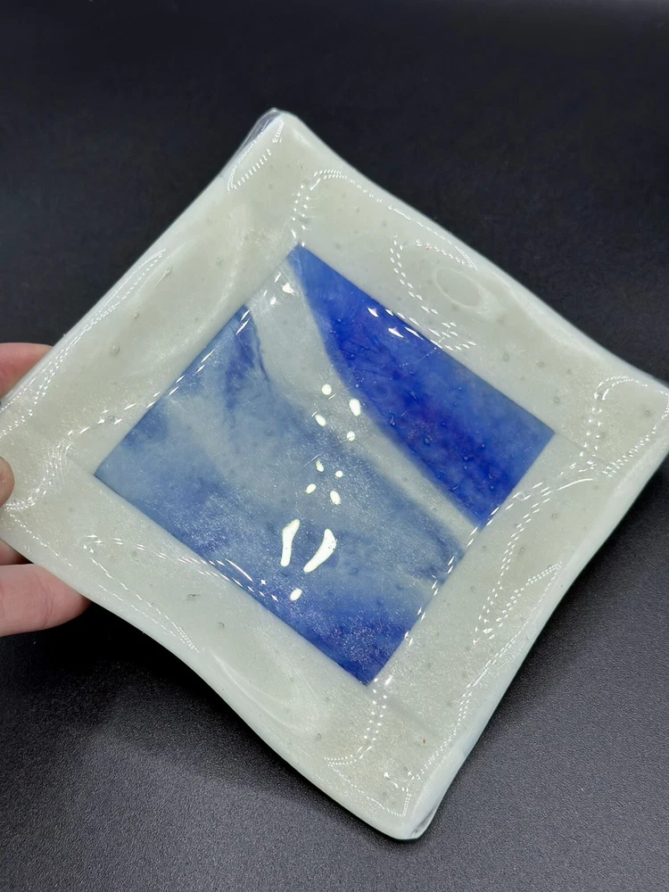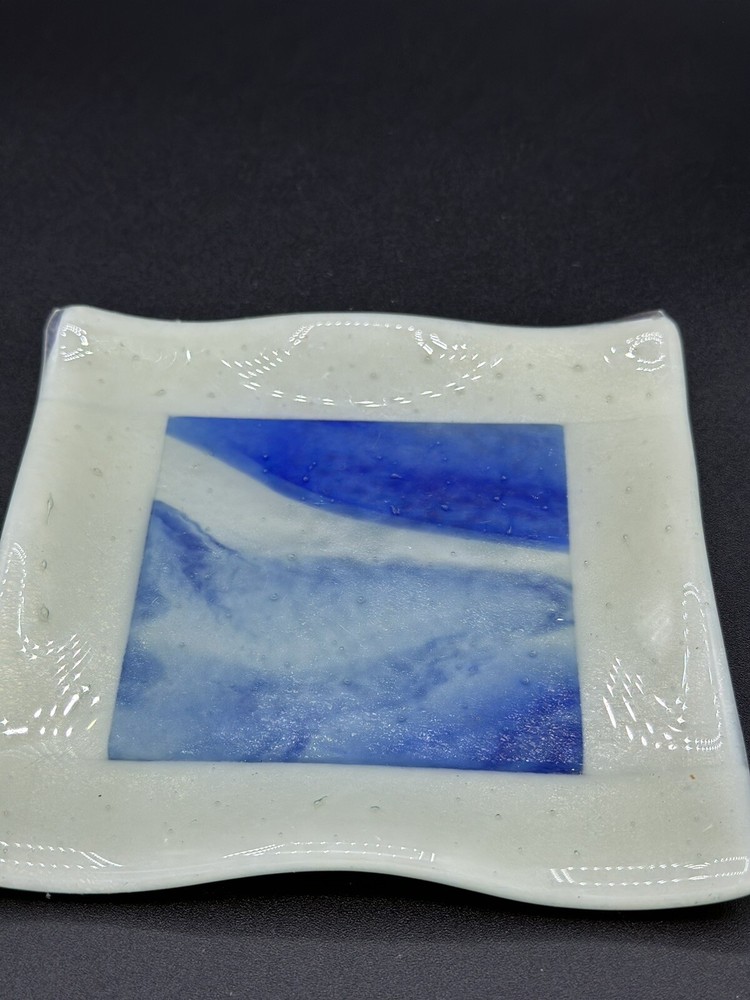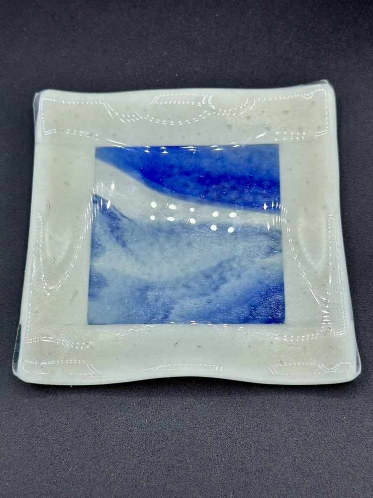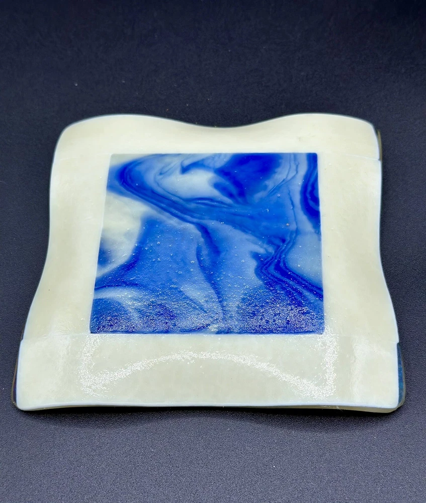 Studio Art Fused Glass Sea Blue White Boarder Square Curved Trinket Tray 5.25”. This is a studio Art piece, the corners are a bit rough (maybe chipped, I can’t tell), which is not noticeable unless feeling. Other than that his is in good condition. See pictures. This has a blue swirl ocean like center and a white boarder. This could be used as a trinket dish or tray or an ashtray. This is 5.25” x 5.25”