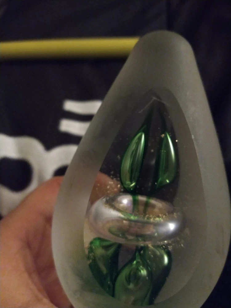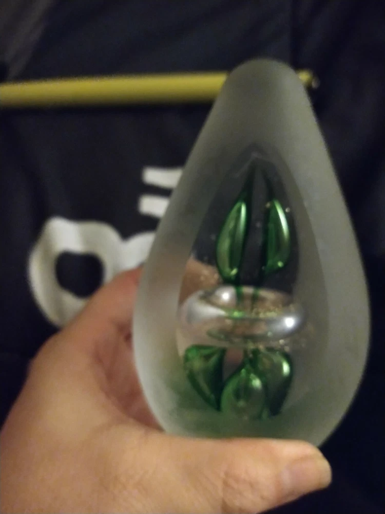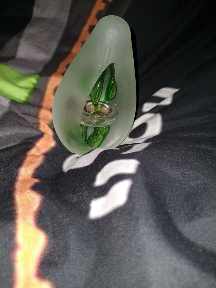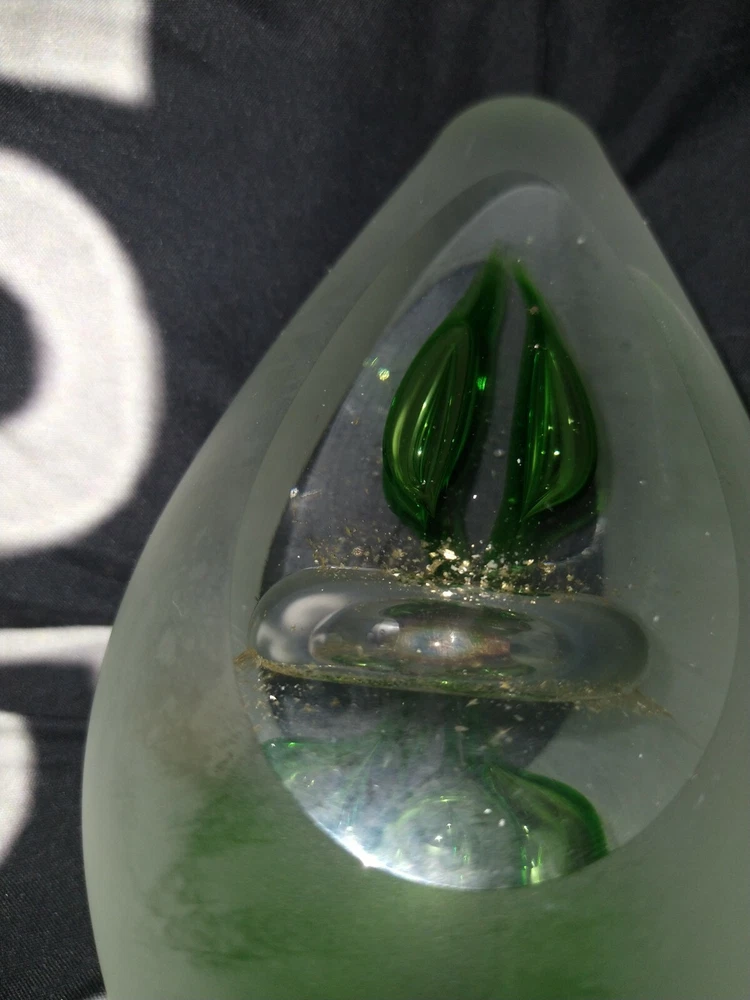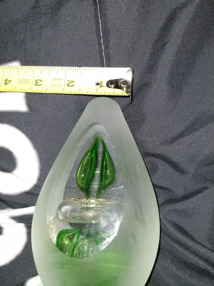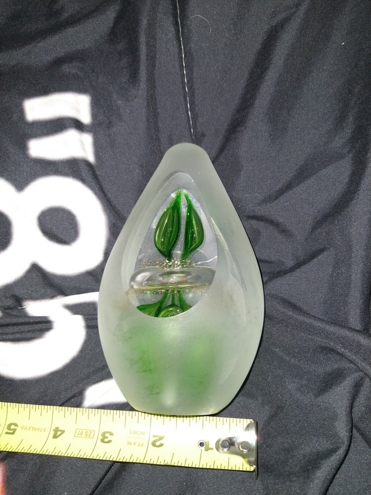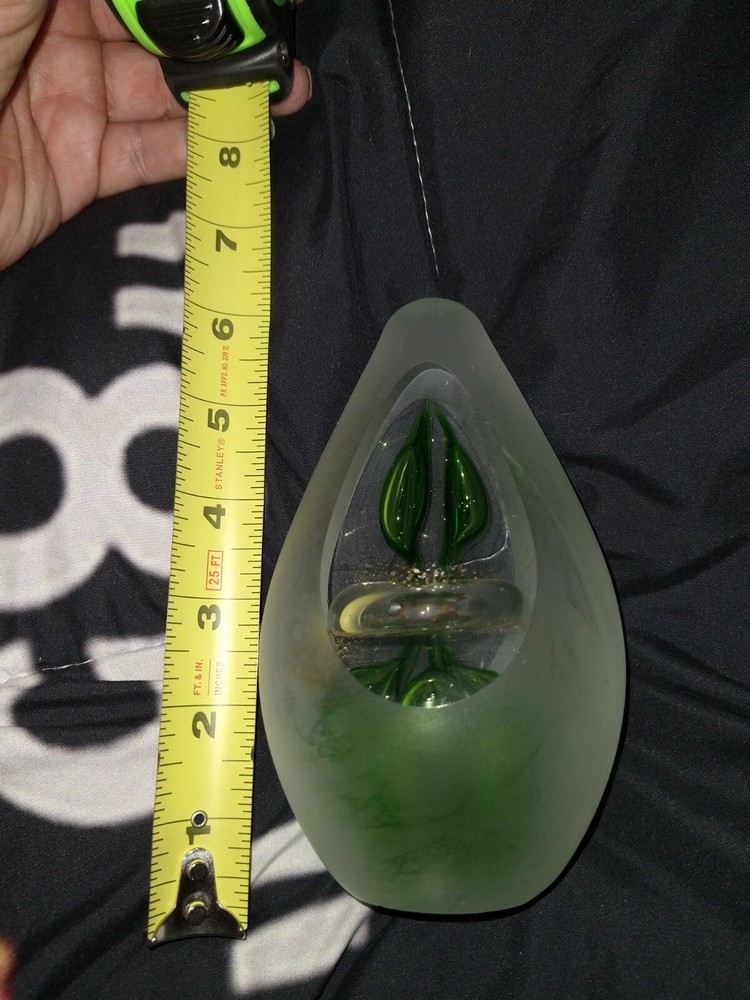 Studio Art Glass 6" Green and Gold Controlled bubbles avocado/egg Shaped Paperweight. Condition is "Used". Shipped with USPS Priority Mail. Will come as shown no chips or cracks decently heavy paper weight. Please ask any questions you may have prior to bidding as all sales are final no returns. Comes from a smoke free Home Will be shipped bubble wrapped and with peanuts for safe shipping