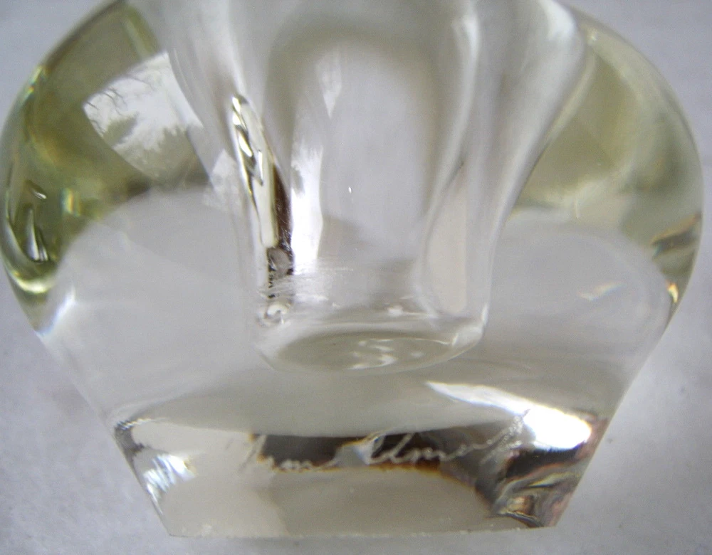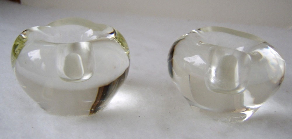 Studio Art Glass Clear Apple Abstract Shaped Candle Holders Lot of 2 Difficult to read artist signature - Tim Umul ? 1 3/4" tall by 3" across the top Clear fresh design with flat sanded bottom No chips, cracks or scratches See photos. If you are buying more than one item, please contact us for a revised invoice with combined shipping.