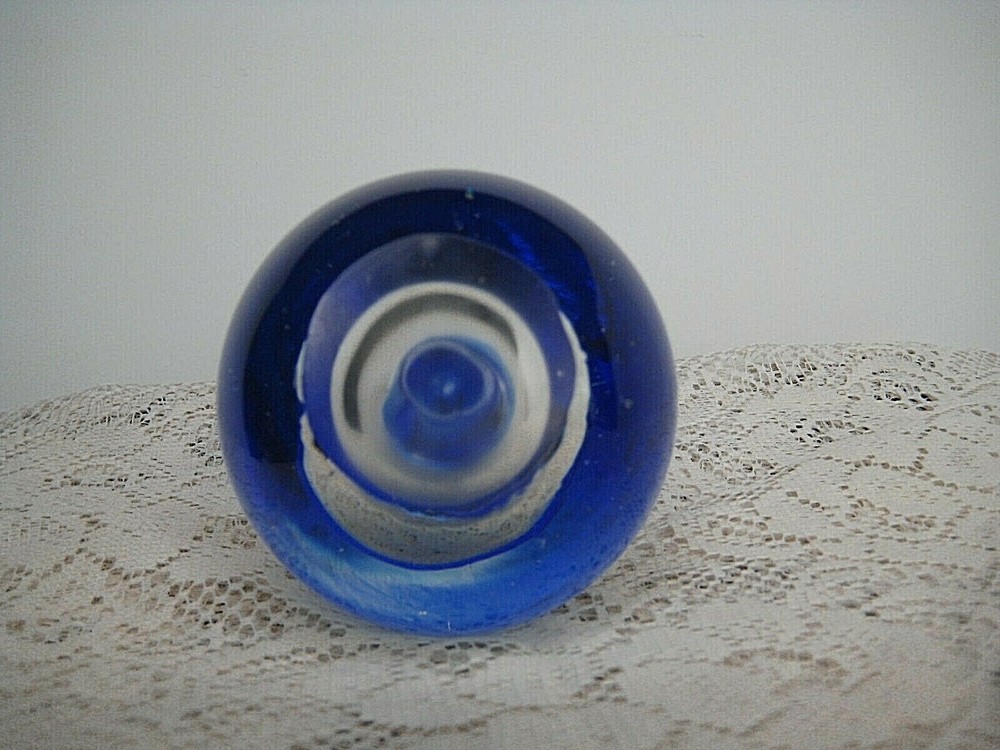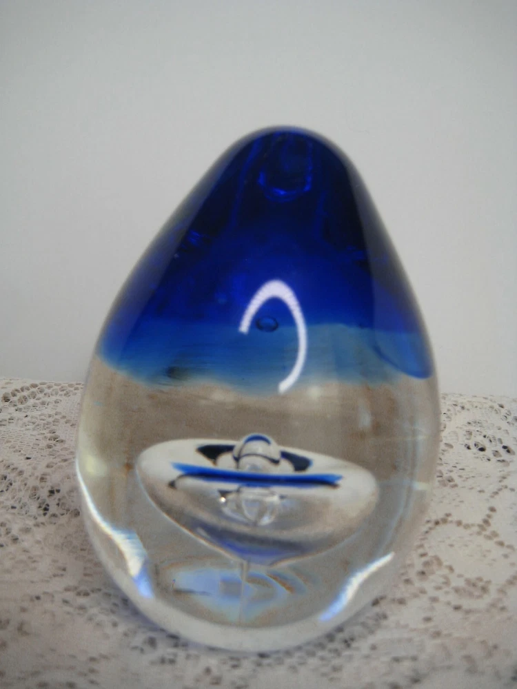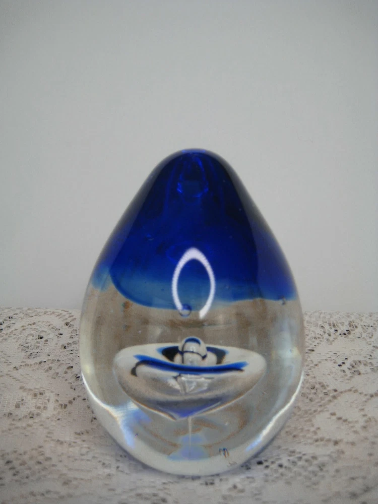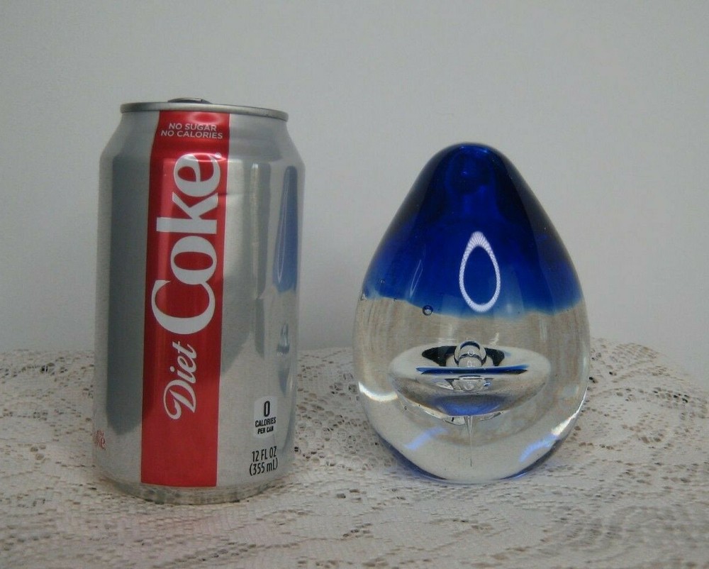 This beautiful studio art glass egg paperweight is a unique addition to any collection. Handmade with expert precision, this piece showcases a stunning cobalt blue drop of water, adding a pop of color to any space. The brand and country/region of manufacture are unknown, adding to the intrigue and mystery of this piece. The modified item aspect is not applicable, as this paperweight is a one-of-a-kind creation. Perfect for collectors of paperweights or decorative art, this item is sure to be a conversation starter. The blue color is striking and will complement any decor. Don't miss out on adding this piece to your collection!