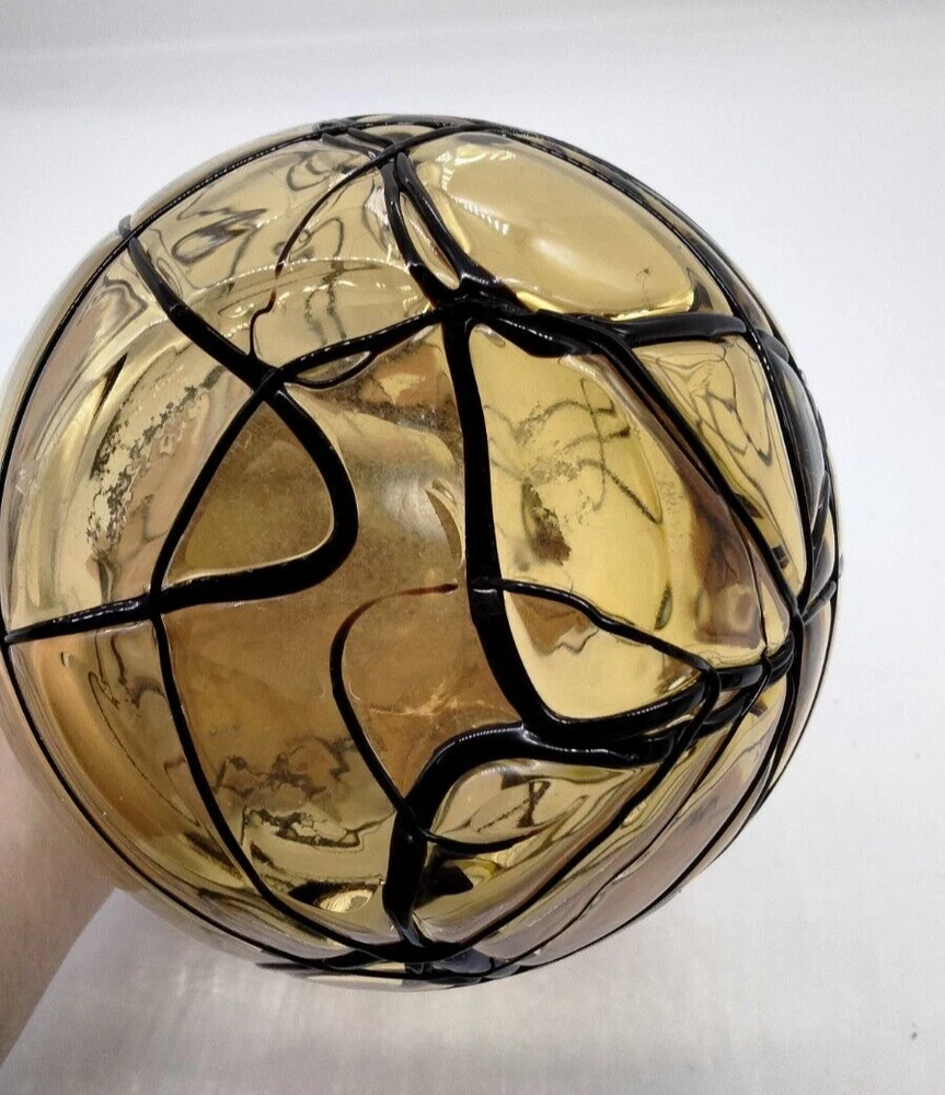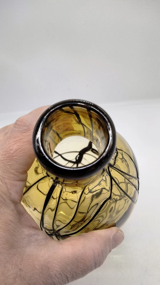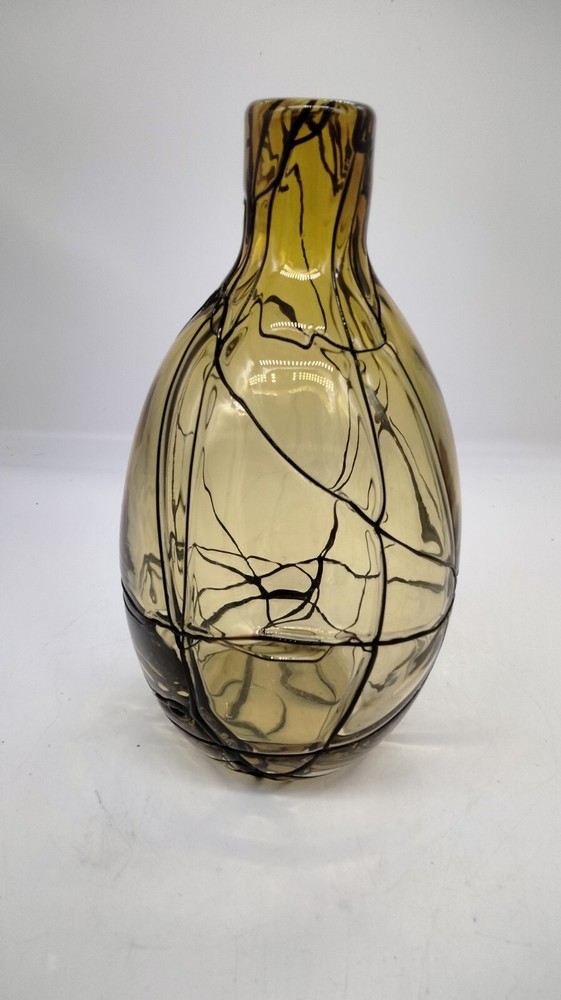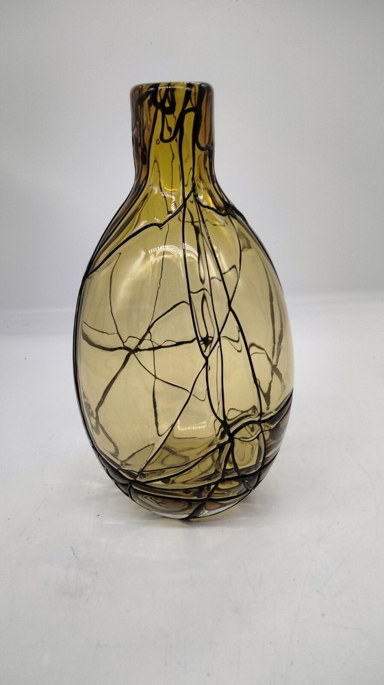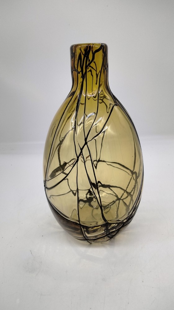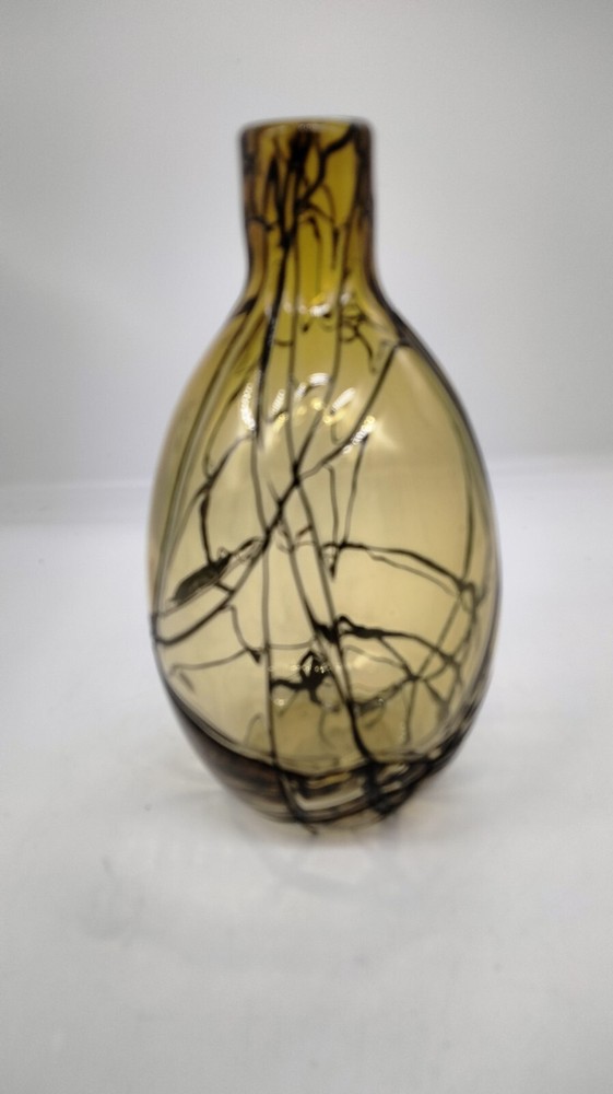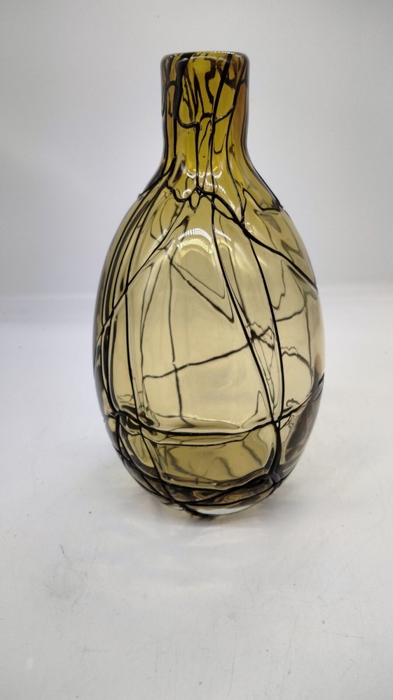 Studio Art Glass Hand Blown Bottle Shaped Amber Vase with Abstract Black Threading. This is 8.5 inches tall, and 5 inches in diameter. Nice solid heavy glass. Smokey amber color. This is preowned, No Chips cracks or flea bites. The Threading is intact all over vase. Has a smooth polished pontil. Unsigned. No Hard water staining. Excellent condition. Ships USPS, UPS or Fed Ex domestically and eBay International Shipping globally