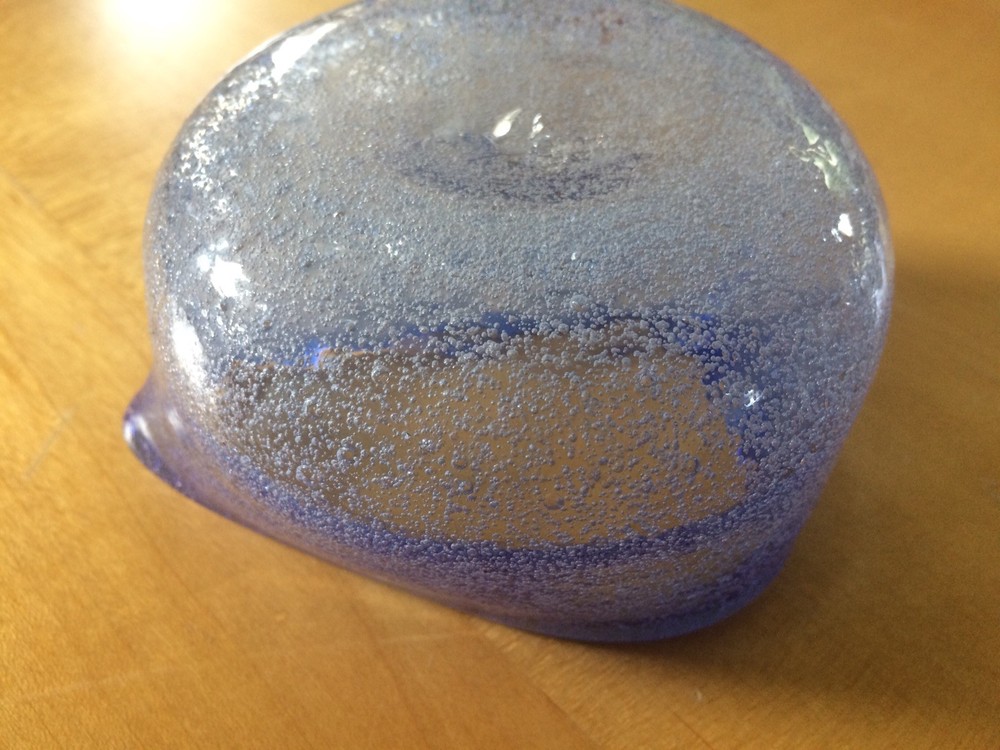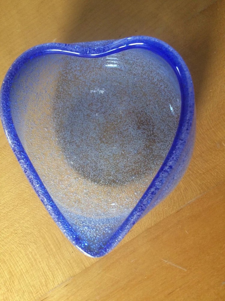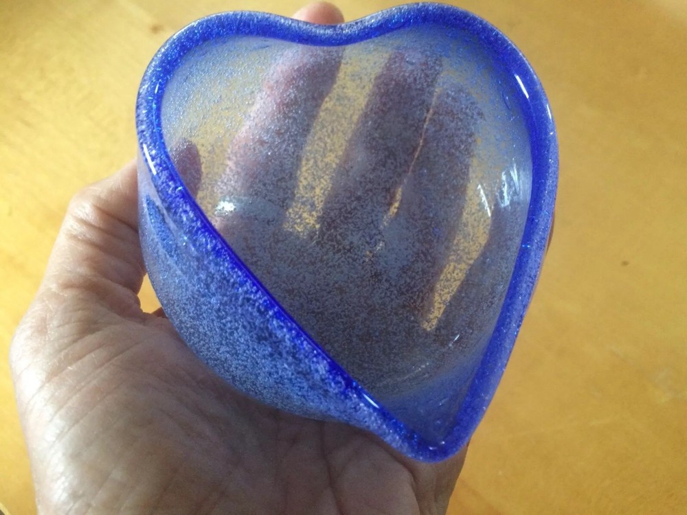 This beautiful piece of handmade glass is unsigned but the skill of the maker is evident in the symmetrical heart shape and gorgeous graduated color design. The fine bubbles throughout the interior give it a milky look. Dimensions are approximately 2" x 3.75" x 3.5". The point of the heart forms a spout so this piece could be used as a small pitcher, a trinket dish, or simply display it with your art glass collection. Beautiful condition; it looks brand new.