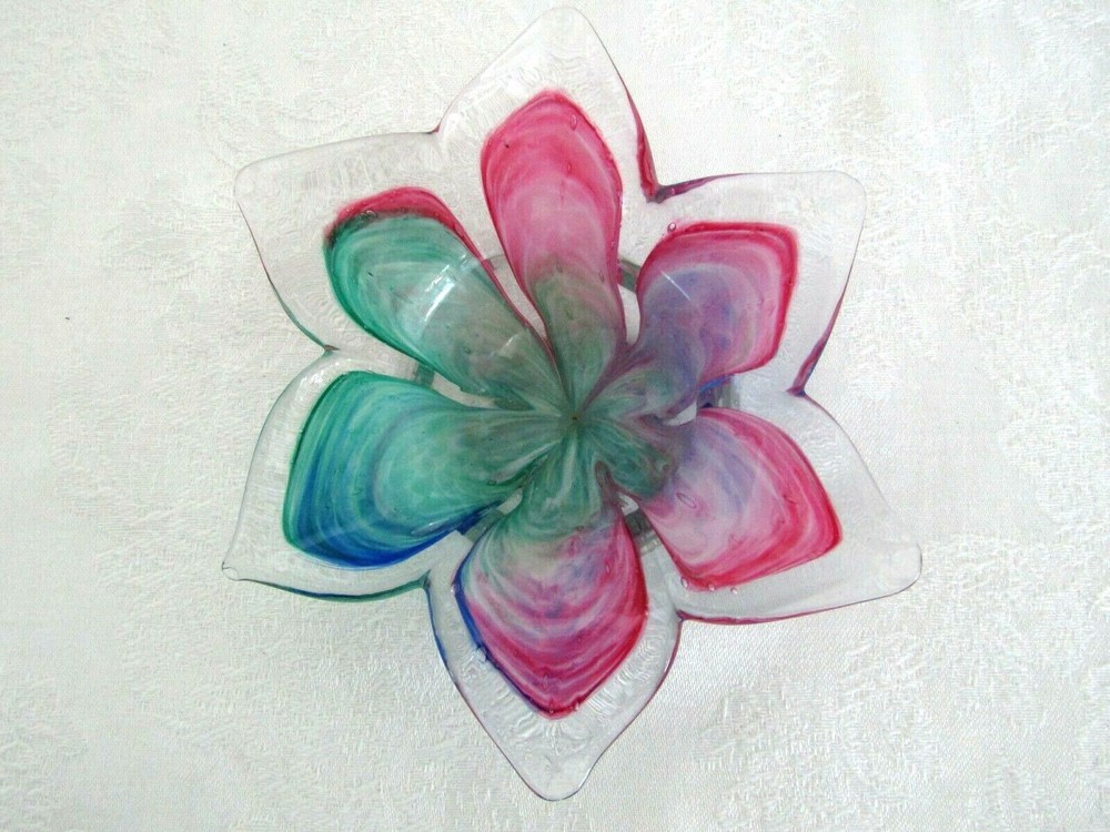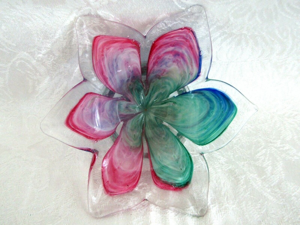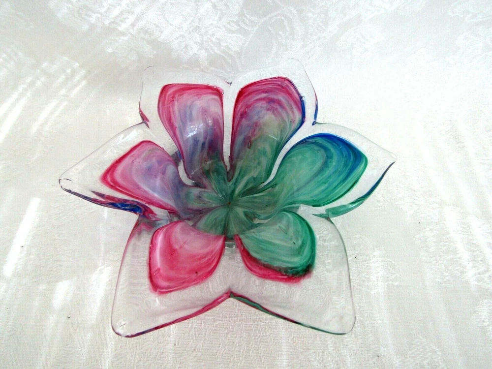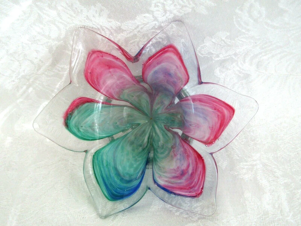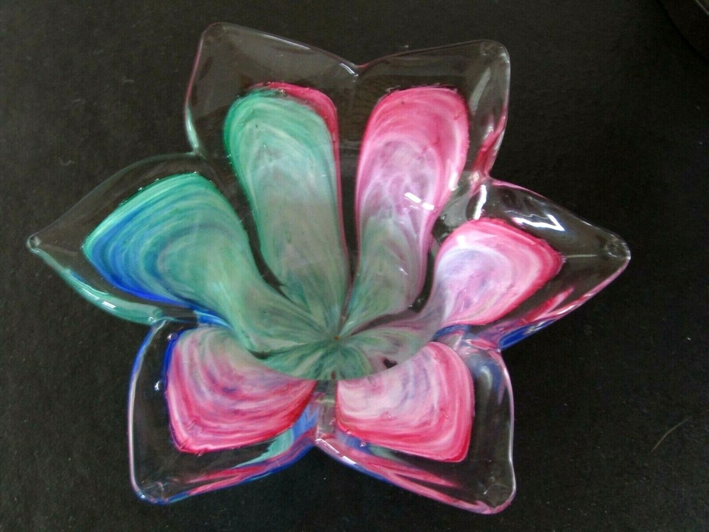Pretty hand-blown glass bowl/dish in the shape of a flower. The petals vary in color. Colors include shades of red, blue & greens. The dish/bowl measures approx. 6" wide (from tip of petal to tip of petal) x 1-3/4" tall. It's in excellent condition.