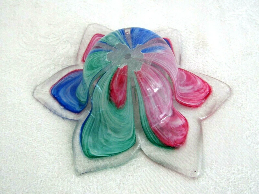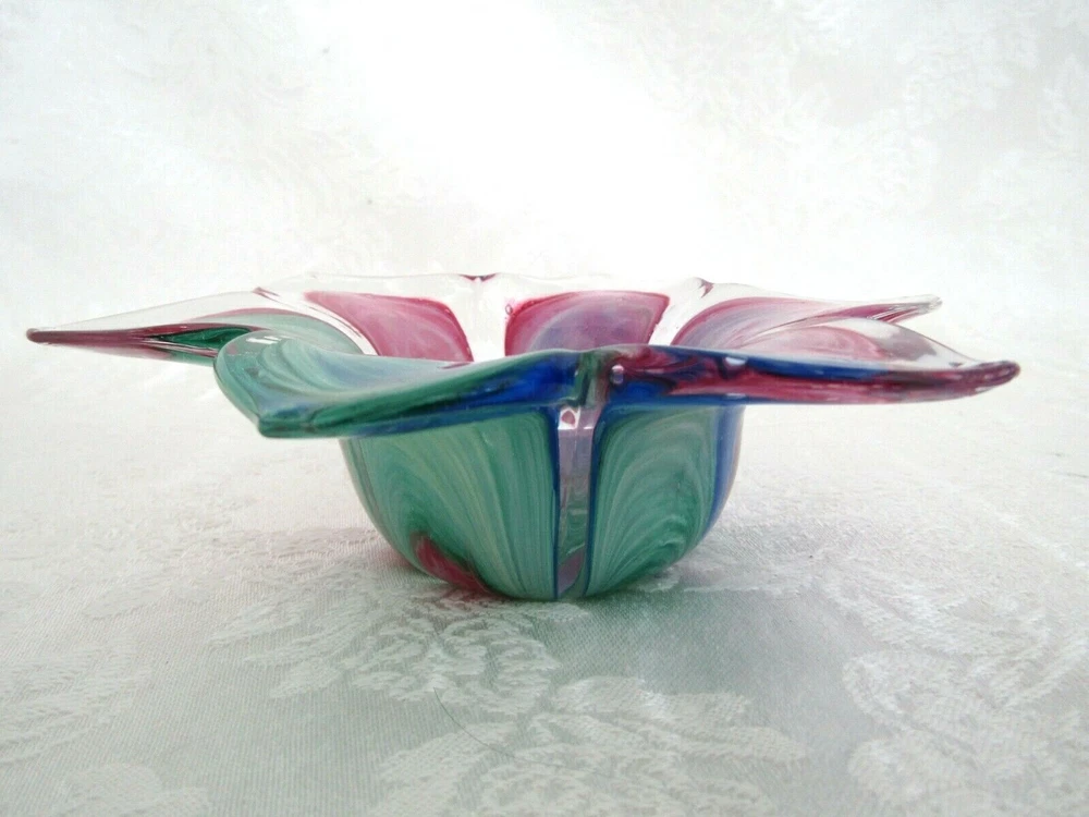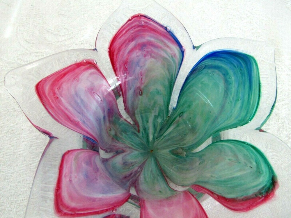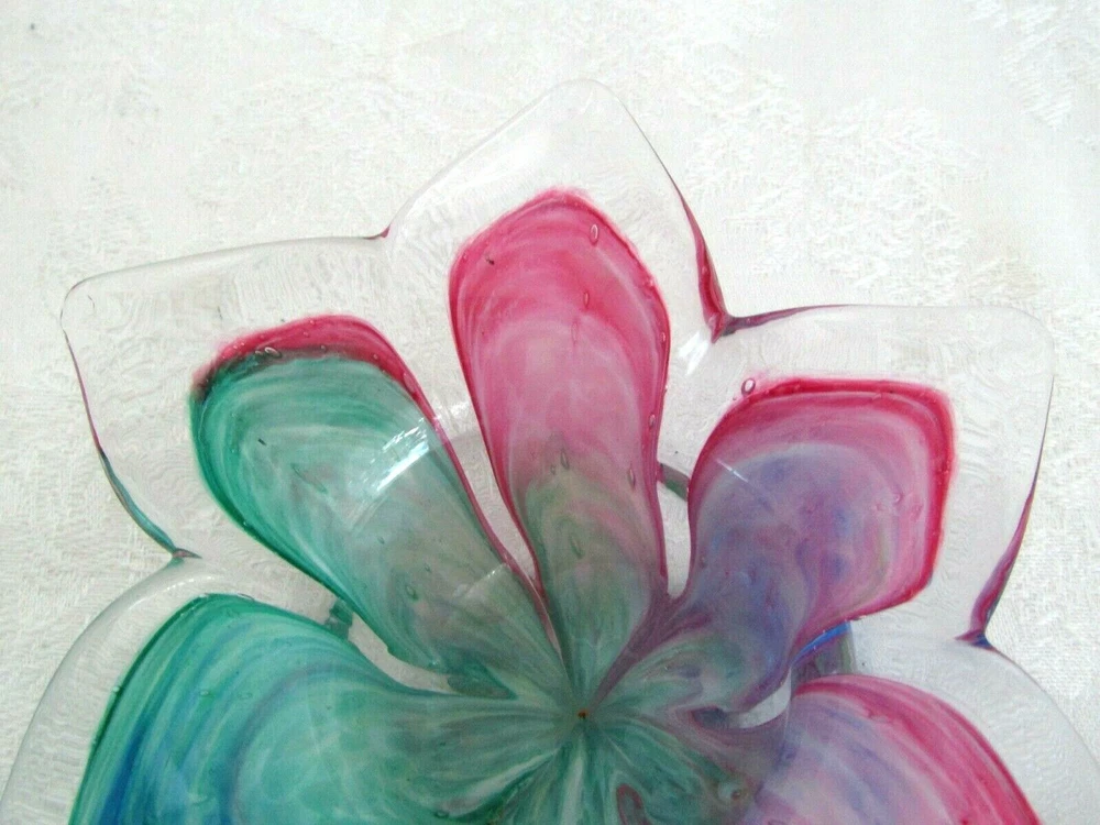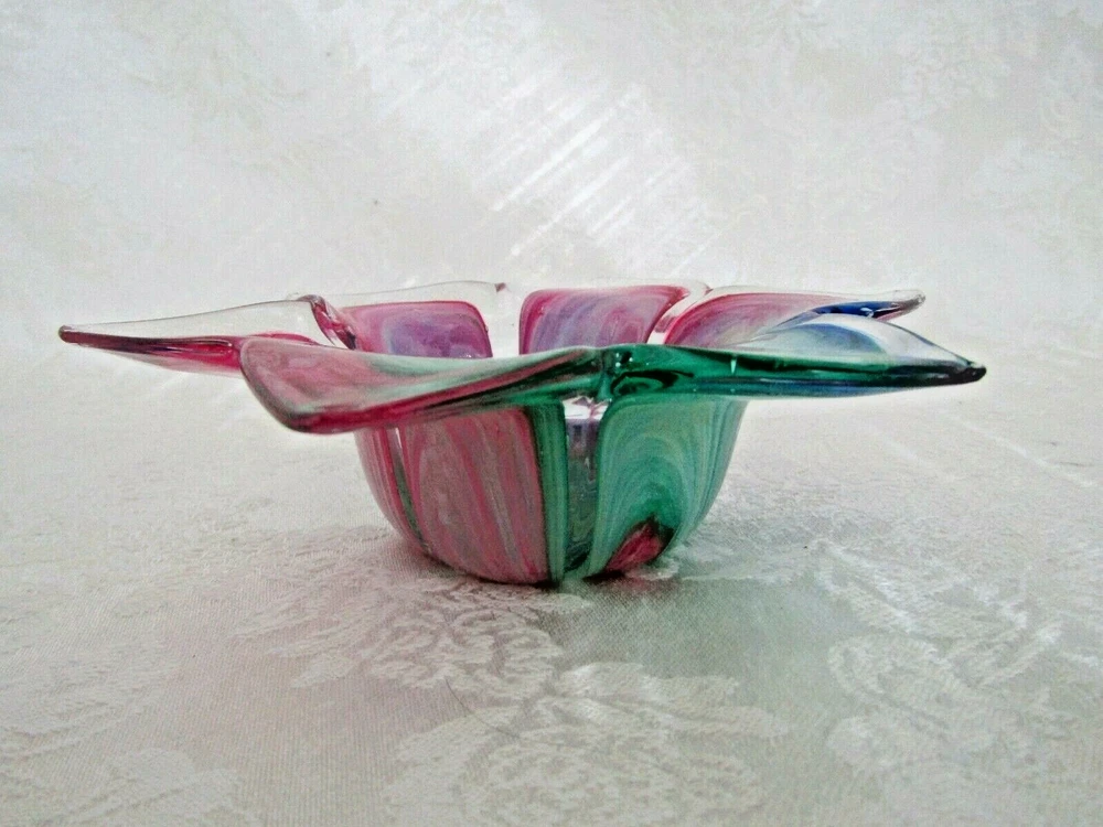 Pretty hand-blown glass bowl/dish in the shape of a flower. The petals vary in color. Colors include shades of red, blue & greens. The dish/bowl measures approx. 6" wide (from tip of petal to tip of petal) x 1-3/4" tall. It's in excellent condition.