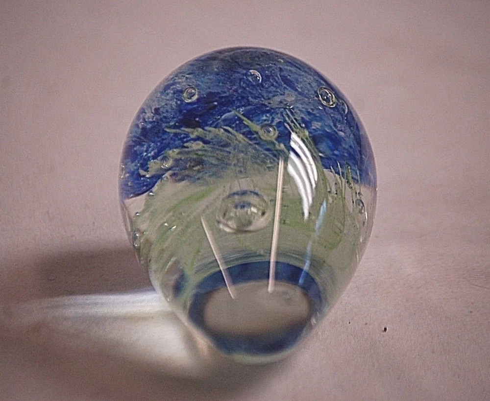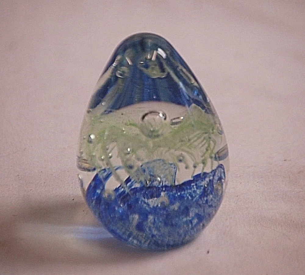 Old Vintage Studio Art Glass Paperweight Blue Waves with Light Green Flower Oblong Shaped with Controlled Bubbles Approx. 4" Tall Sorry no returns! Please check out our other listings!...