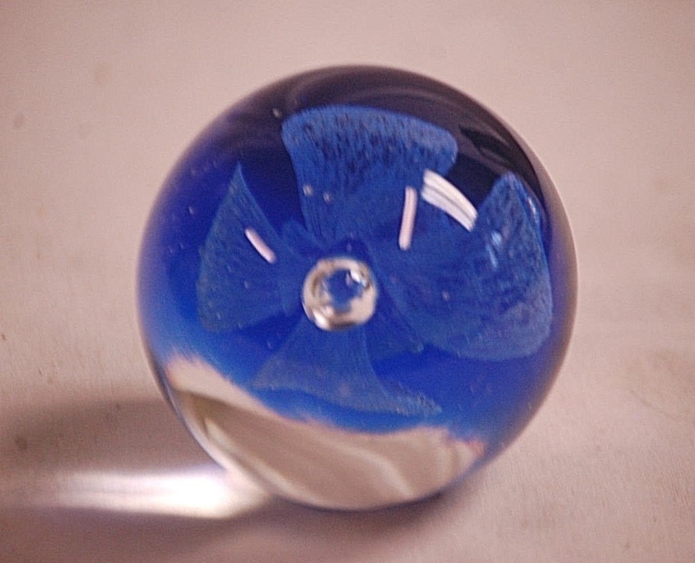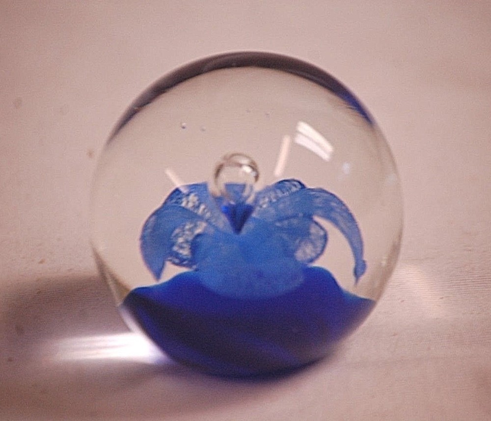Old Vintage Studio Art Glass Paperweight Clear with Cobalt Blue Flower Sphere Shaped with Controlled Bubbles Approx. 2-1/2" Diameter Please check out our other listings!...