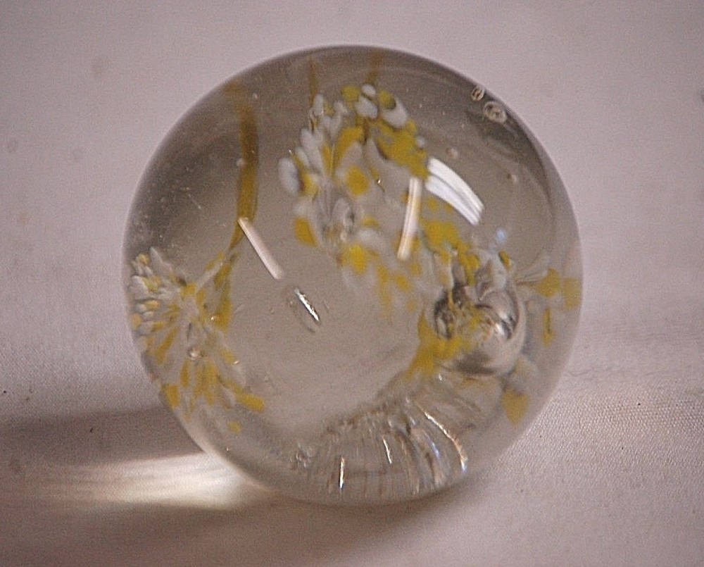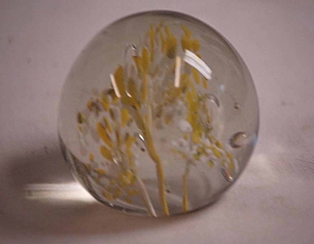 Old Vintage Studio Art Glass Paperweight Clear with Yellow & White Flowers Sphere Shaped with Controlled Bubbles Approx. 2-1/4" Diameter Please check out our other listings!...