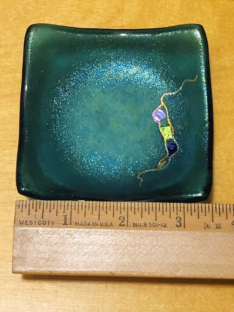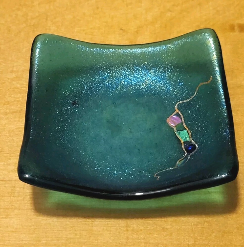 This beautiful Studio Art Glass trinket dish handkercheif is artist signed. Beautiful color and fused materials. No chips or cracks....