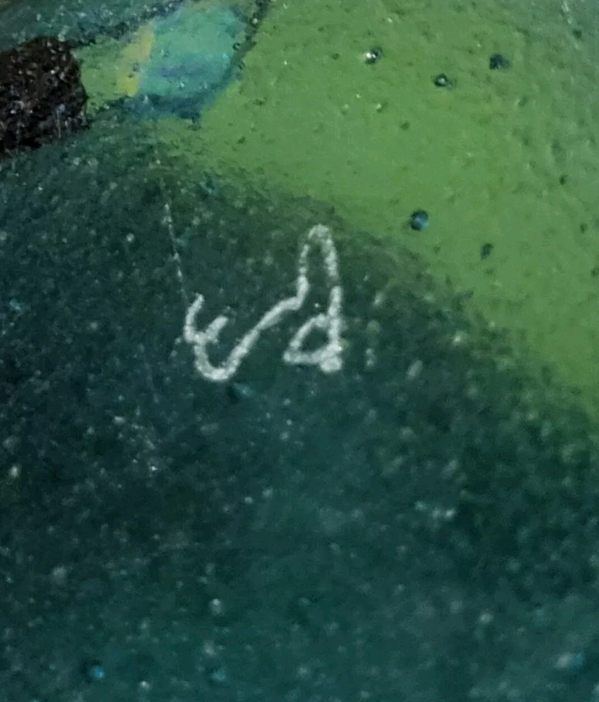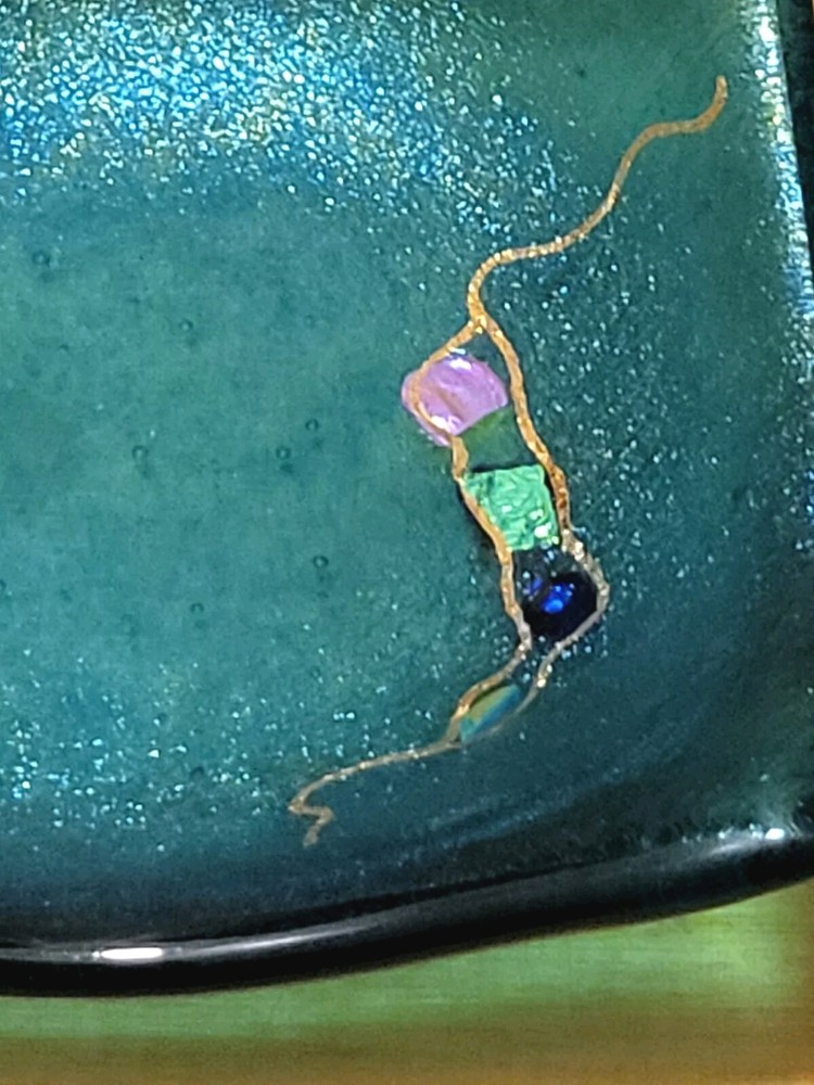 This beautiful Studio Art Glass trinket dish handkercheif is artist signed. Beautiful color and fused materials. No chips or cracks.