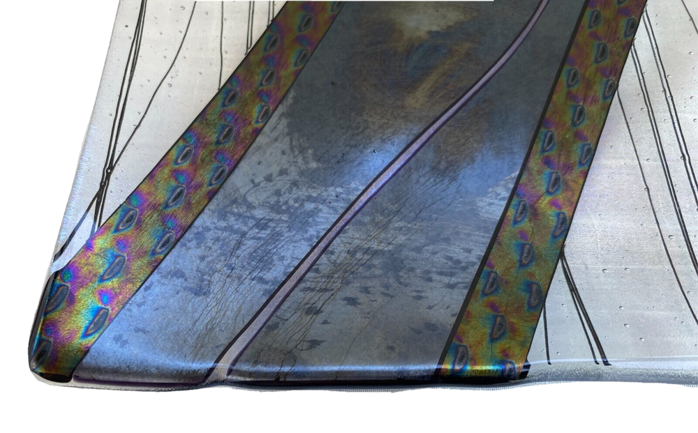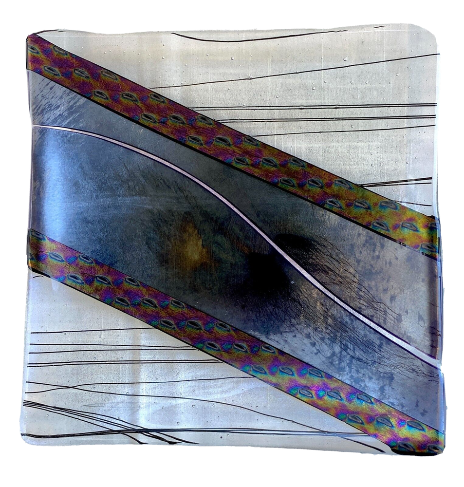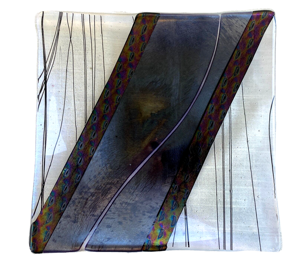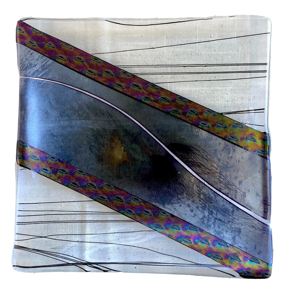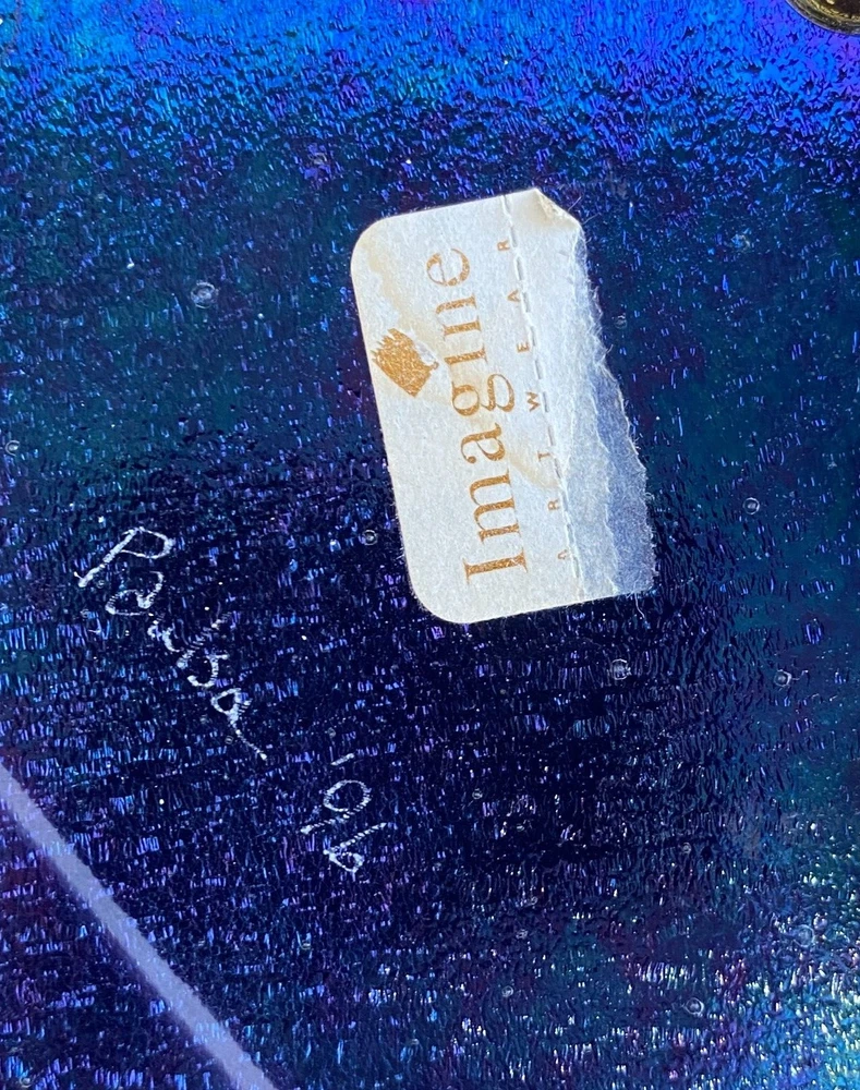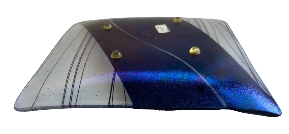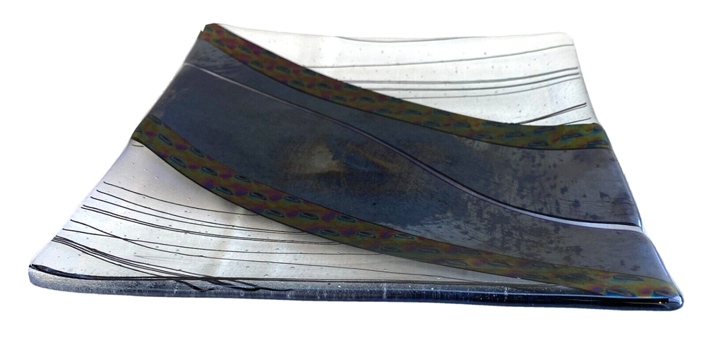 Available is a Studio Art Hand Created Glass Tray/Dish - Signed with what looks to me like 'Pauba,' dated 1996 and with a sticker for Imagine Artwear. The dish measures 9-1/4 inches by 9-1/4 inches and 3/4 inch deep. This piece is hand painted so it is for decoration only and not food serving.