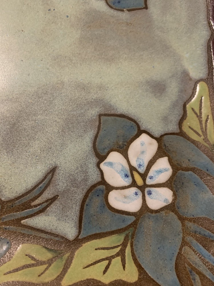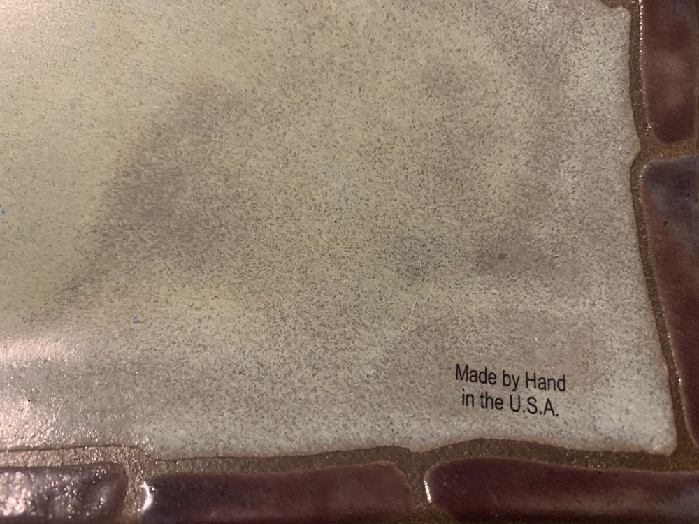 This beautiful platter was made in the USA, hand crafted and painted. It is signed but I couldn’t find the artist. It measures 12 inches across. It weighs approximately 4 pounds. In great condition