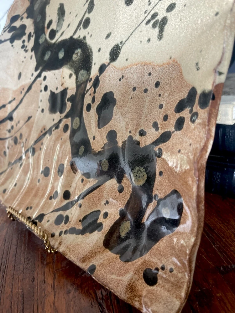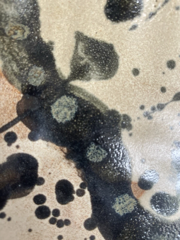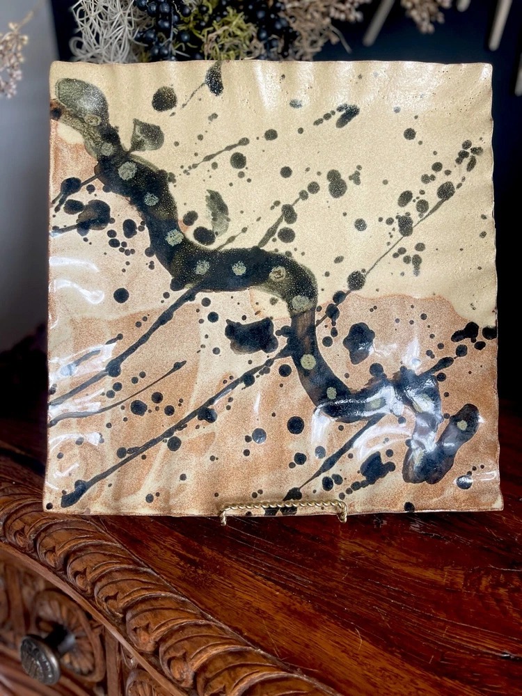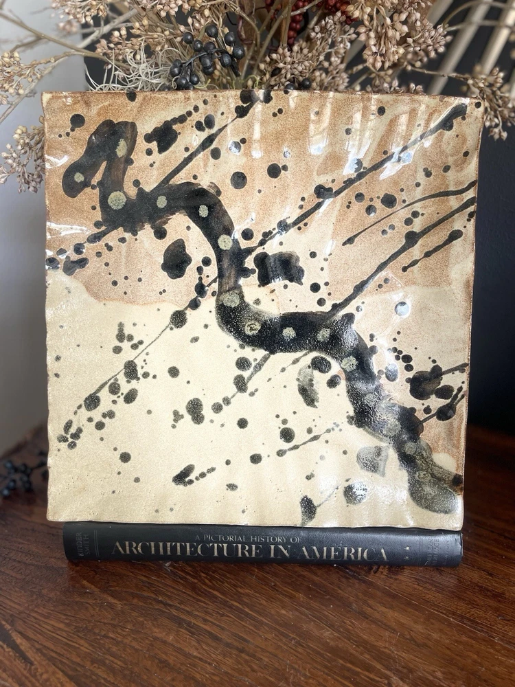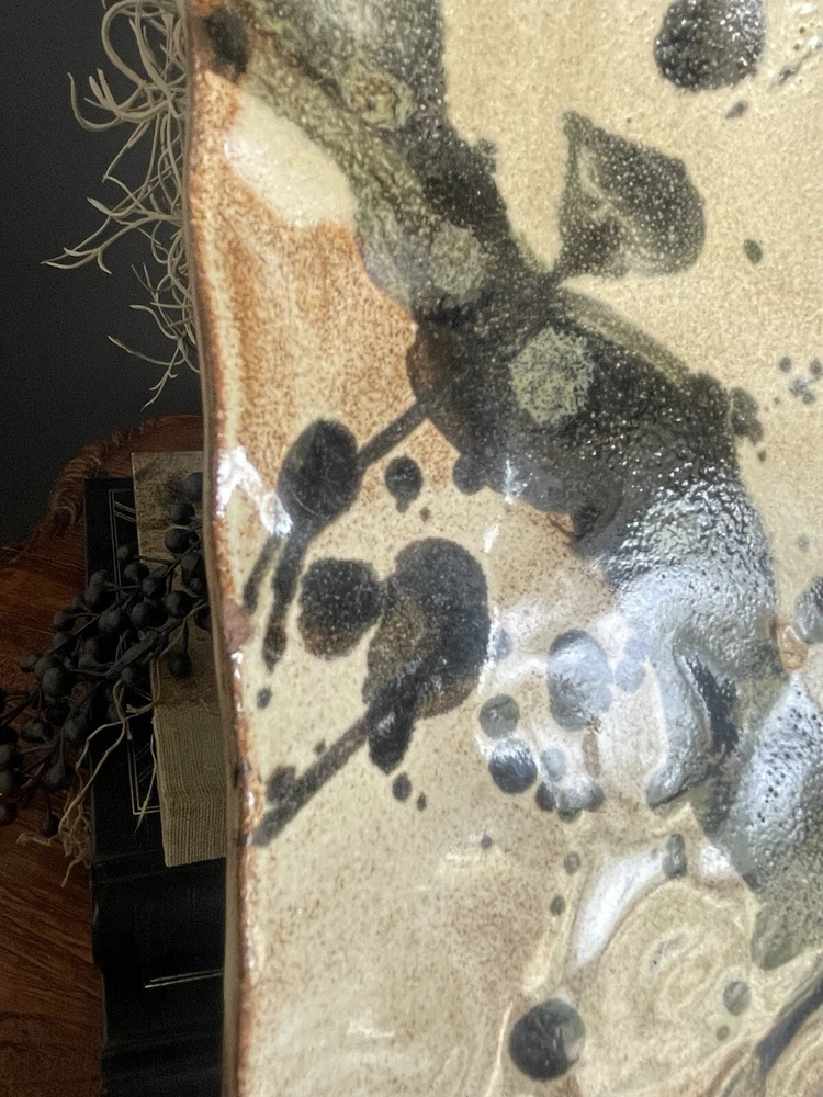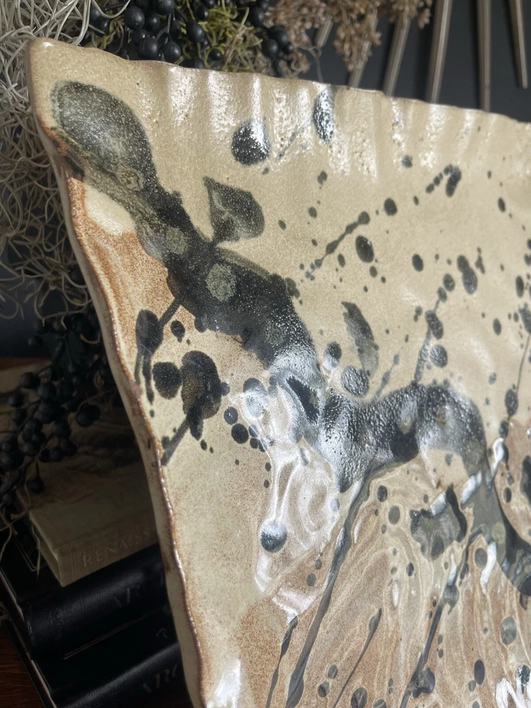 Studio Art at its finest. Square Fluted heavy platter with a Jackson Pollock-like pattern. This piece is done in a soothing color pallet of Beige, Tan, Grey, Black/Navy and Moss Green. There are a few small pencil-tip- sized round specs sporadically along ruffled rim where it appears finish didn’t take vs appearing as a nick… please see photos. Length: 13” Width: 12” Depth: 1.5” Weight: 5 lbs Thank You For Your Interest in What We Love! Please check out our other treasures as inventory is always changing! ~~~~~~ Most of our items are pre-loved, Vintage or may be from an auction or estate sale. We are not considered experts on these items and the descriptions are based on our best knowledge, experience, and research. Statements in regard to maker, age, or origin, particularly on unmarked pieces, should be evaluated and confirmed by the Buyer. All items are sold “as is” and all sales are final. We do not look at items under a microscope, but do the best we can to describe them. We list and photograph any imperfections we see as honestly as we can, but we may miss something from time to time. With the exception of clothing, we do not thoroughly clean our items to prevent damage or loss of value to the item for the buyer. If available, we may include a disclosed stock photo (for comparison) with current photos/info of item. This will inform Buyer and should expedite independent due diligence with reassurance that item is exactly as pictured and noted to the best of Sellers knowledge. Please see all photos as they are part of the description and… feel free to reach out with any questions you may have. You’re Appreciated and Thank You for Stopping By and Sharing Our Love of Beautiful Treasures!! Check Back Often as Inventory is Growing and Ever Changing!