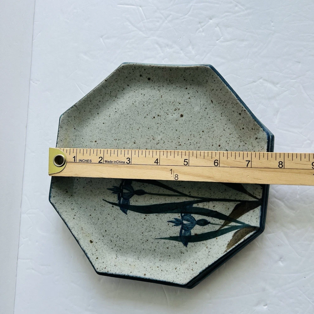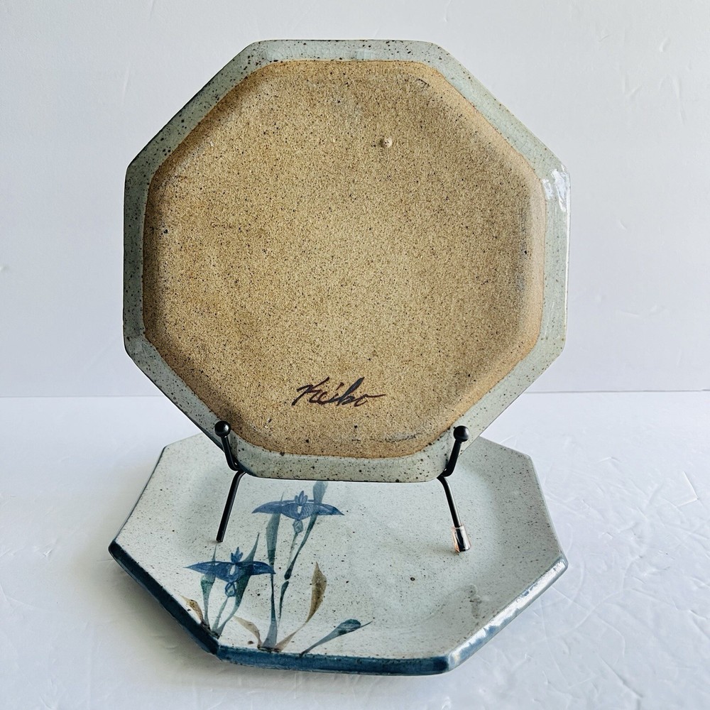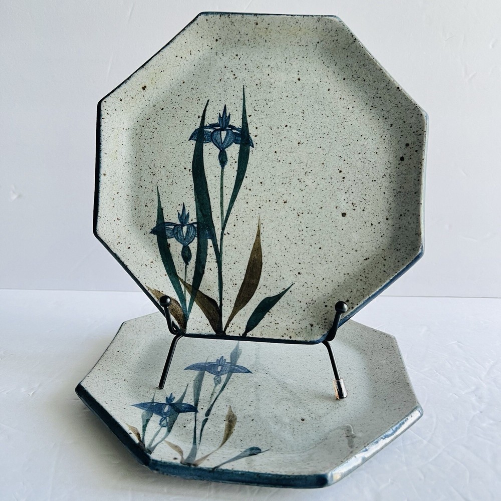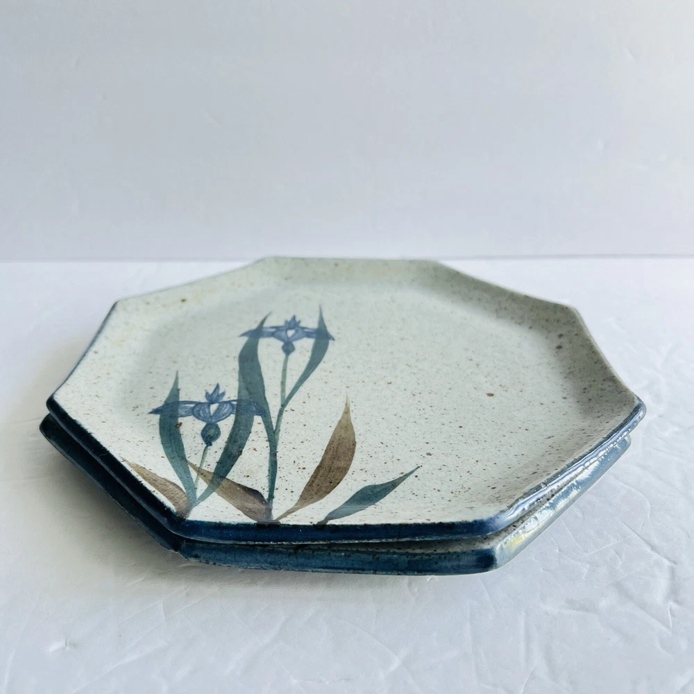 Studio Art Pottery Set Of 2 Plates with Blue Floral Design Octagon Shaped Signed READ Used Condition. There are some scratches, crazing, and a chip, which you can see in the pictures. Please SEE pictures for measurements and details. Thank you
