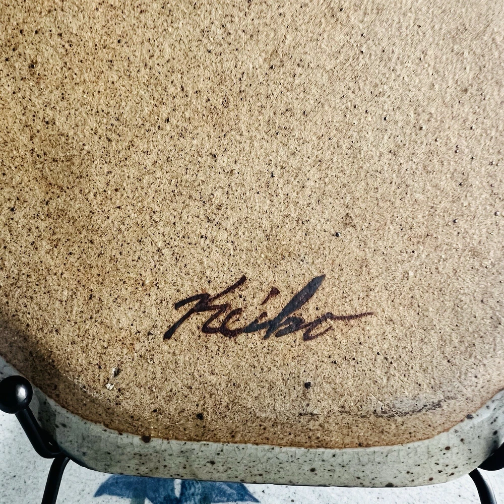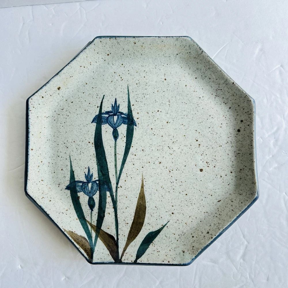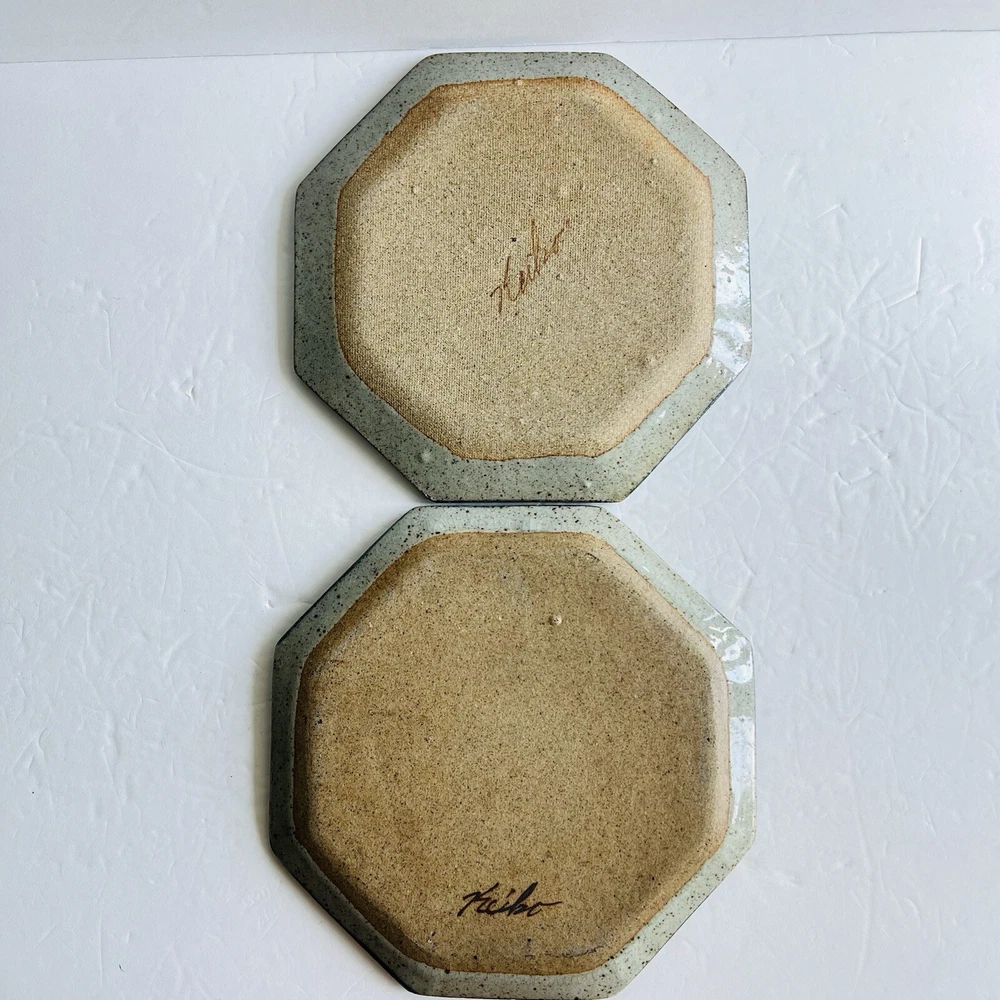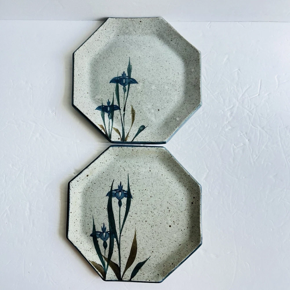 Studio Art Pottery Set Of 2 Plates with Blue Floral Design Octagon Shaped Signed READ Used Condition. There are some scratches, crazing, and a chip, which you can see in the pictures. Please SEE pictures for measurements and details. Thank you