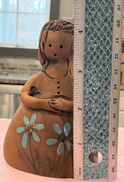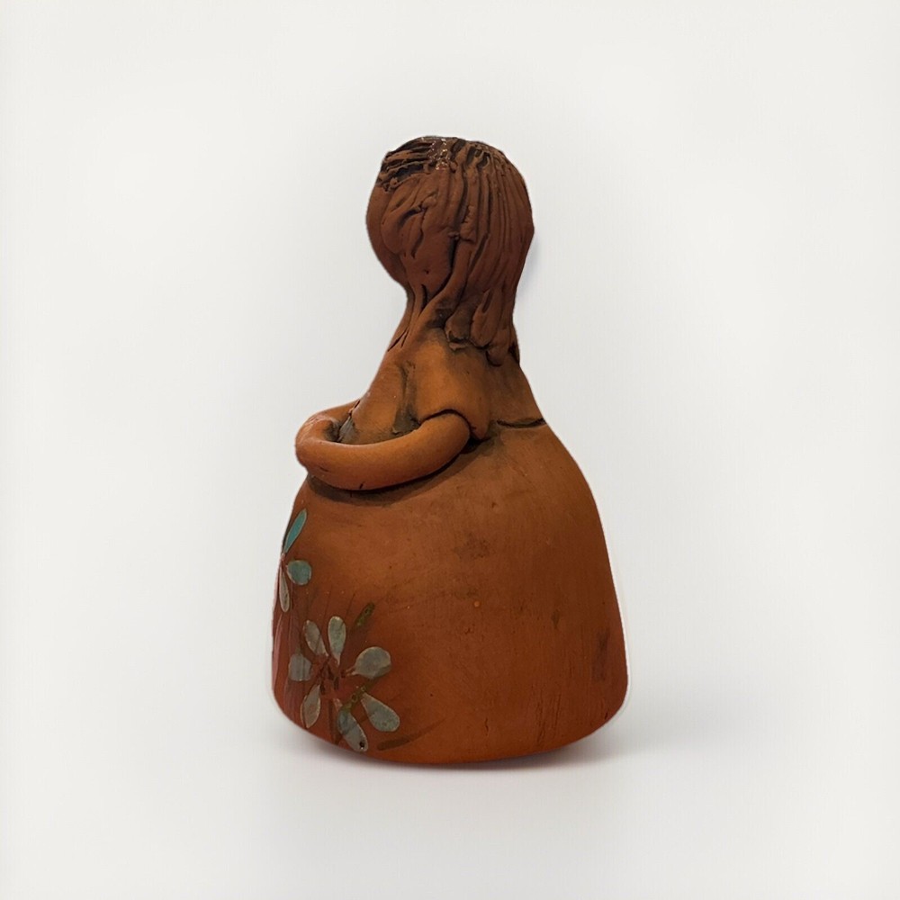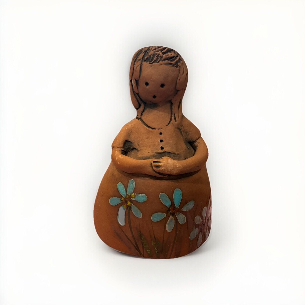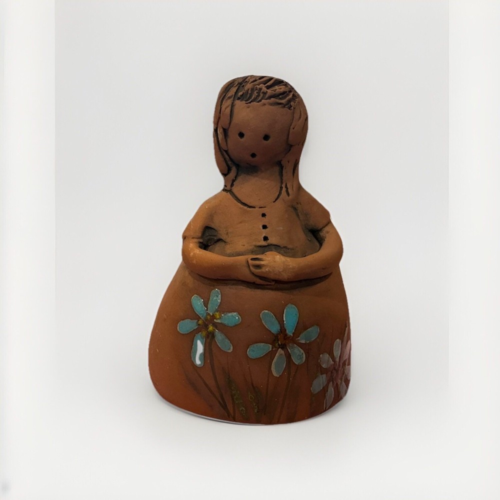 This studio art pottery piece features a bell-shaped girl with glazed blue flowers. The piece is signed by the artist and is handmade. The material used is clay and the finish is partial glaze. The vintage piece is an original art pottery piece and is studio crafted.This adorable little girl is perfect for collectors of unique and artisanal pottery. Signed “Nelly”. It is in beautiful condition. It measures 4.5” tall and 3” wide at the bottom of her skirt.