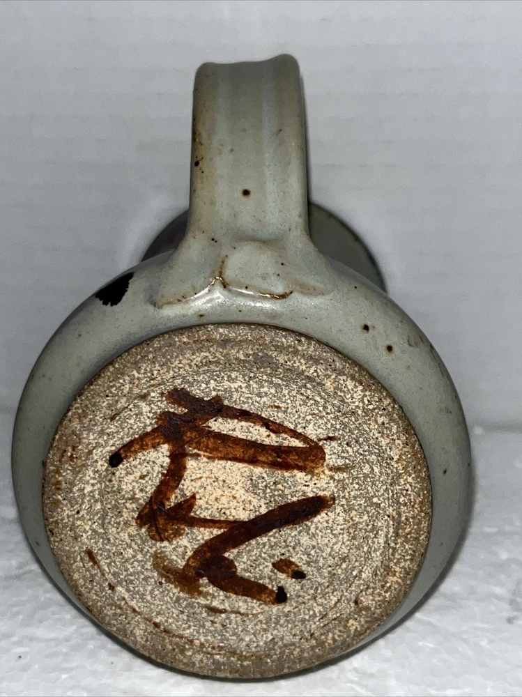 Studio Art Pottery Blue Grey Brown Mug Vase Shaped Glaze Signed R L 14 ounces.