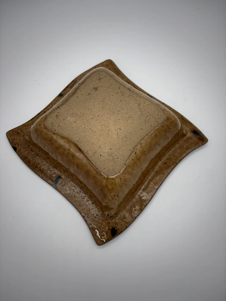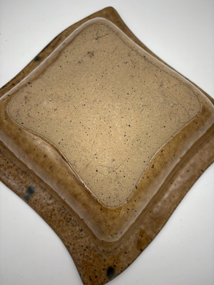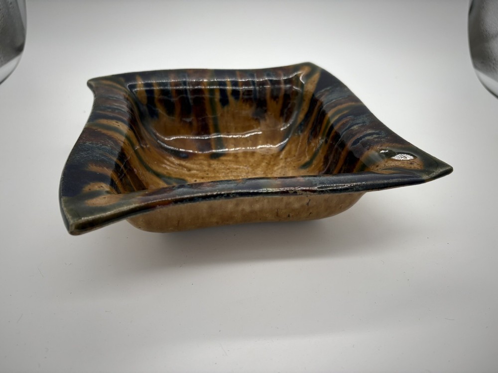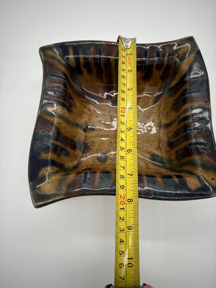 This Studio Art Pottery Bowl features a unique square shape with a purple drip glaze design. It is hand-painted and signed by the artist Rita M. The bowl is made of stoneware and is ideal for all occasions. With a contemporary style and abstract theme, this handmade piece is a one-of-a-kind addition to any collection of decorative cookware and serveware.