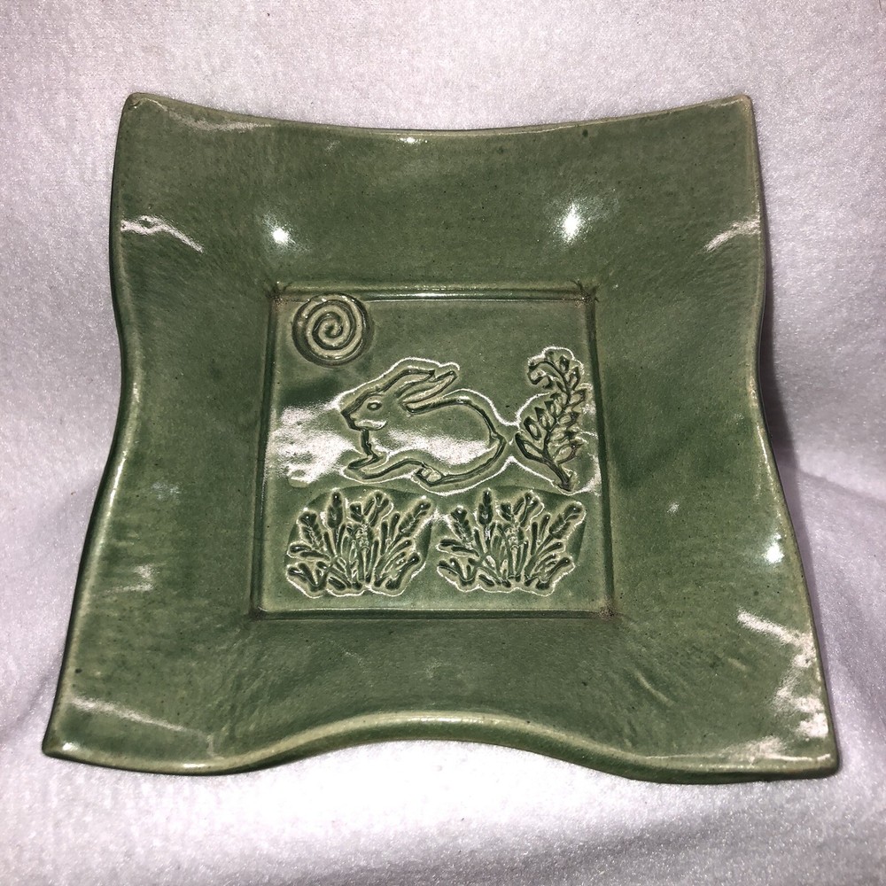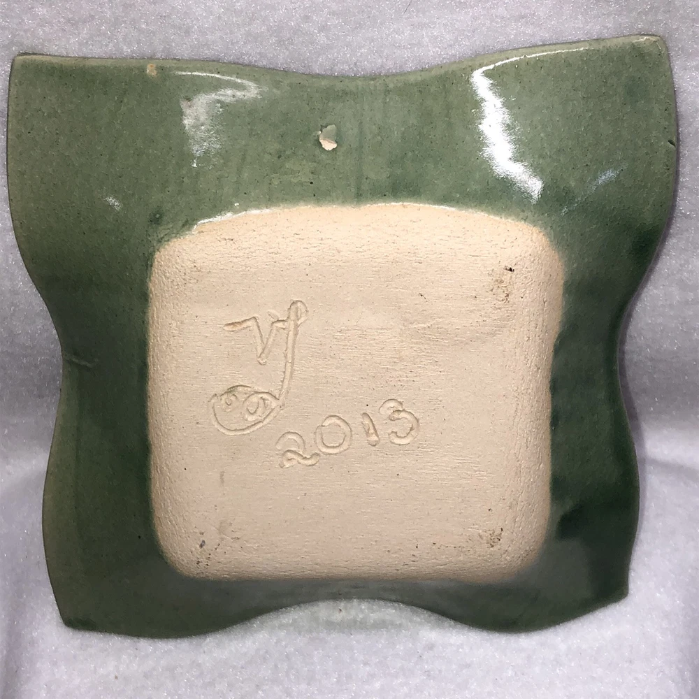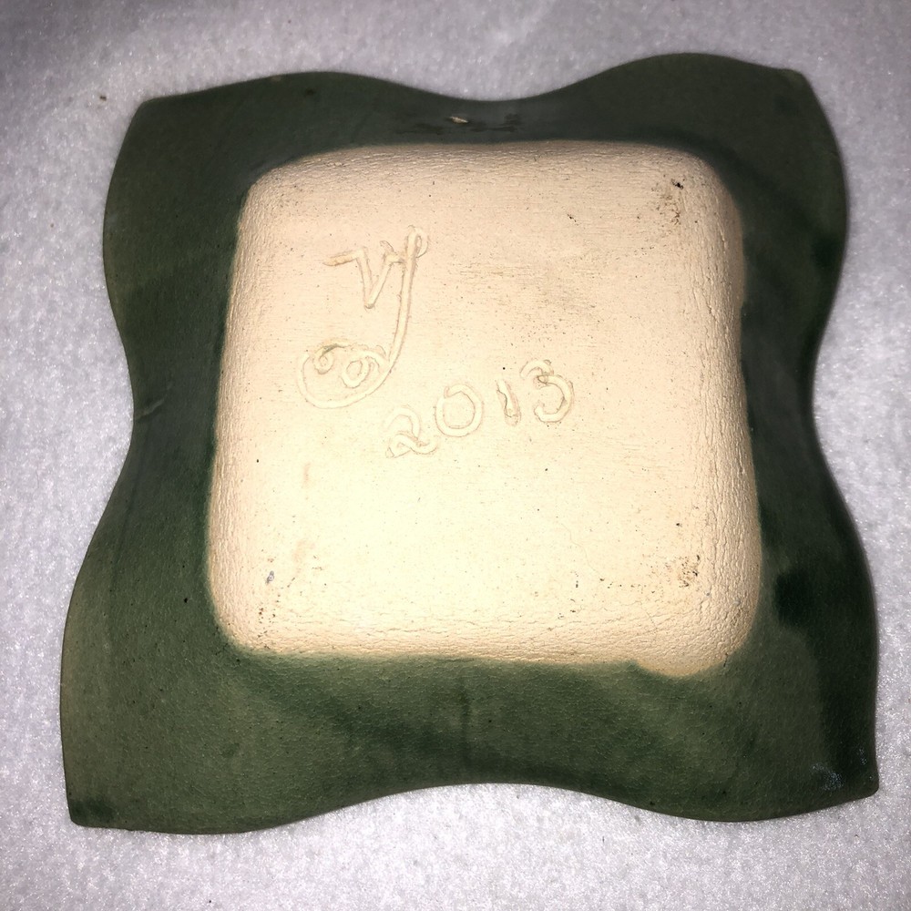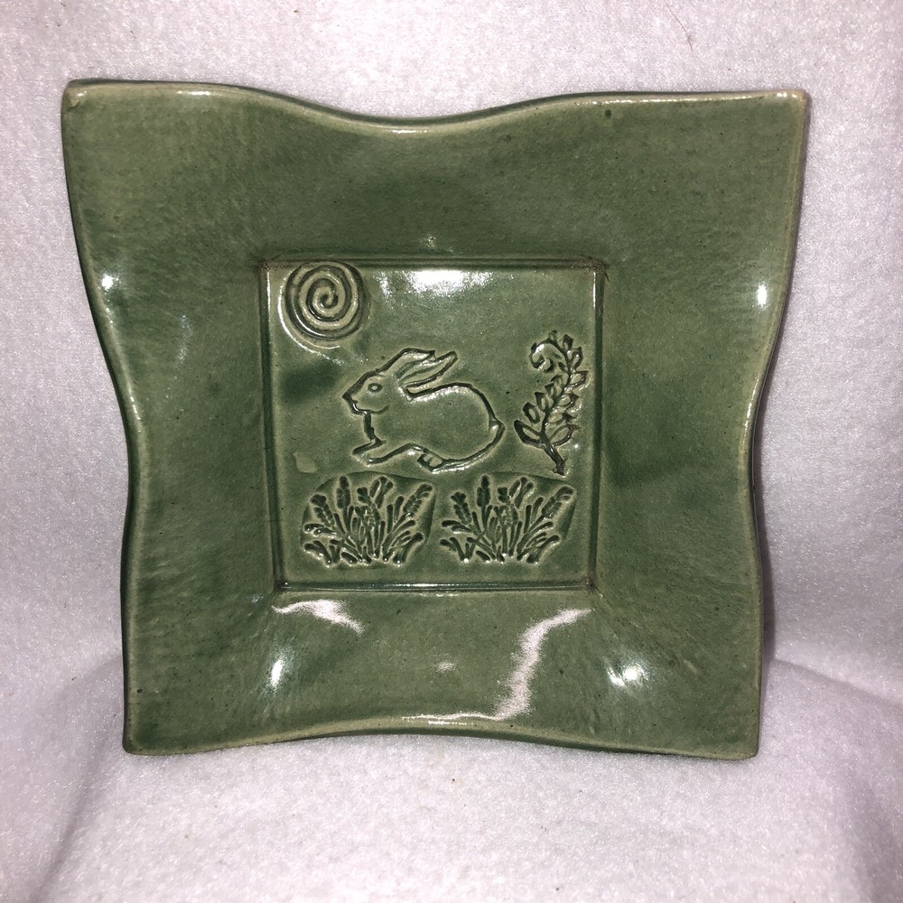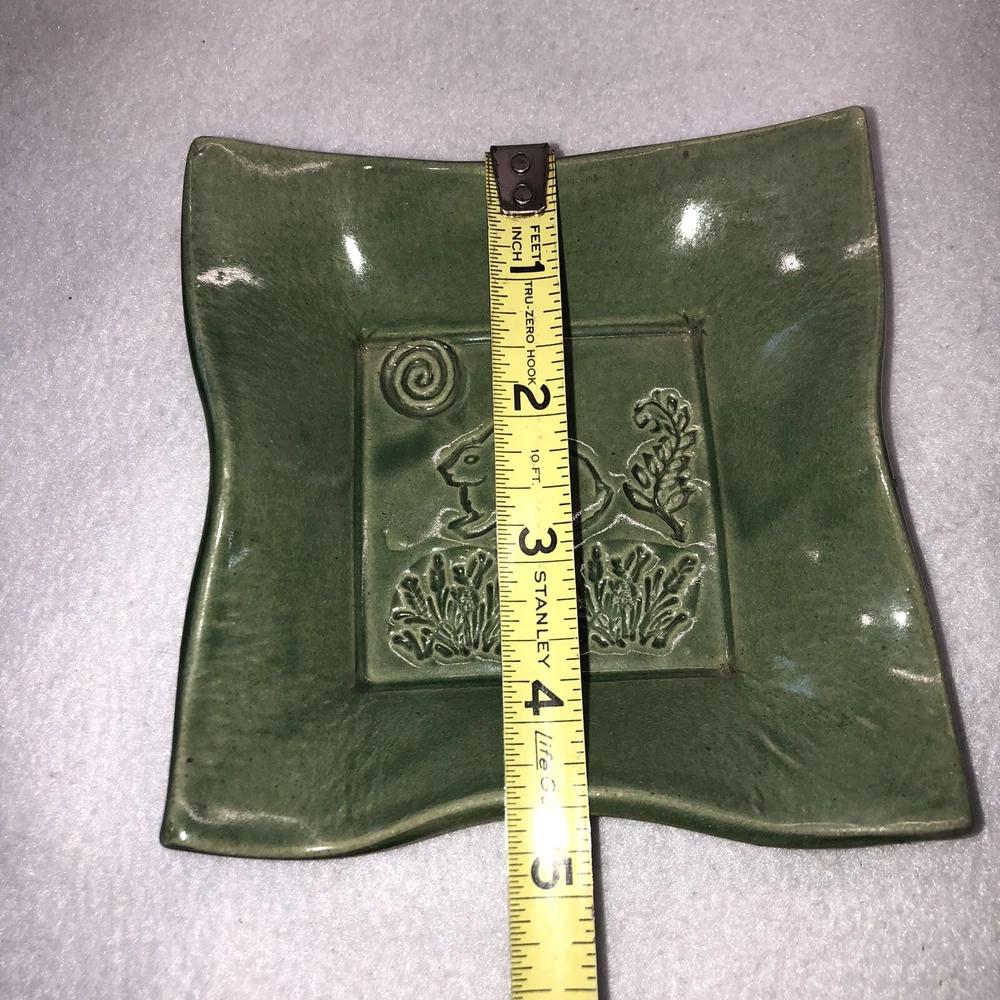 This is a sweet little square dish done in a green color that features impressed designs at the center. There is a round sun in the upper corner, a small bunny rabbit at the center and some shrubs/flowers under his feet and at his back. This piece is dated on the bottom 2013 and signed by it's artist. The signature appears to be a VL, VY or possibly a VJ? I was unable to locate any information about the artist. The dish measures approximately 4 7/8 inches square and is about 1 inch tall. Would be perfect for jelly beans, candy, rings and things, soap dish, etc. Dish is in good pre-owned condition. There are no nicks, chips, cracks or repairs. There is what appears to be a stilt mark on the back. Please see last photo for a close up of the mark. There also appears to be a small spot where the glaze was missed or was possibly an air bubble. It can also be seen in the last photo. Please review and enlarge all photos for additional details, views and measurements. Shipped via USPS Ground Advantage.