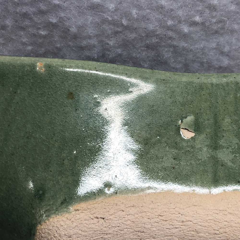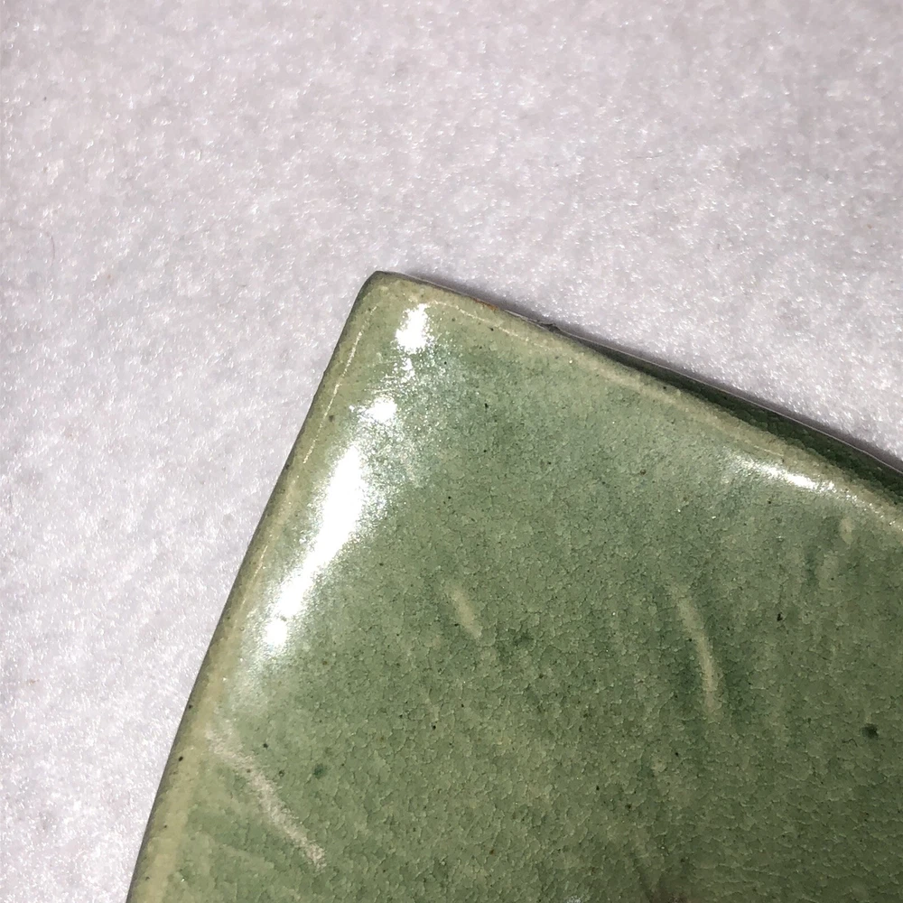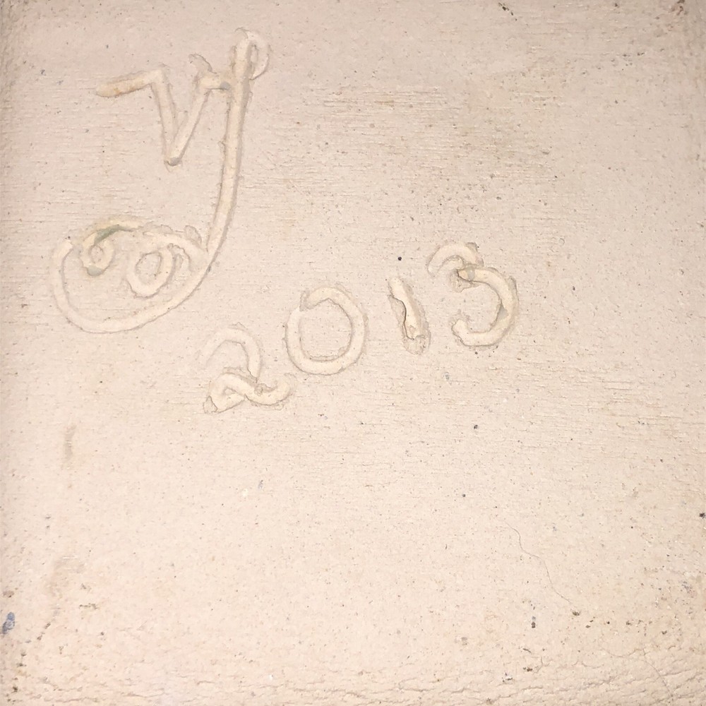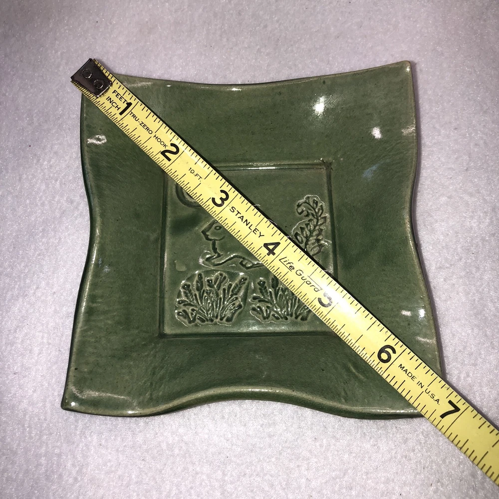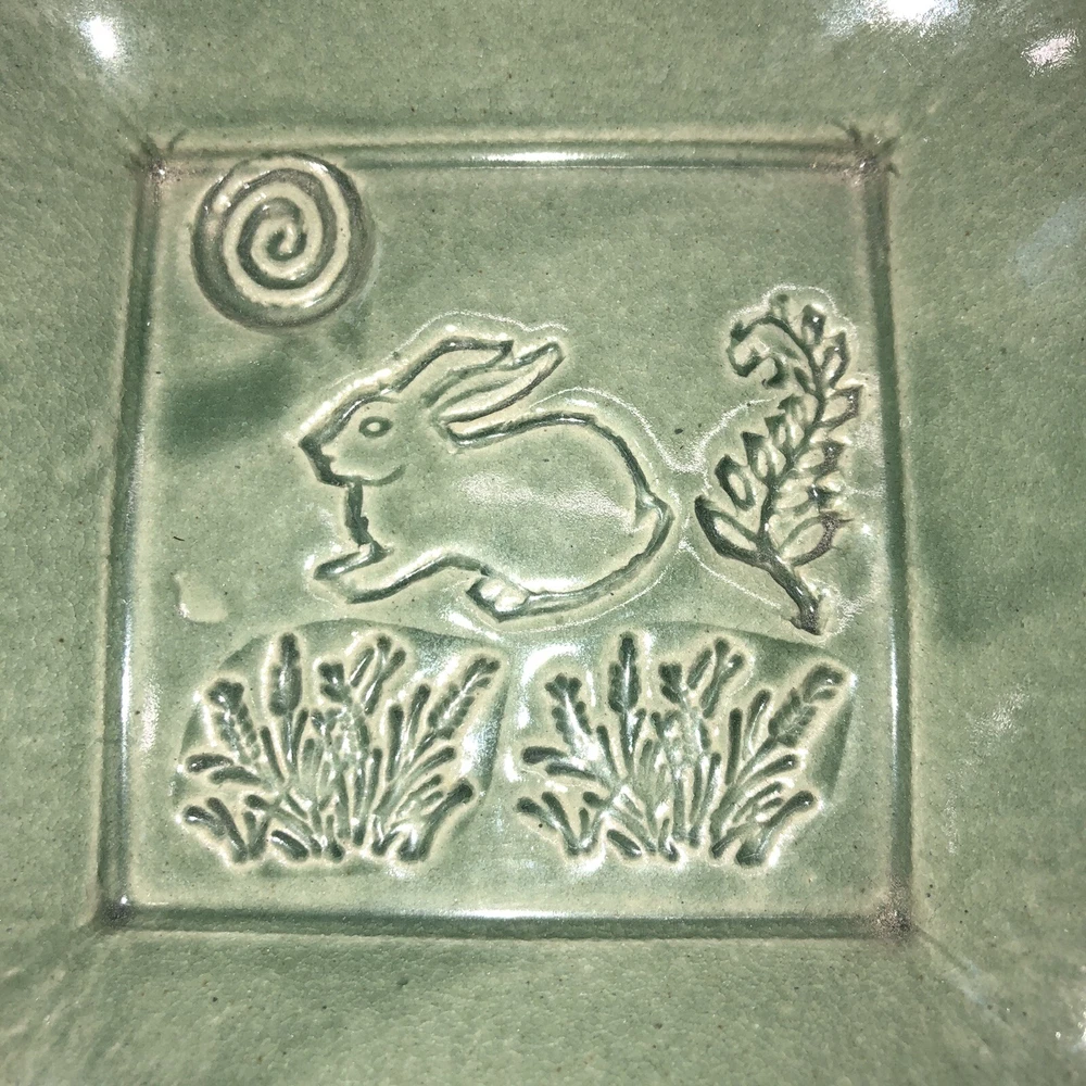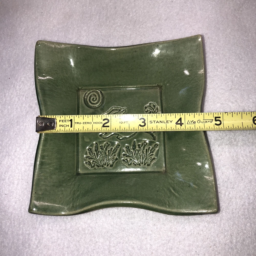 This is a sweet little square dish done in a green color that features impressed designs at the center. There is a round sun in the upper corner, a small bunny rabbit at the center and some shrubs/flowers under his feet and at his back. This piece is dated on the bottom 2013 and signed by it's artist. The signature appears to be a VL, VY or possibly a VJ? I was unable to locate any information about the artist. The dish measures approximately 4 7/8 inches square and is about 1 inch tall. Would be perfect for jelly beans, candy, rings and things, soap dish, etc. Dish is in good pre-owned condition. There are no nicks, chips, cracks or repairs. There is what appears to be a stilt mark on the back. Please see last photo for a close up of the mark. There also appears to be a small spot where the glaze was missed or was possibly an air bubble. It can also be seen in the last photo. Please review and enlarge all photos for additional details, views and measurements. Shipped via USPS Ground Advantage.