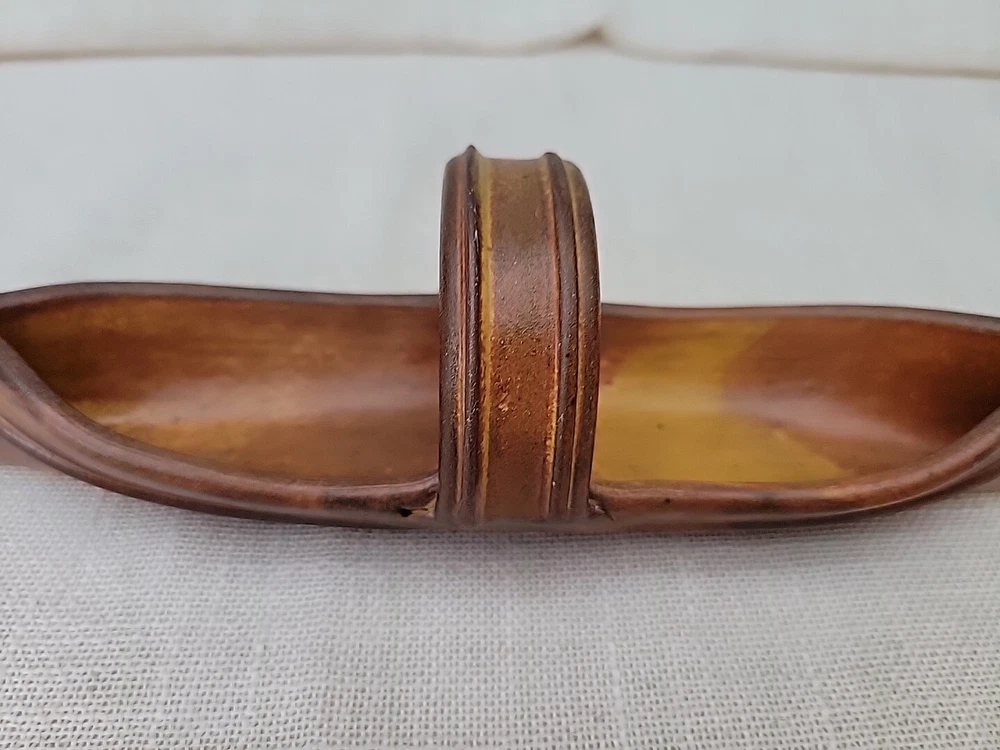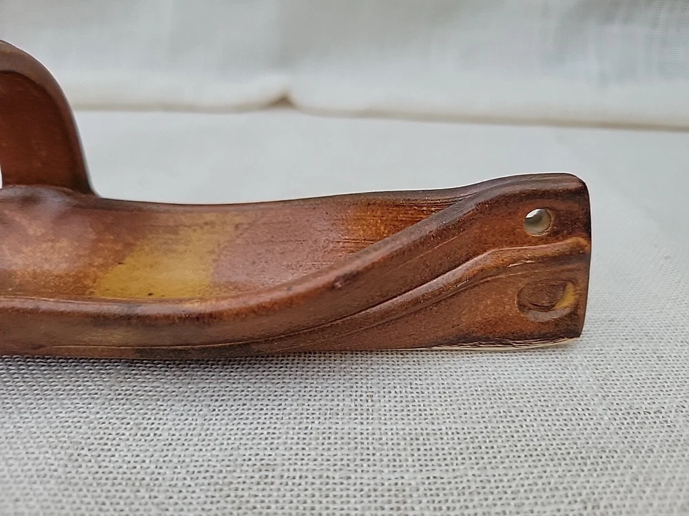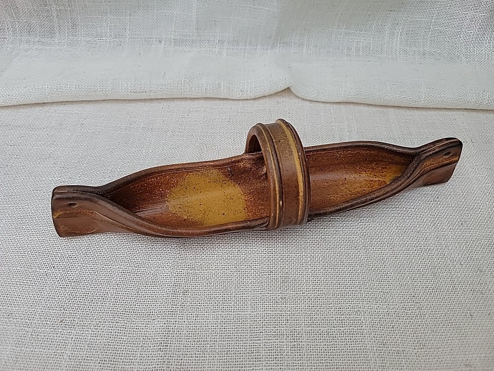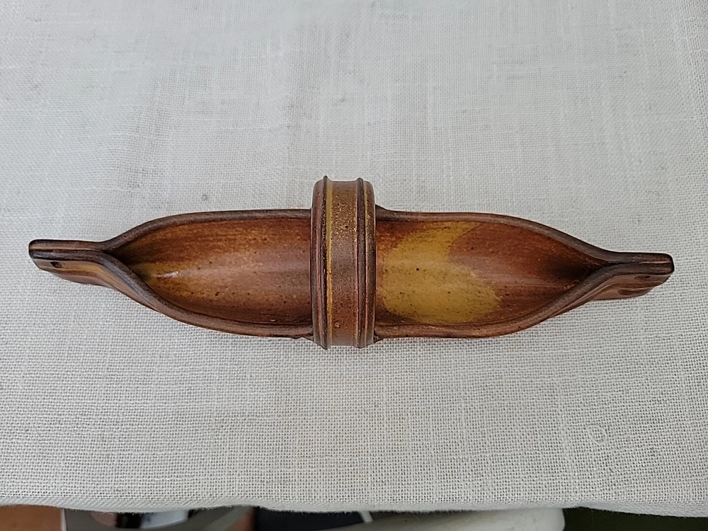 Very unique art pottery piece. Shaped like a canoe with a handle. Would be a cute trinket dish. Great condition, no chips or cracks. Signed and stamped. Questions welcome. Purchased items are packaged with care.