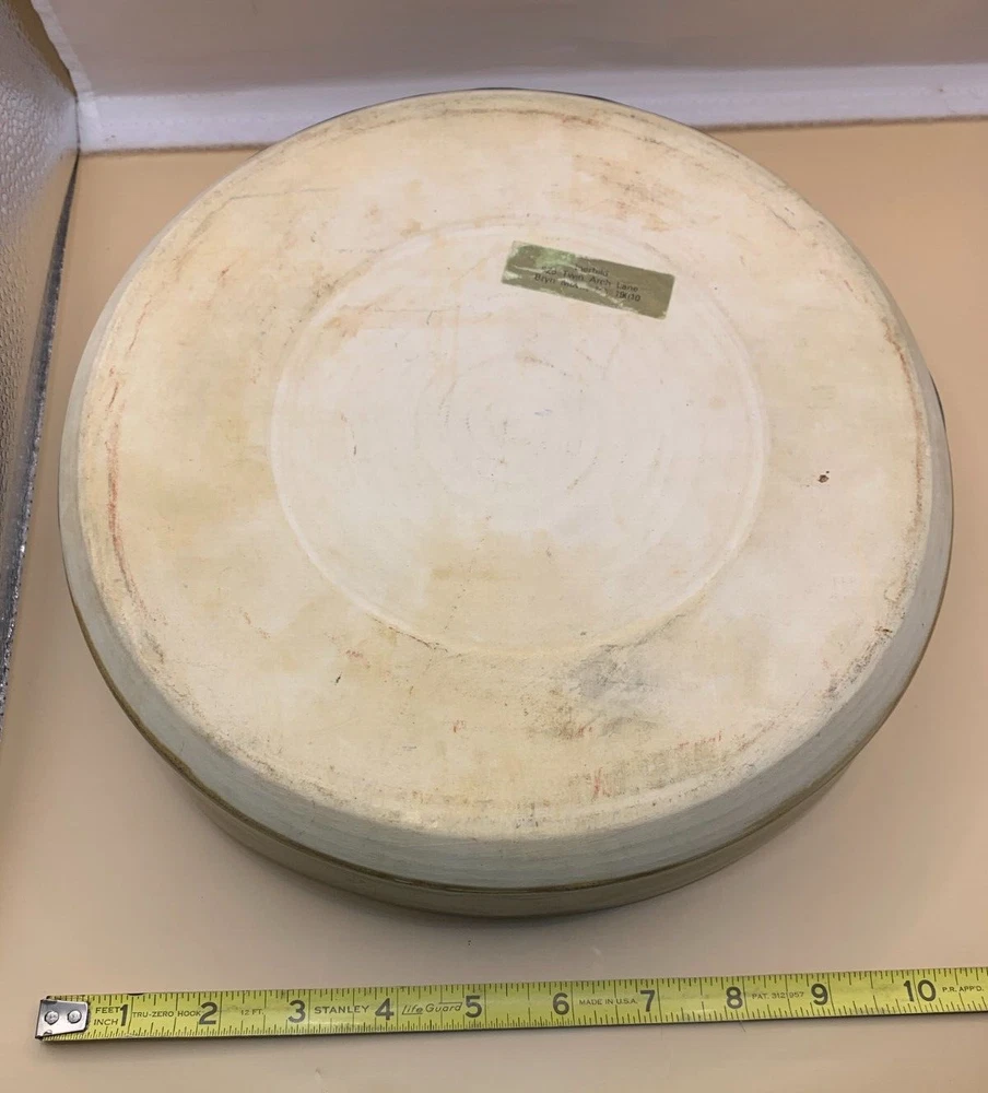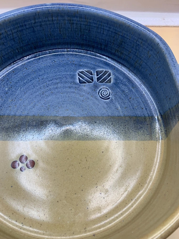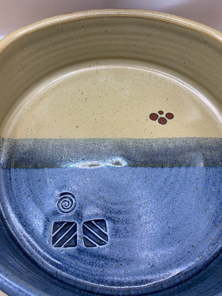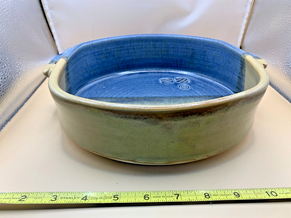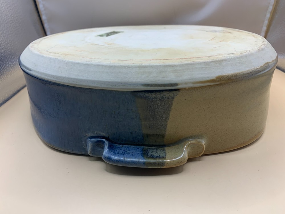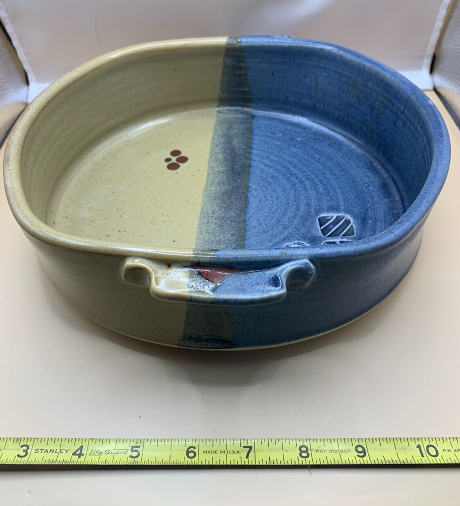 Beautiful pottery, ceramic casserole two handled dish serving plate handmade hand thrown in browns, tan, russet, blues. Appears to be wheel thrown. Stamped with potter's mark, unable to identify studio. From a Pennsylvania estate. See other listings for matching mugs and pitcher. Paper label on bottom, possibly former owner. Unknown date, possibly c. 1980-2000. Approx 9 1/2" h x 9" opening of dish wide at top opening. 11" across inclusive of handles. Just under 3" h. 3 lb 9 oz. Smoke-free, pet-free home. Contact with questions or for additional photos. NO returns.