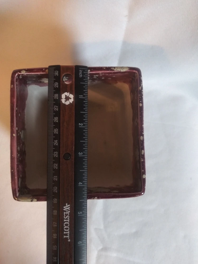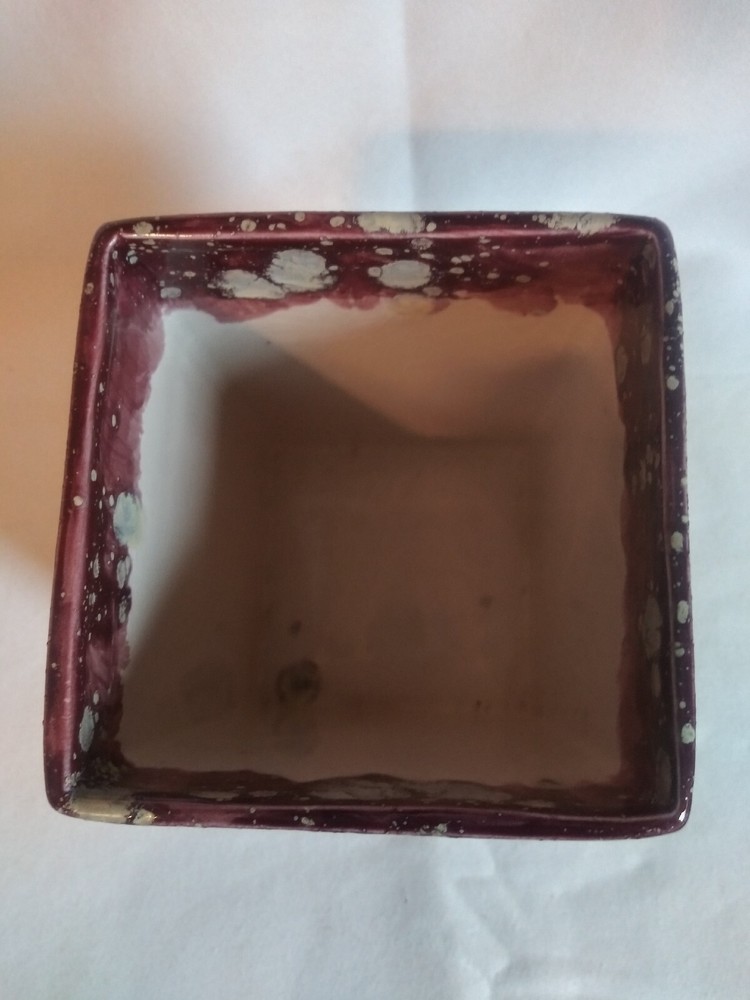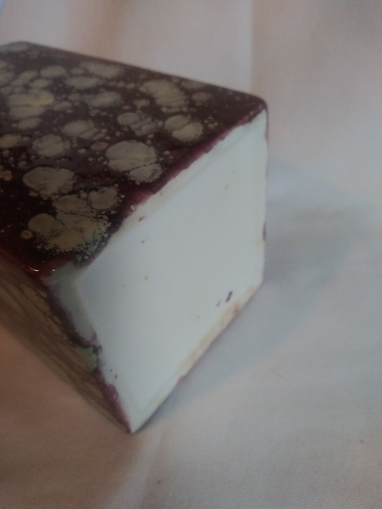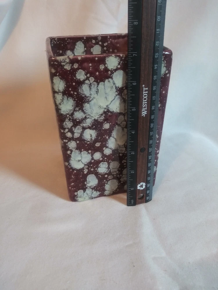 This beautiful 7" vase is a perfect addition to any decorative pottery collection. The elegant combination of plum and white, along with the square pattern, creates a unique focal point in any room. Made of high-quality ceramic material, this vase is a stunning example of studio crafted art pottery. This vase is perfect for holding flowers, decorative items, or simply as a stand-alone piece to enhance the decor in any space. Studio Art Pottery Ceramic Plum and White Square Vase 7". Good Condition. Crazing due to age. Measurements: Ht: appx: 7 inches Diameter: 4.5 inches. No chips or cracks.