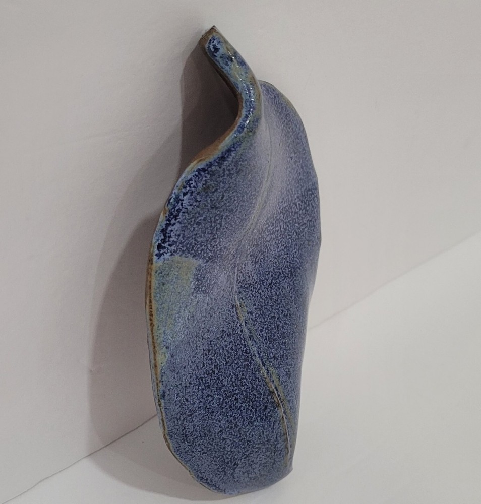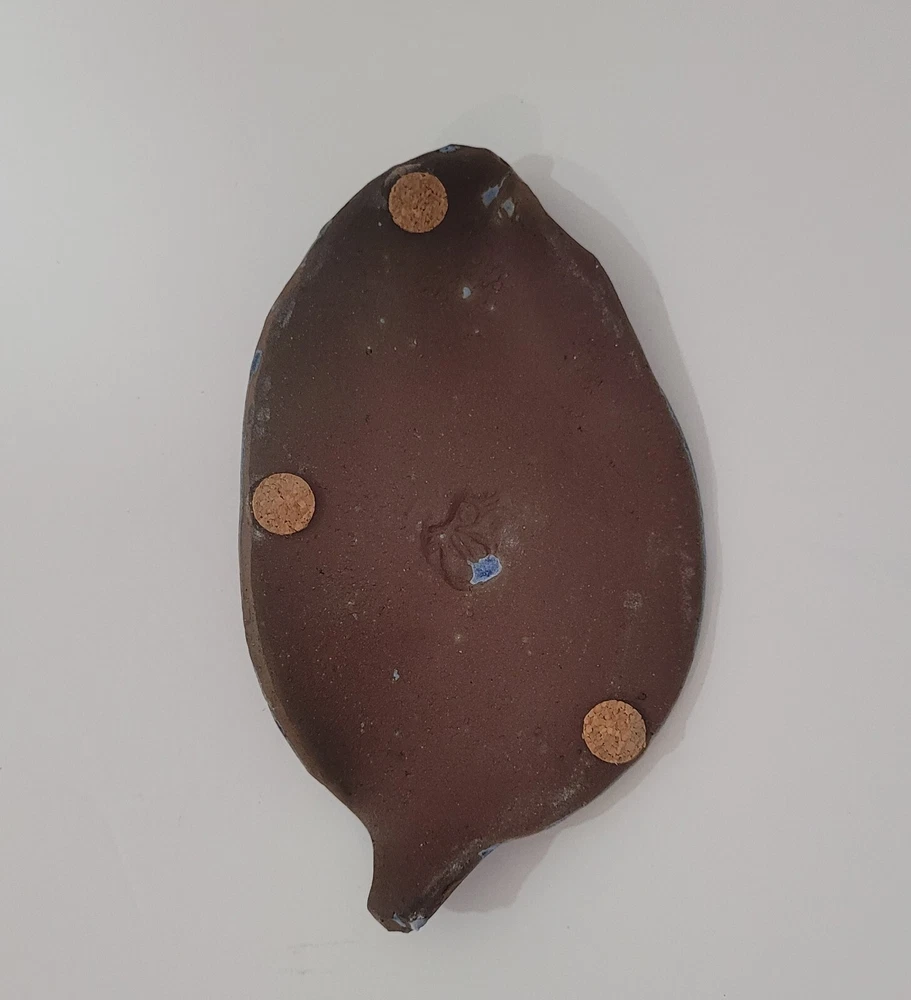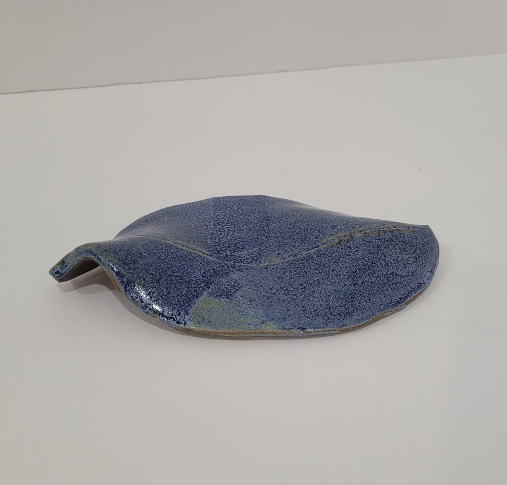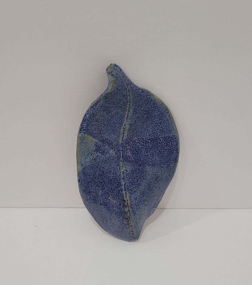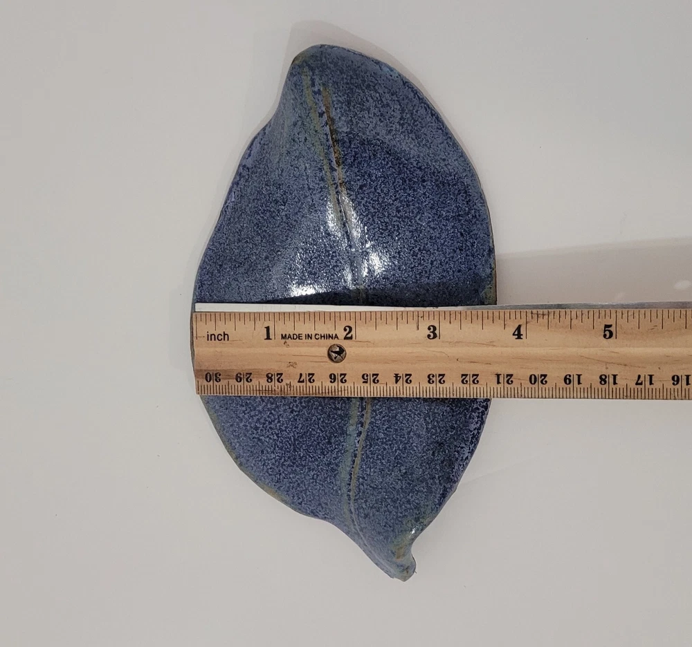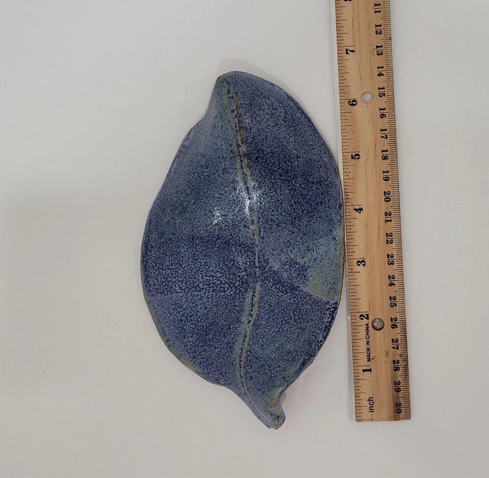 Studio Art Pottery Clay Leaf, Decor, Trinket, Blue Glaze, marked on back. It measures approximately 7" X 3.75".