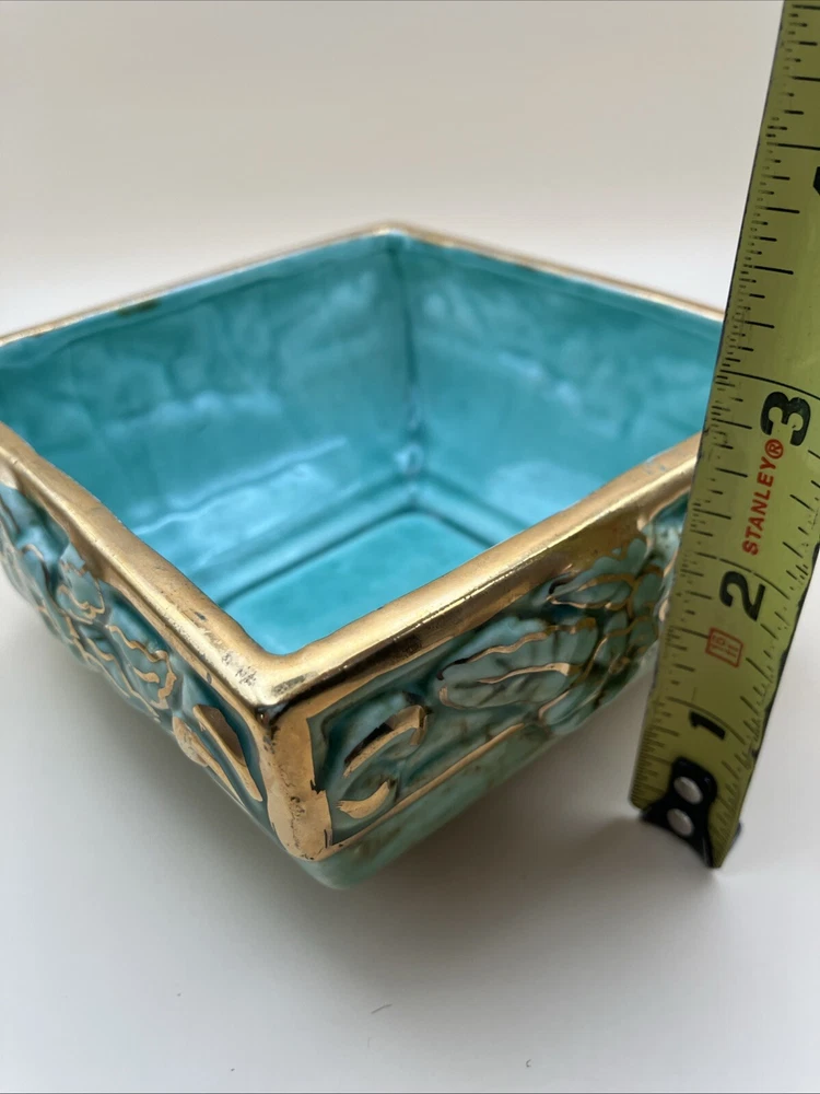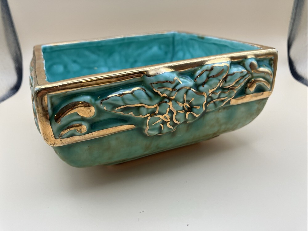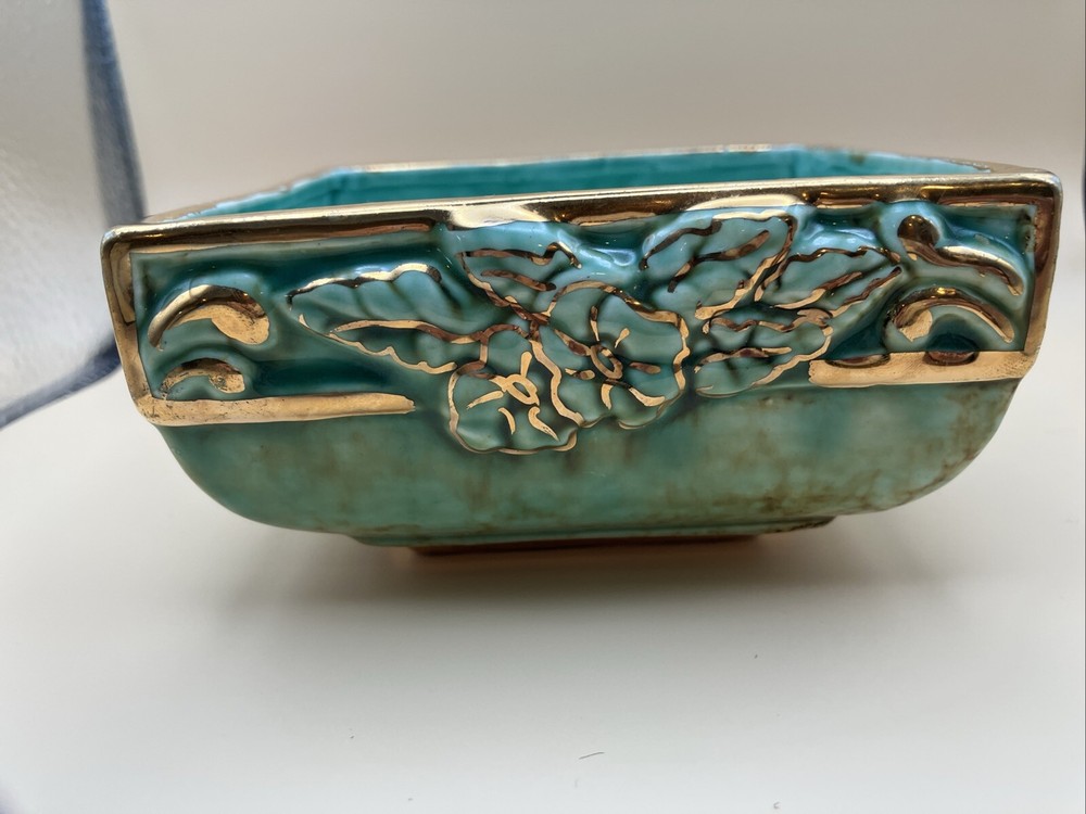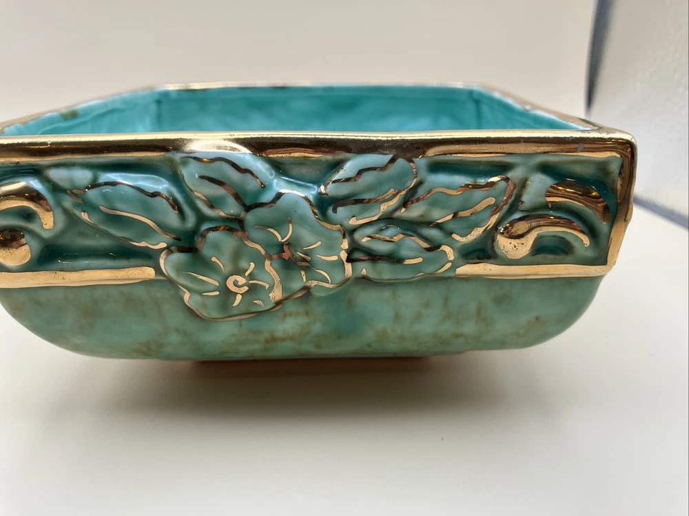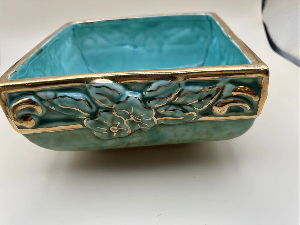 This stunning pottery dish is a gorgeous addition to any space! The rich aqua and teal hues paired with elegant gold gilt make it pop, while the raised floral design adds a lovely texture. Perfect as a small planter or decorative dish—so versatile and beautifully crafted!