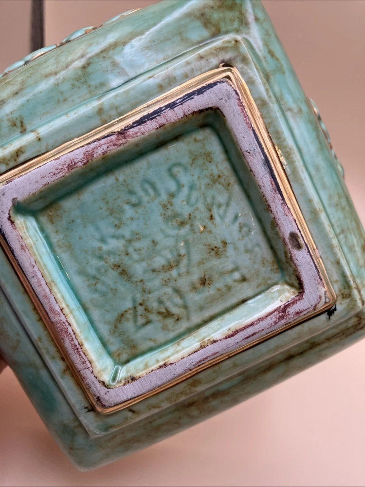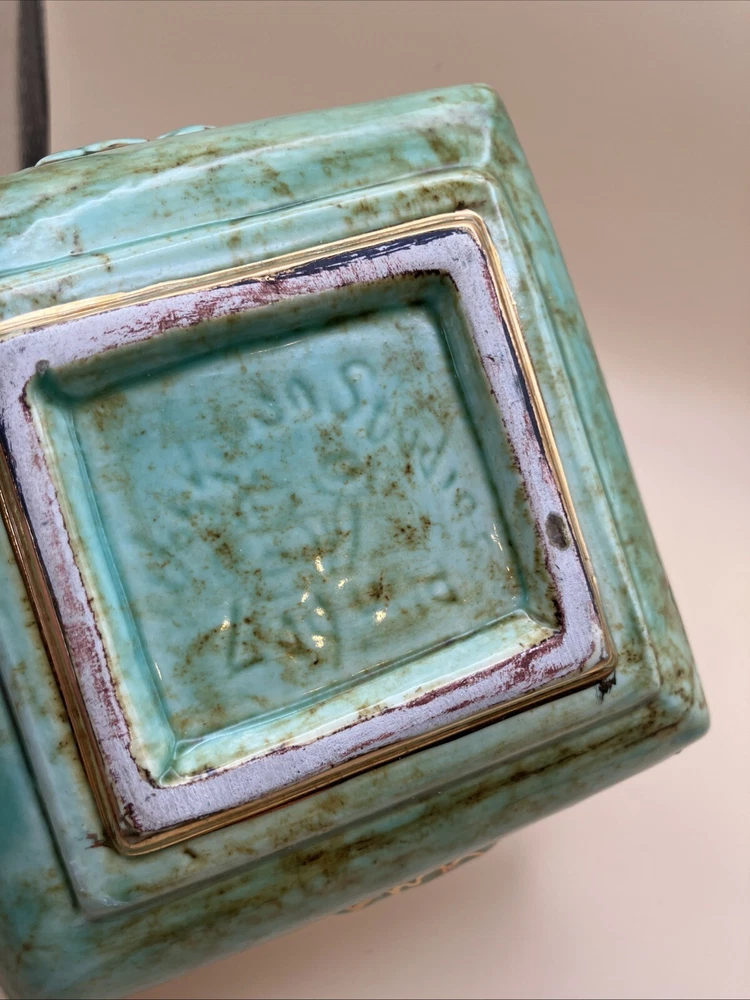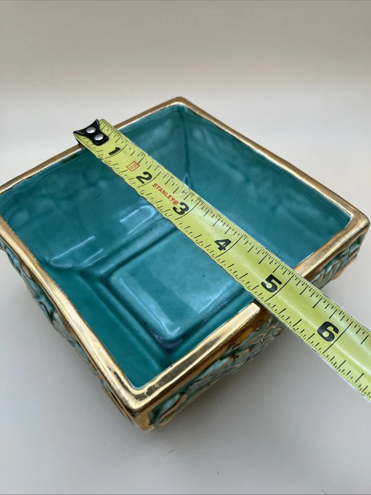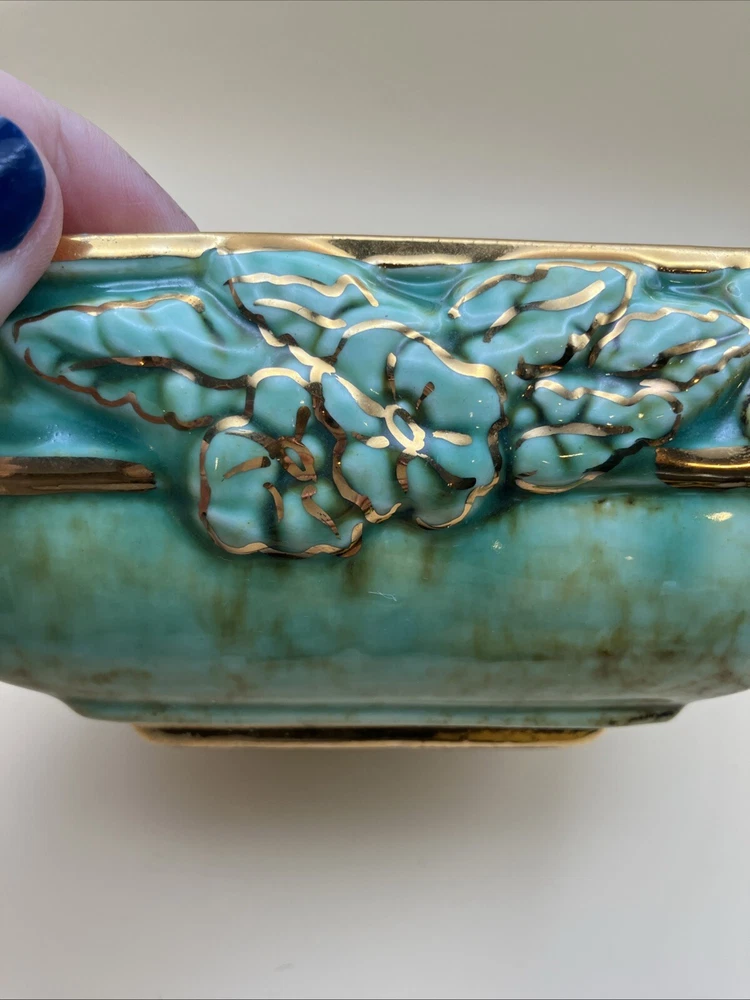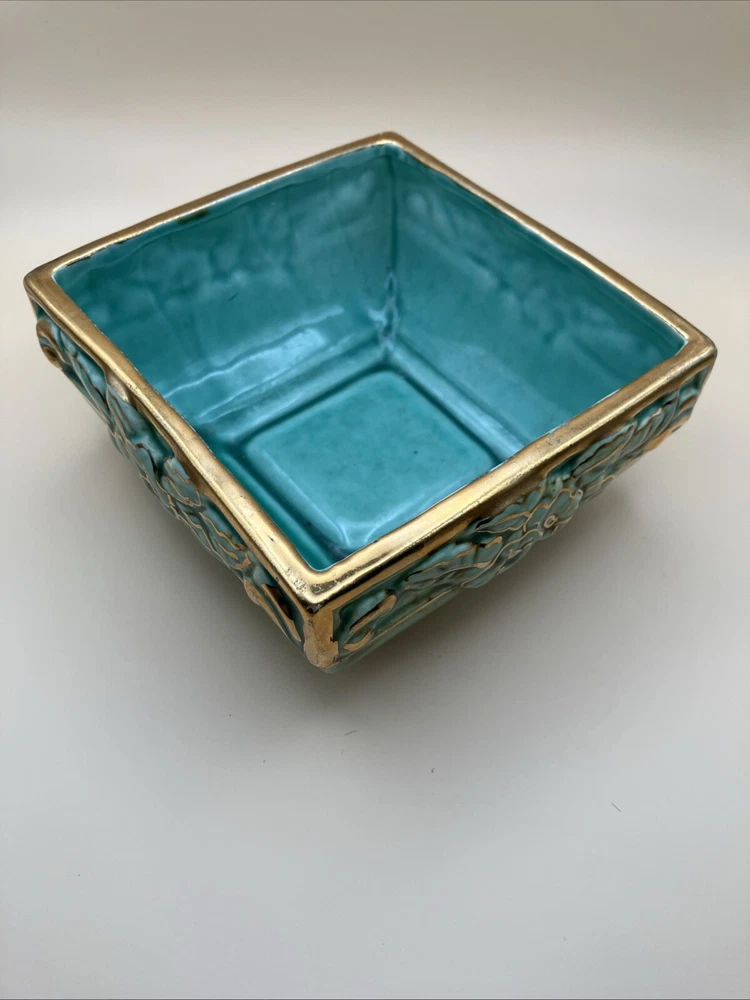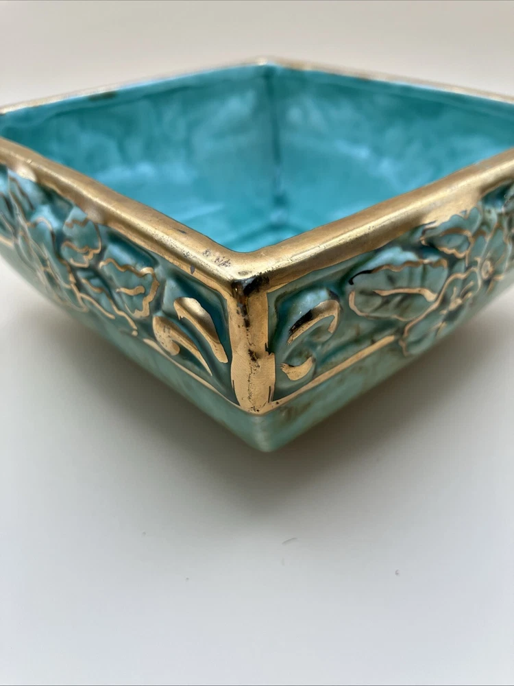 This stunning pottery dish is a gorgeous addition to any space! The rich aqua and teal hues paired with elegant gold gilt make it pop, while the raised floral design adds a lovely texture. Perfect as a small planter or decorative dish—so versatile and beautifully crafted!