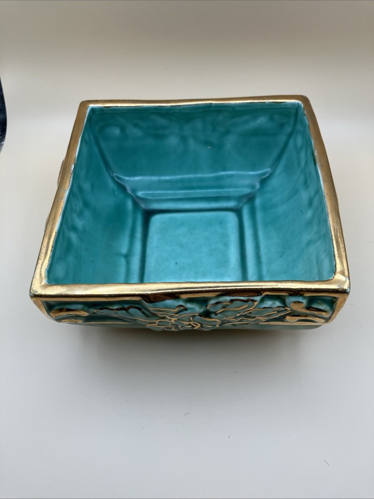 Studio Art Pottery Dish/Planter. Aqua/Teal Blue With Gold Gilt. Raised Floral design. 5”...