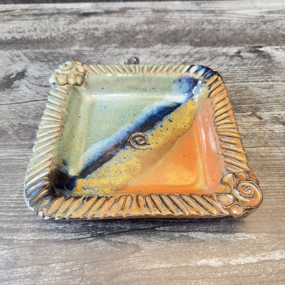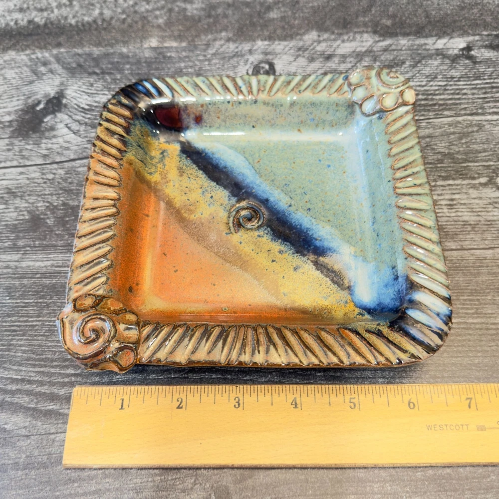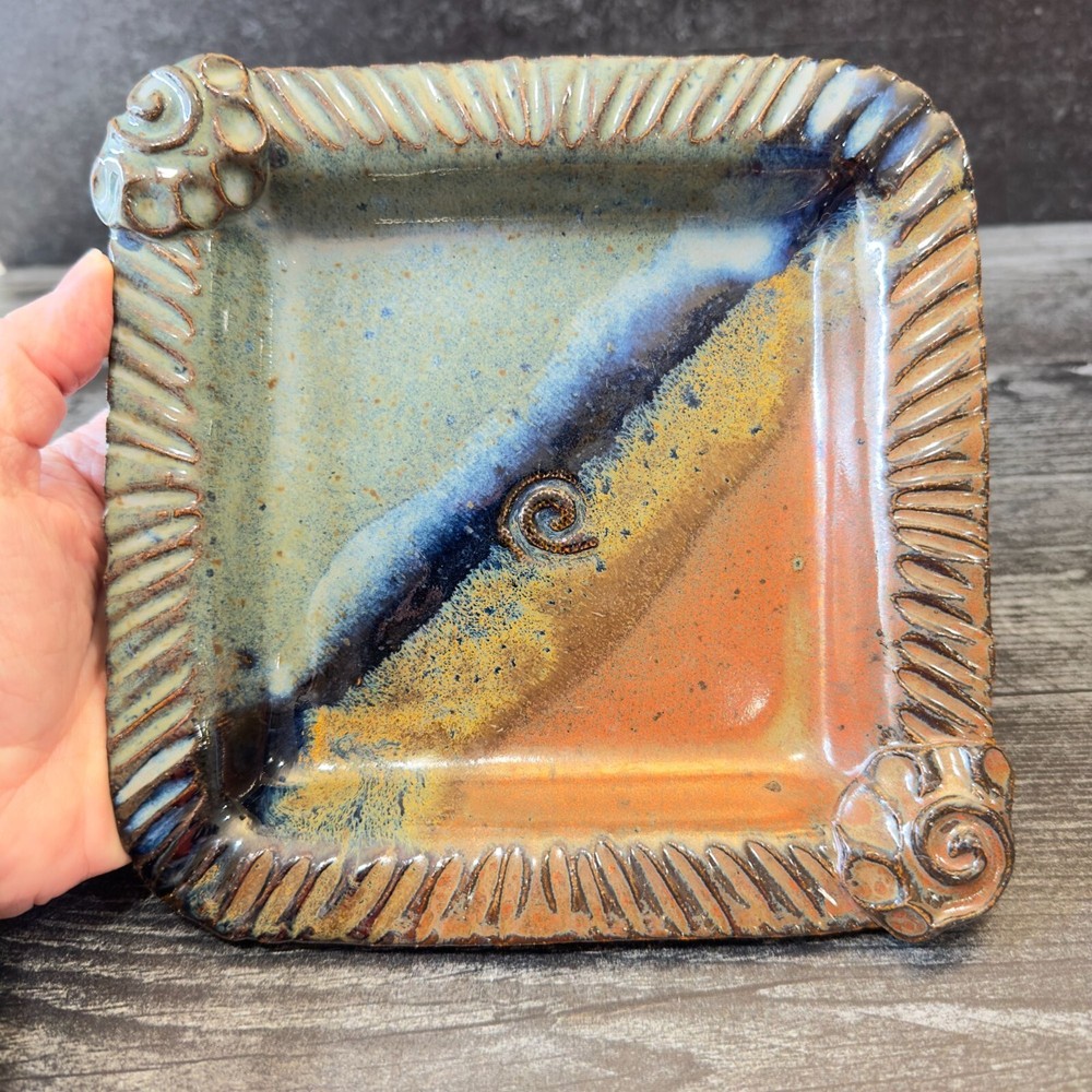 Handmade ceramic dish featuring a unique swirl pattern with earthy colors. Ideal for decor or serving small items. • Handcrafted ceramic • Unique swirl pattern • Earthy color palette • Square shape • Measurements - 6.75” square x 1.25” high Condition: Pre-Owned Good - one glaze spot Photos are a part of description and best indicate condition. Contact us with questions before purchase. Photo props not included - only items in title are being sold. #33642