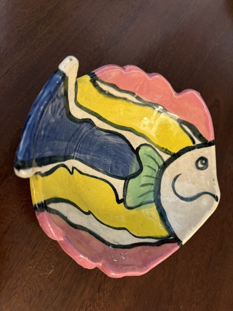 Add a touch of elegance to your dining table with this beautiful Studio Art Pottery Fish Shaped Bowl. The bright colors and intricate hand-painted details make it a perfect decorative piece for any occasion. Made of high-quality clay, this bowl is not only stylish but also durable. The fish theme adds a touch of whimsy to your decor and is sure to impress your guests. Ideal for serving salads, fruits, or any other dish, this bowl is a must-have for any kitchen. The production style of art pottery ensures that each piece is unique, making it a great addition to your collection.