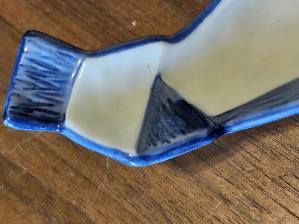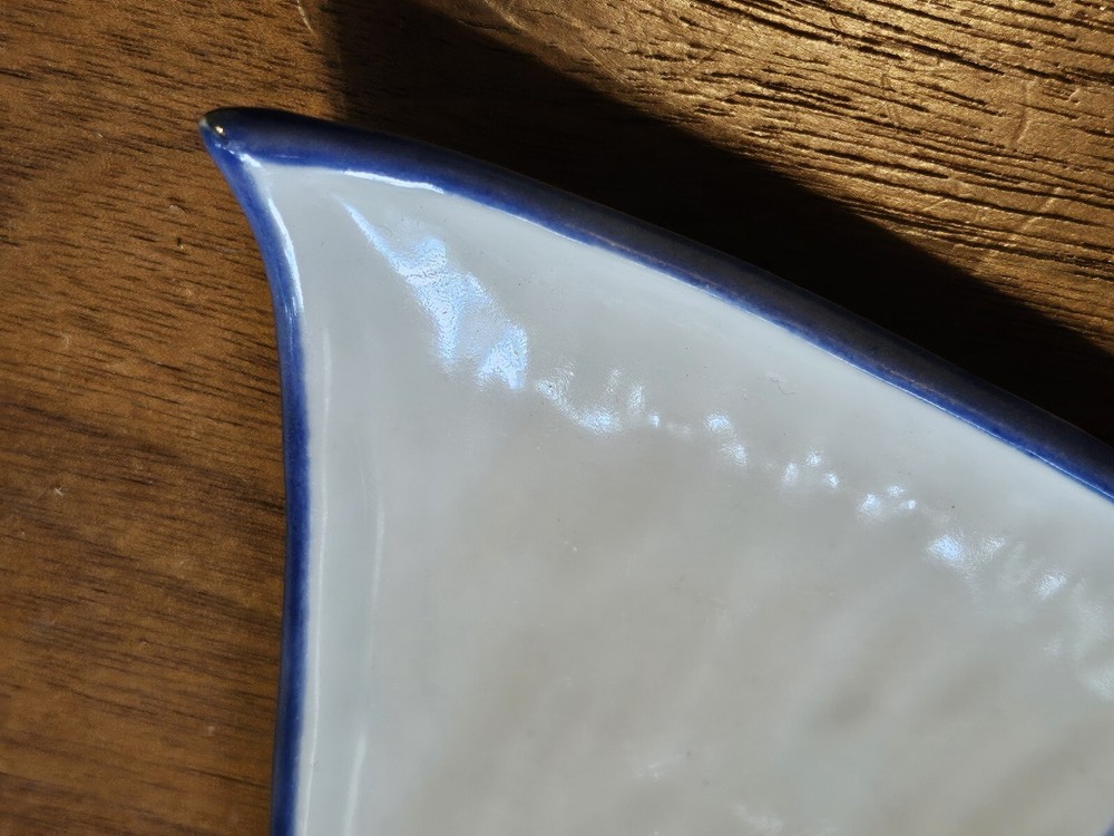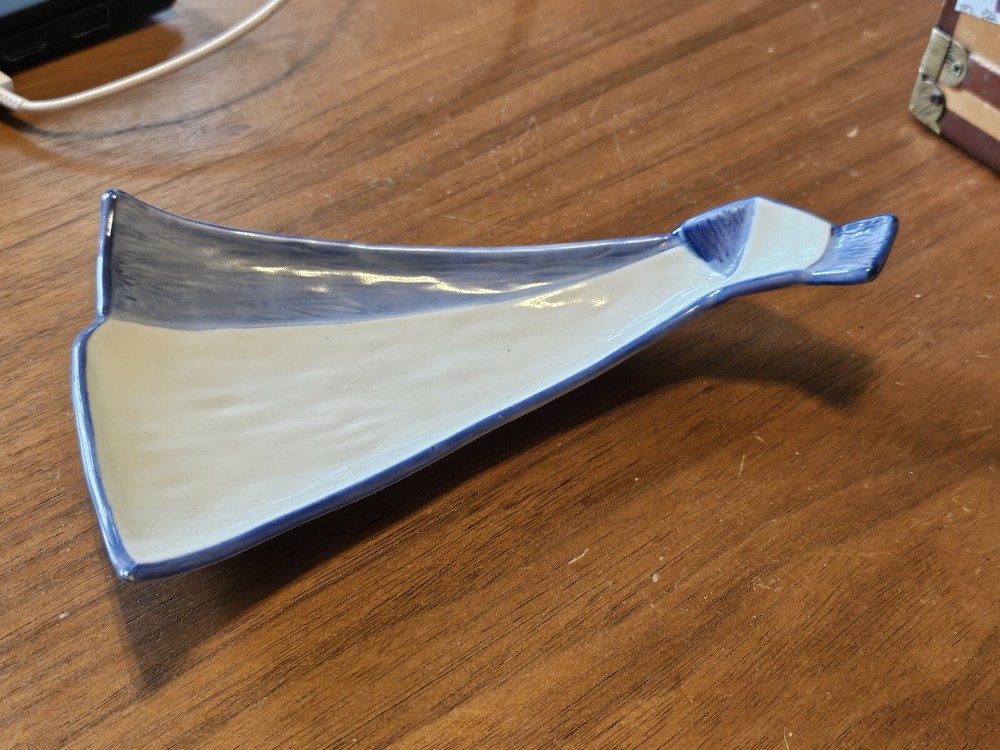 Studio Art Pottery GLAZED Blue White Abstract Shaped 7.5" Bowl Signed with stamp mark Mayan crown and ?