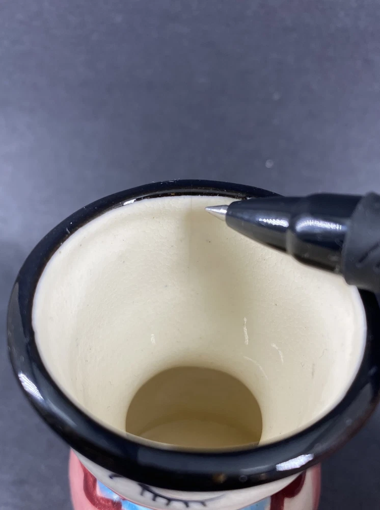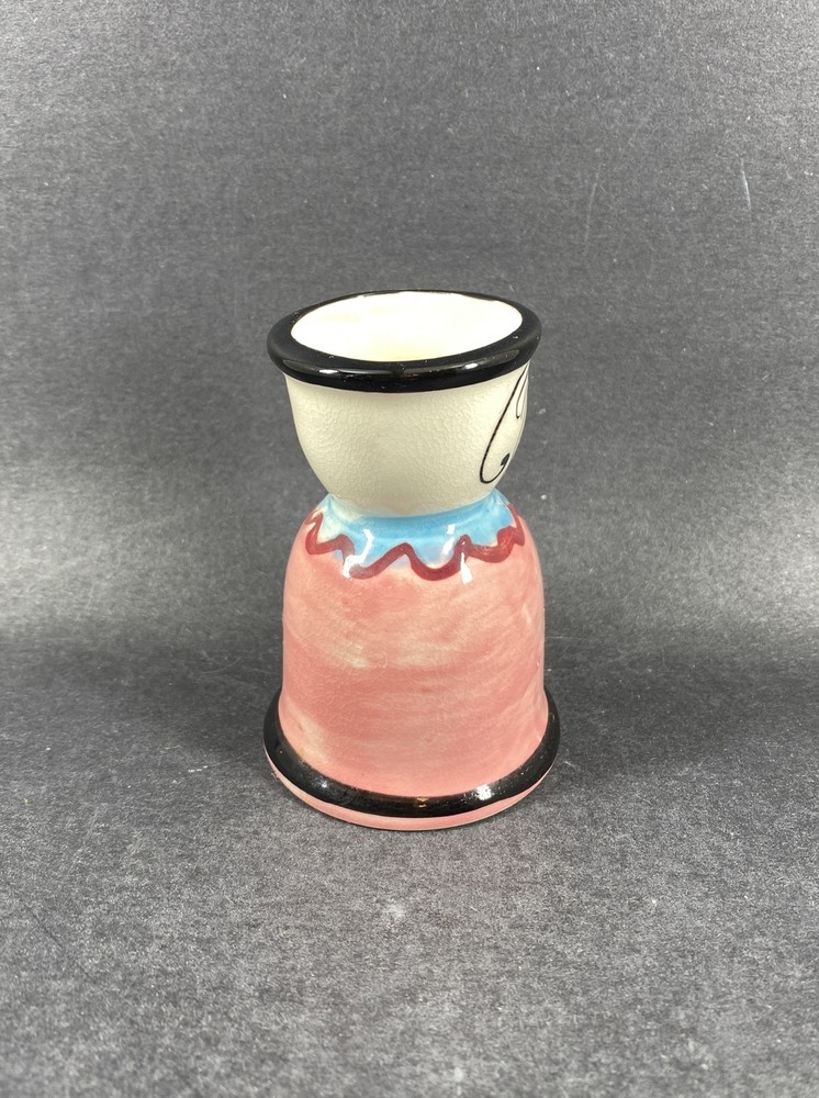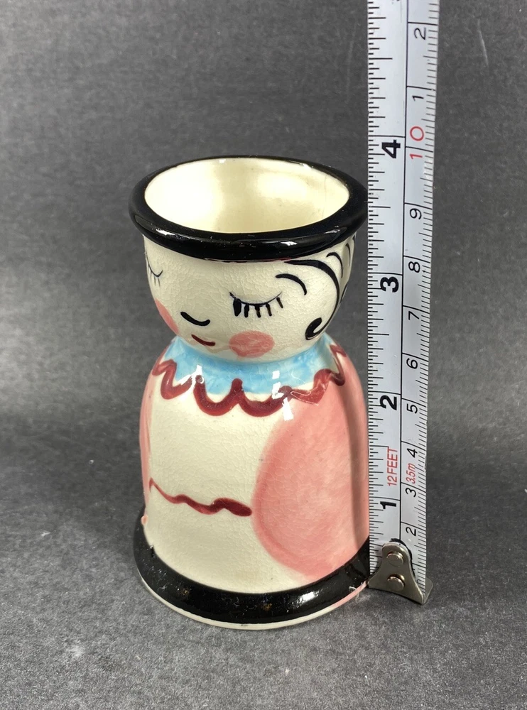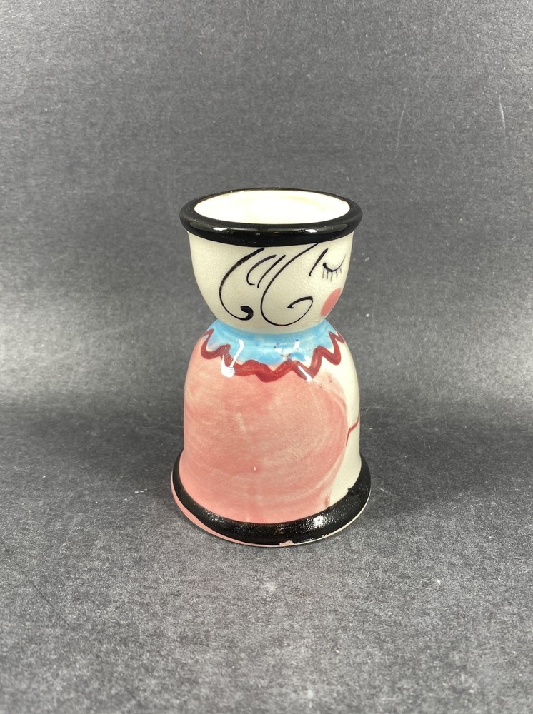 Studio Art Pottery Girl Shaped Hand Painted Small Vase No chips. There is a glaze crack inside as noted in photos. It measures approx 3-3/8” height x 1-7/8” in diameter at the opening x 2-3/8” in diameter at the bottom.