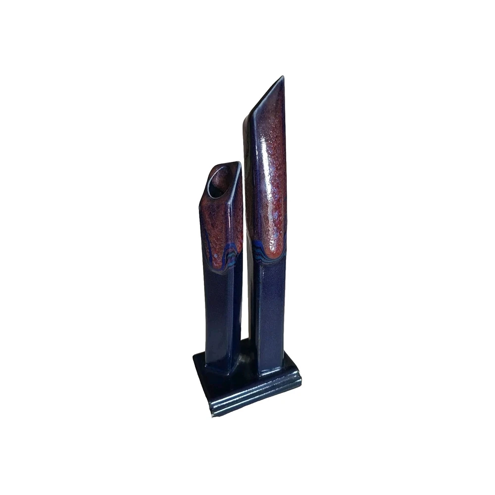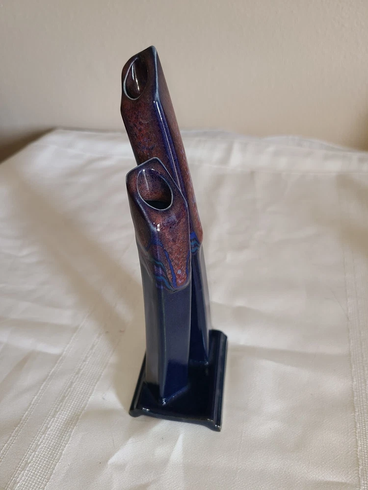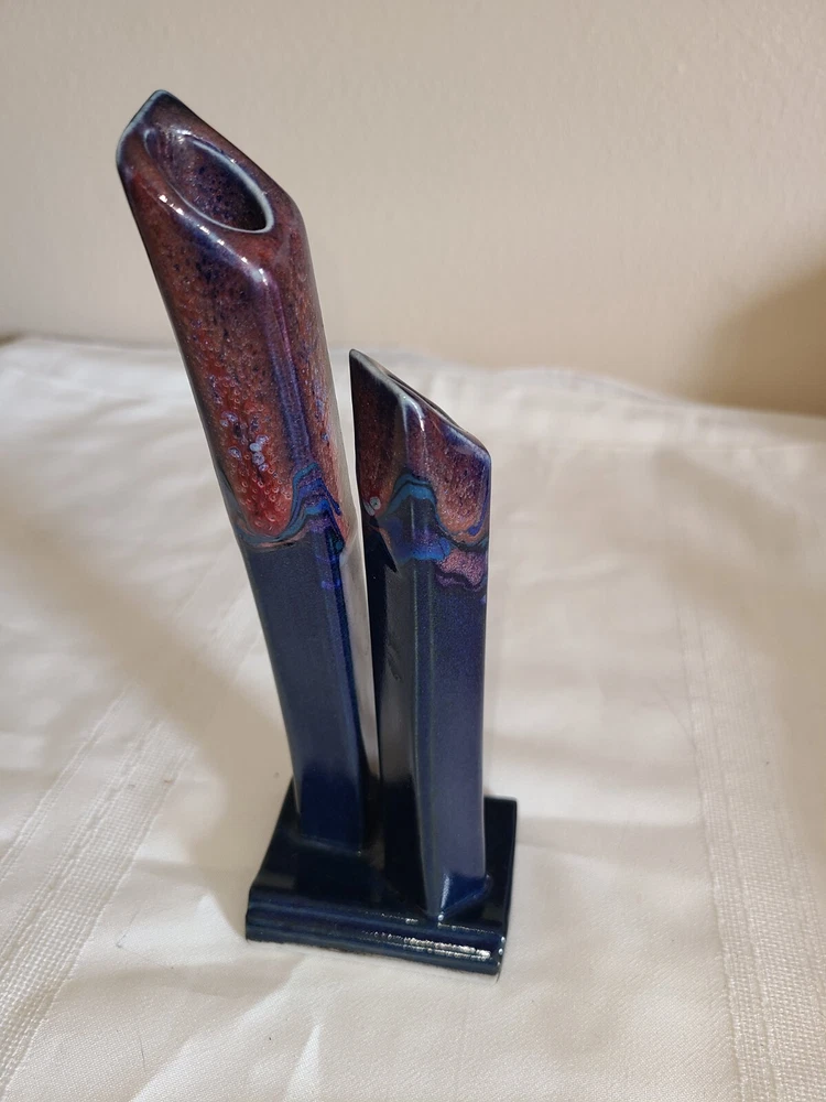 Studio Art Pottery Glazed Double Bud Vase Square Vase Blue and Purple 8" Tall....