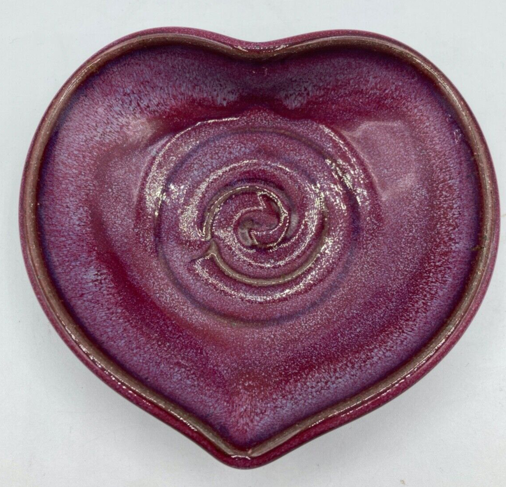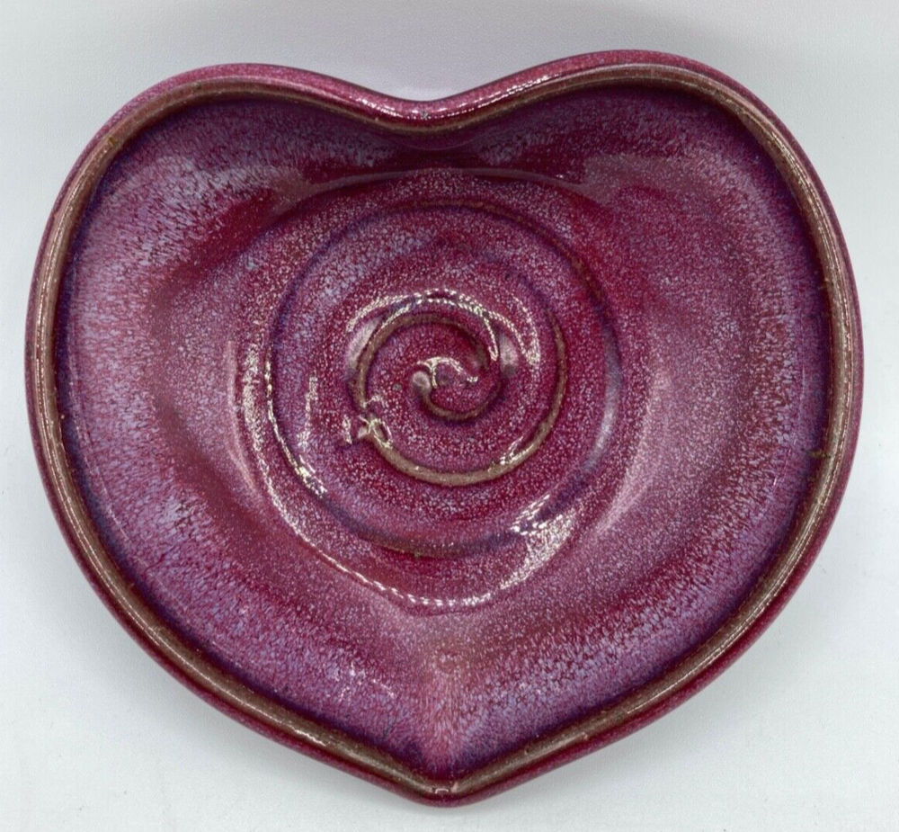 Studio Art Pottery Heart Shaped Bowl Trinket Dish. Beautiful Magenta Purple Lavendar Drip Glaze. No chips or cracks. Artist mark on the bottom. Measures 1 3/4" tall x 5" x 5 1/2" Please ask if you have any questions :)