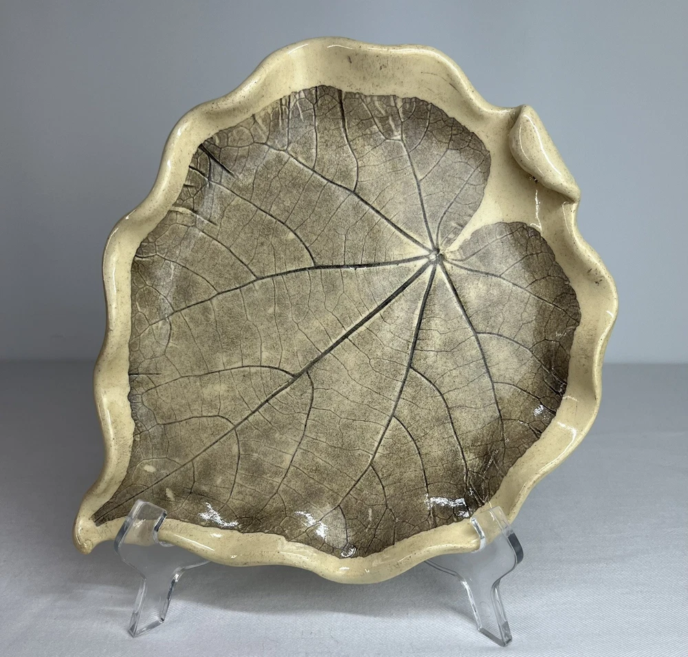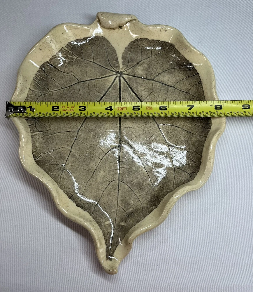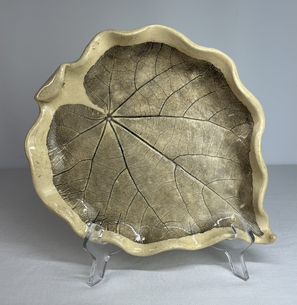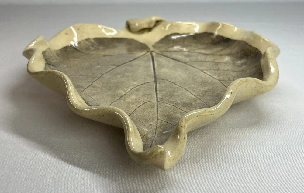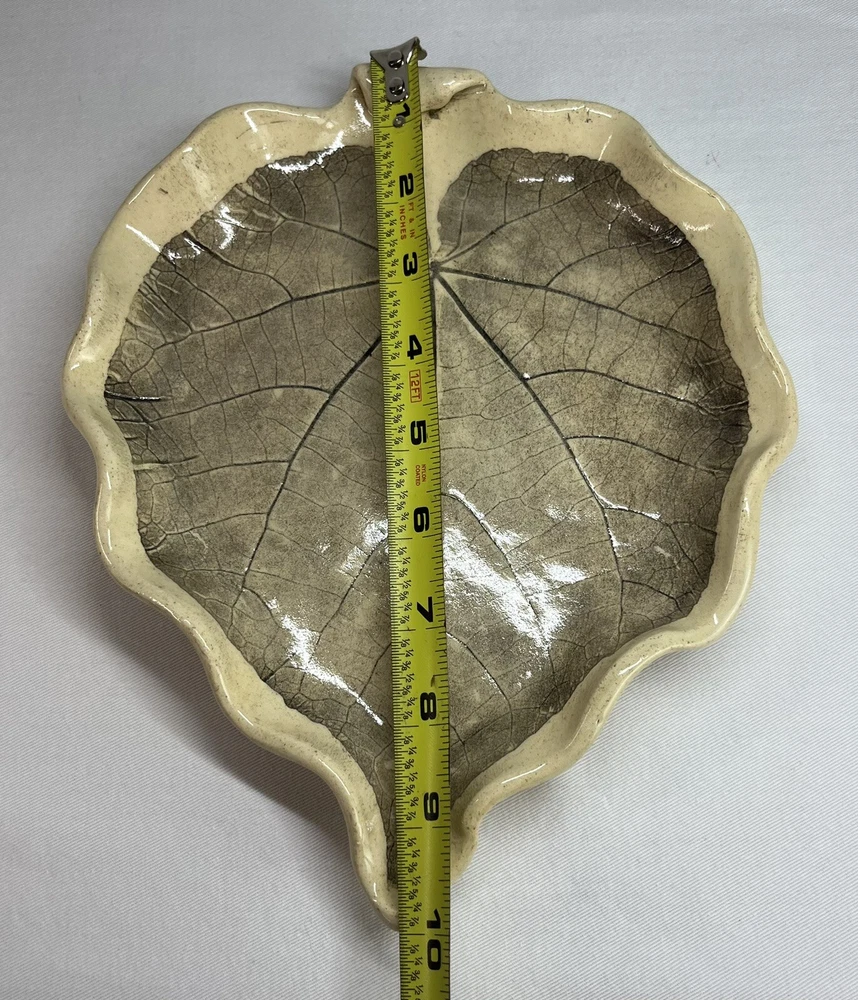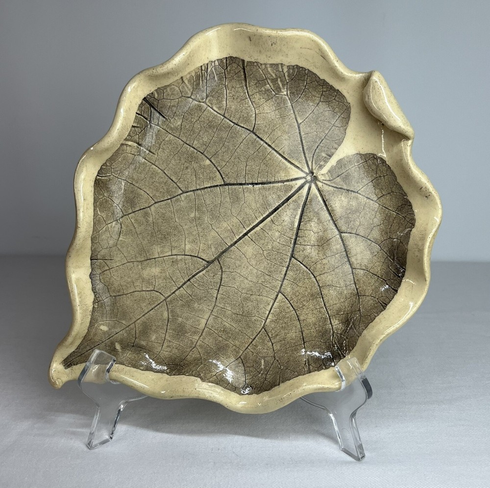 Lovely leaf-shaped and textured serving dish/plate/tray. Signed by the artist on the underside. Its base consists of 3 clear, smooth stones as “feet” affixed to the underside of the bas and its very stable. Beige hue with dark gray plant veins. OOAK decorating or service piece. Excellent preowned condition with no chips or cracks - only minor signs of previous use are present (shallow scratching/scuffing). Please note: the acrylic stand is used only for display purposes and is not included in this sale. Approximate Measurements: 10” L x 1.5” H x 8” W Stored in a smoke free home. Please see photos and as necessary to see detail, as they are part of the description. All plush and/or used clothing has been washed and/or sanitized prior to sale. I usually ship within one to two (1-2) business days of receiving cleared payment. I ship to the Ebay registered address ONLY. Shipping is via the United States Postal Service only - no UPS or FedEx. Although I try to do my part in saving trees by using recycled shipping boxes as often as possible, rest assured the item inside will be well protected. Only professional packing supplies (i.e. bubble wrap, air pockets, styrofoam peanuts or packing paper) are used when shipping fragile items. I want to protect your investment. Thank you for looking. And for reading ALL THE WAY DOWN TO HERE. Check back soon because I’m always adding new goodies!