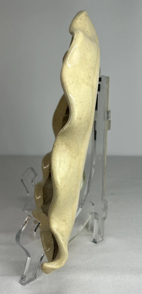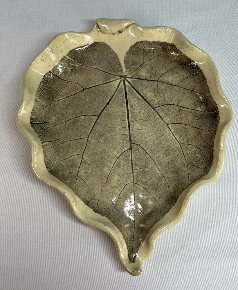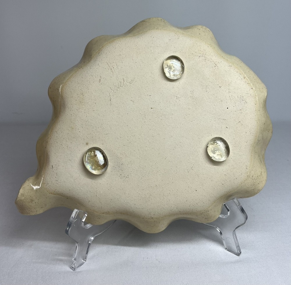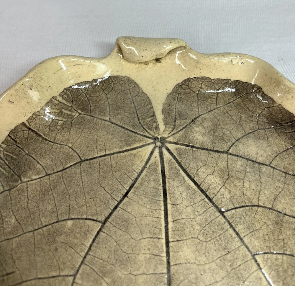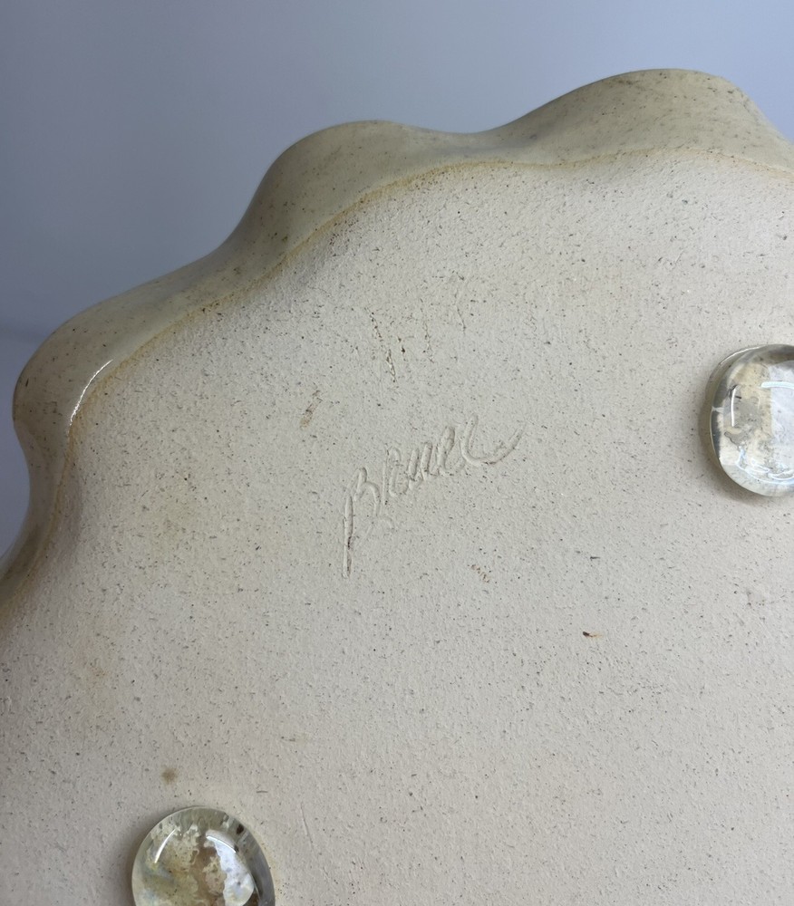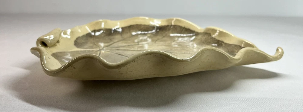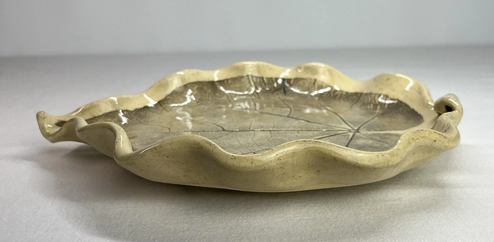 Lovely leaf-shaped and textured serving dish/plate/tray. Signed by the artist on the underside. Its base consists of 3 clear, smooth stones as “feet” affixed to the underside of the bas and its very stable. Beige hue with dark gray plant veins. OOAK decorating or service piece. Excellent preowned condition with no chips or cracks - only minor signs of previous use are present (shallow scratching/scuffing). Please note: the acrylic stand is used only for display purposes and is not included in this sale. Approximate Measurements: 10” L x 1.5” H x 8” W Stored in a smoke free home. Please see photos and as necessary to see detail, as they are part of the description. All plush and/or used clothing has been washed and/or sanitized prior to sale. I usually ship within one to two (1-2) business days of receiving cleared payment. I ship to the Ebay registered address ONLY. Shipping is via the United States Postal Service only - no UPS or FedEx. Although I try to do my part in saving trees by using recycled shipping boxes as often as possible, rest assured the item inside will be well protected. Only professional packing supplies (i.e. bubble wrap, air pockets, styrofoam peanuts or packing paper) are used when shipping fragile items. I want to protect your investment. Thank you for looking. And for reading ALL THE WAY DOWN TO HERE. Check back soon because I’m always adding new goodies!