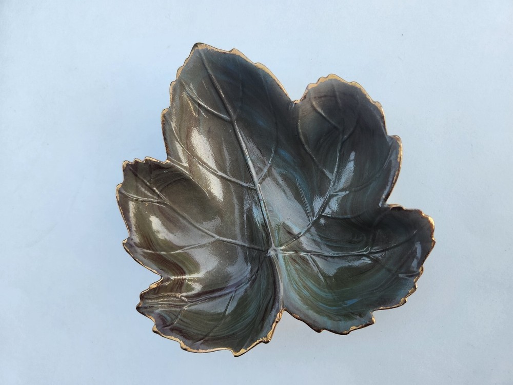 Gorgeous MCM Studio Art Pottery Leaf Trinket Dish. Green with Gold Glazed Ceramic signed Nan. In EUC