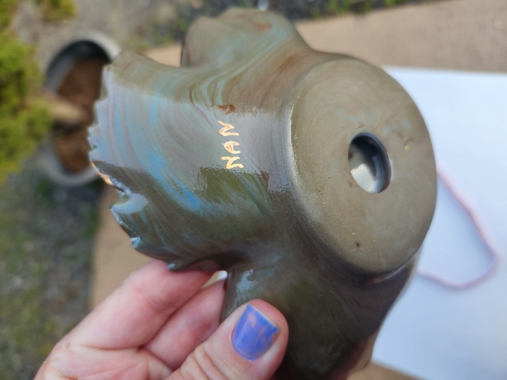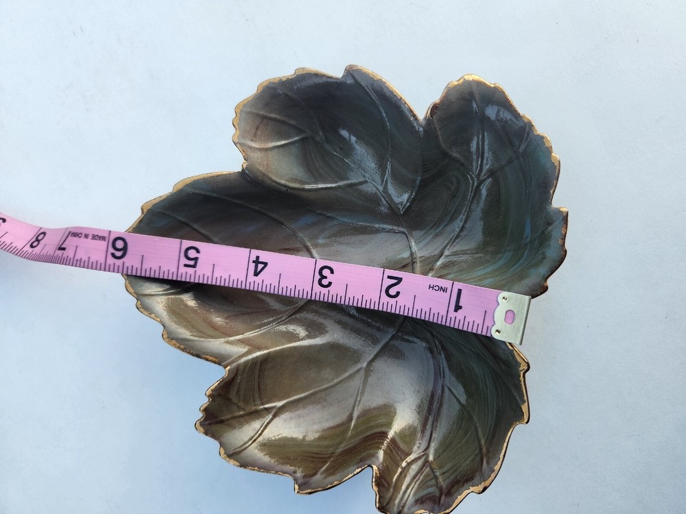 This stunning leaf-shaped trinket dish is a true work of art! The rich green glaze with gold accents gives it a luxurious mid-century vibe, and the handcrafted ceramic feels substantial yet elegant. Perfect for holding jewelry, keys, or small treasures. The artist's signature (Nan) adds a special touch—clearly made with love. Excellent condition too!