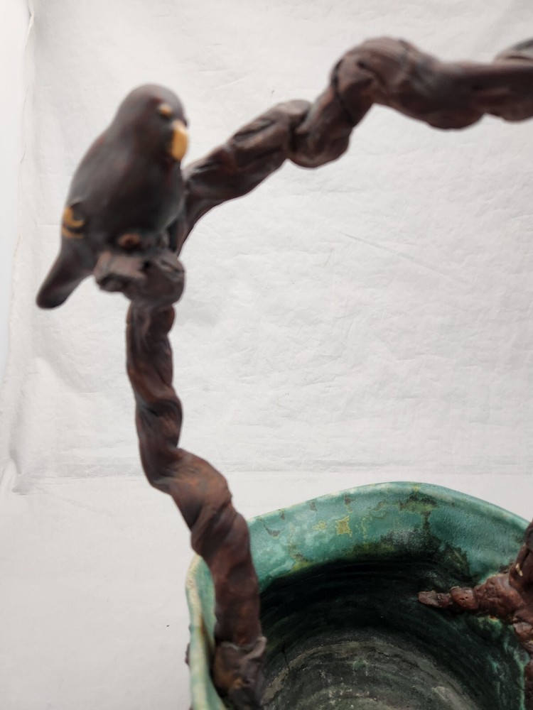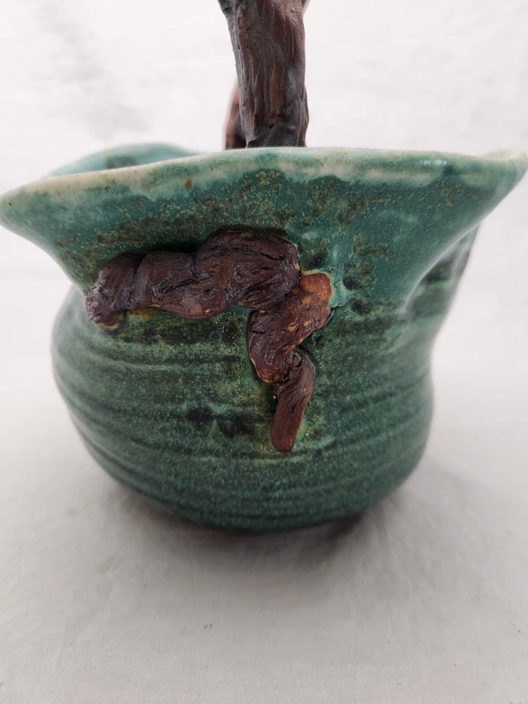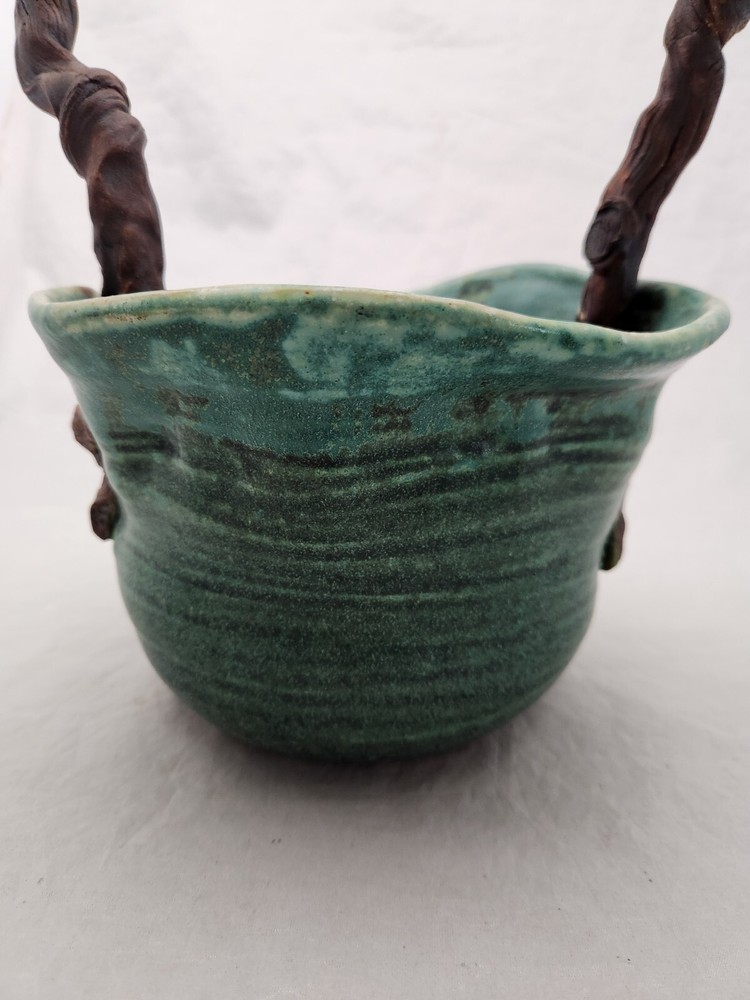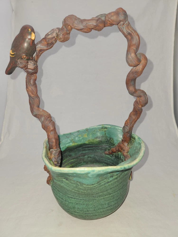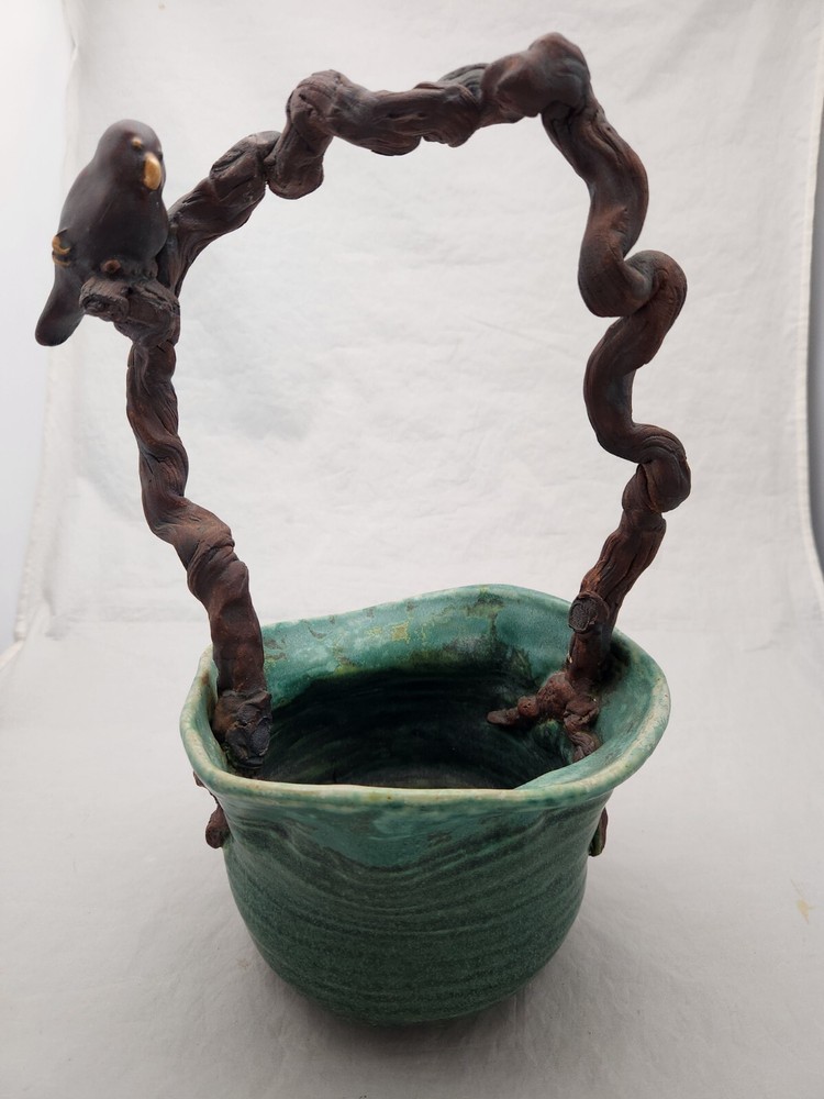This vintage studio art pottery planter is a unique addition to any home decor. The pottery handle is shaped like a branch that looks like it has grown into the sides of the pot with a bird perched on the handle, adding a touch of whimsy to the piece. This planter is perfect for those who appreciate the beauty of vintage pottery and want to add a touch of personality to their plant display. Get your hands on this one-of-a-kind piece today! Because of the irregular shape of the pot and handle close measurements are 14 x 10 x 7. No damage, no chips or cracks. See photos. Photo #9 was taken in a different light to show detail.