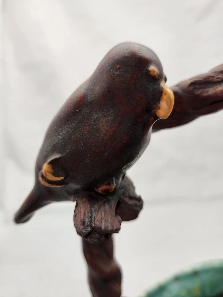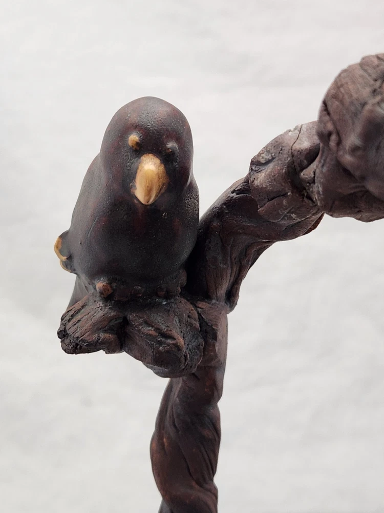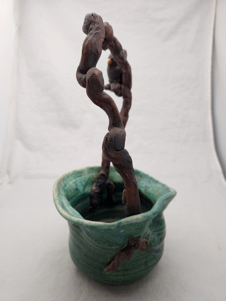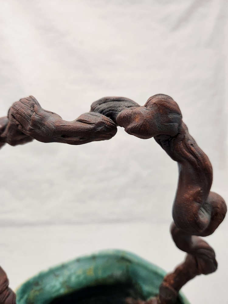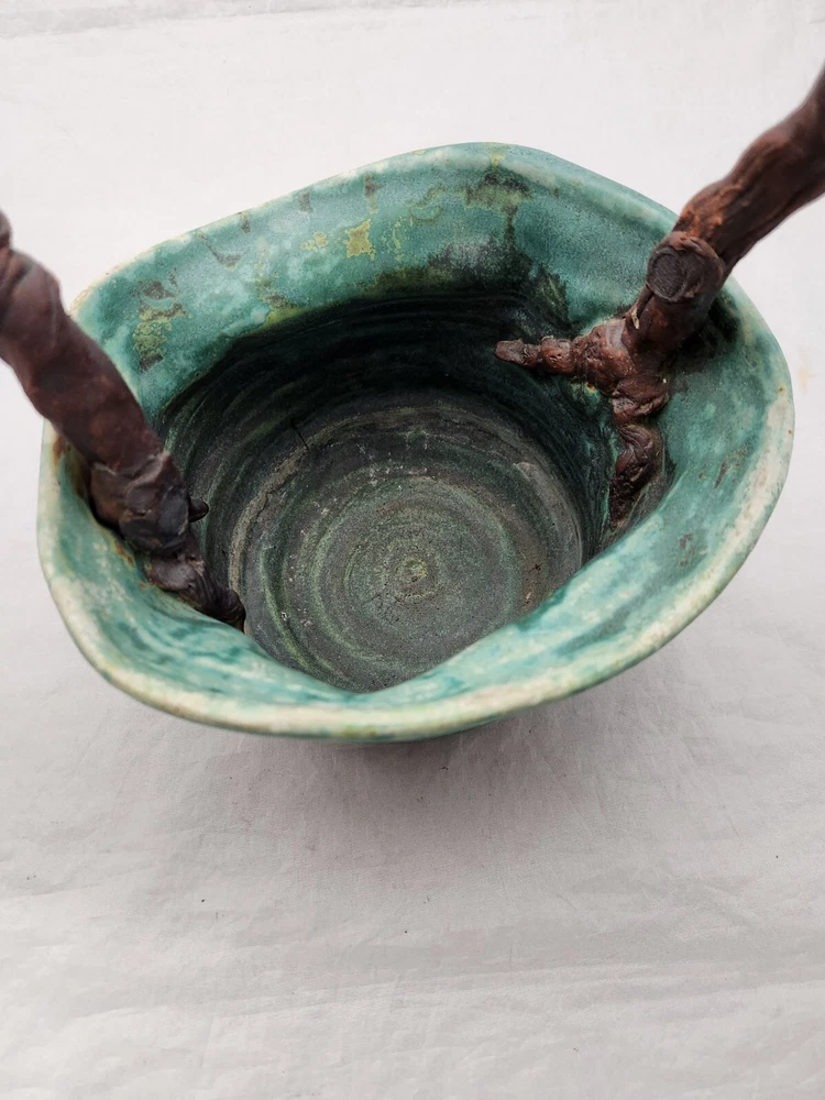 This vintage studio art pottery planter is a unique addition to any home decor. The pottery handle is shaped like a branch that looks like it has grown into the sides of the pot with a bird perched on the handle, adding a touch of whimsy to the piece. This planter is perfect for those who appreciate the beauty of vintage pottery and want to add a touch of personality to their plant display. Get your hands on this one-of-a-kind piece today! Because of the irregular shape of the pot and handle close measurements are 14 x 10 x 7. No damage, no chips or cracks. See photos. Photo #9 was taken in a different light to show detail.