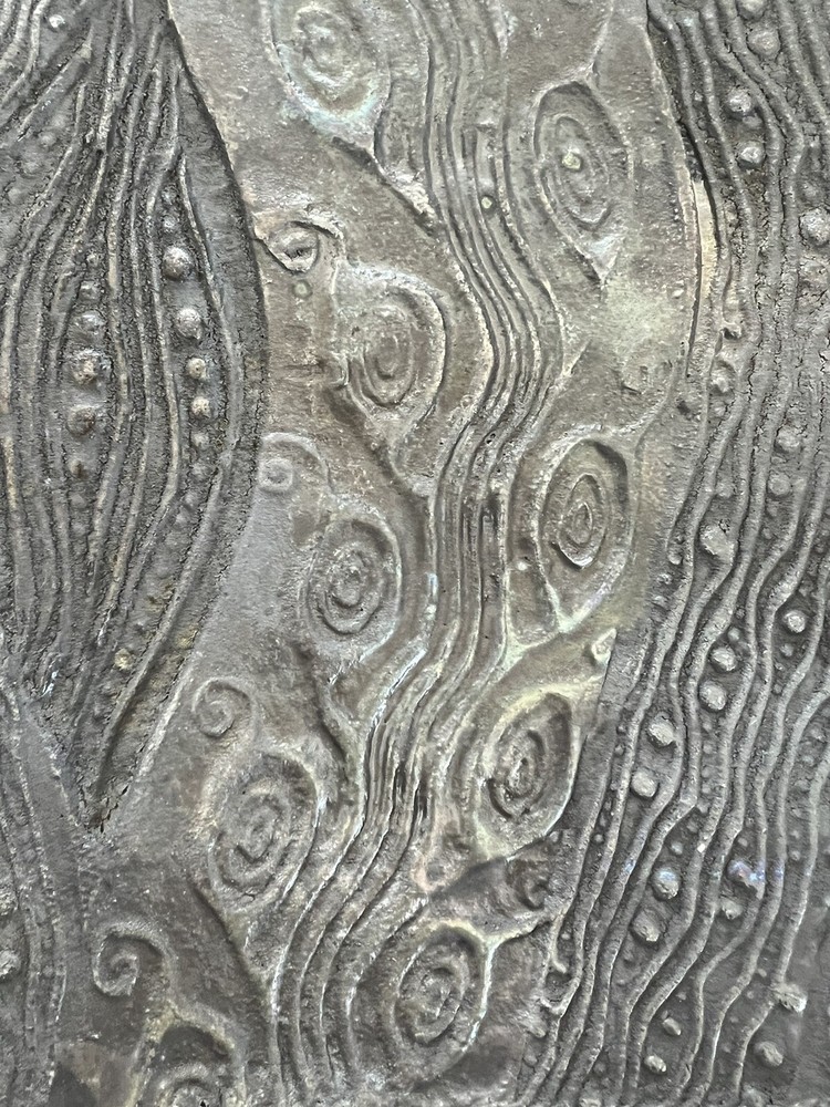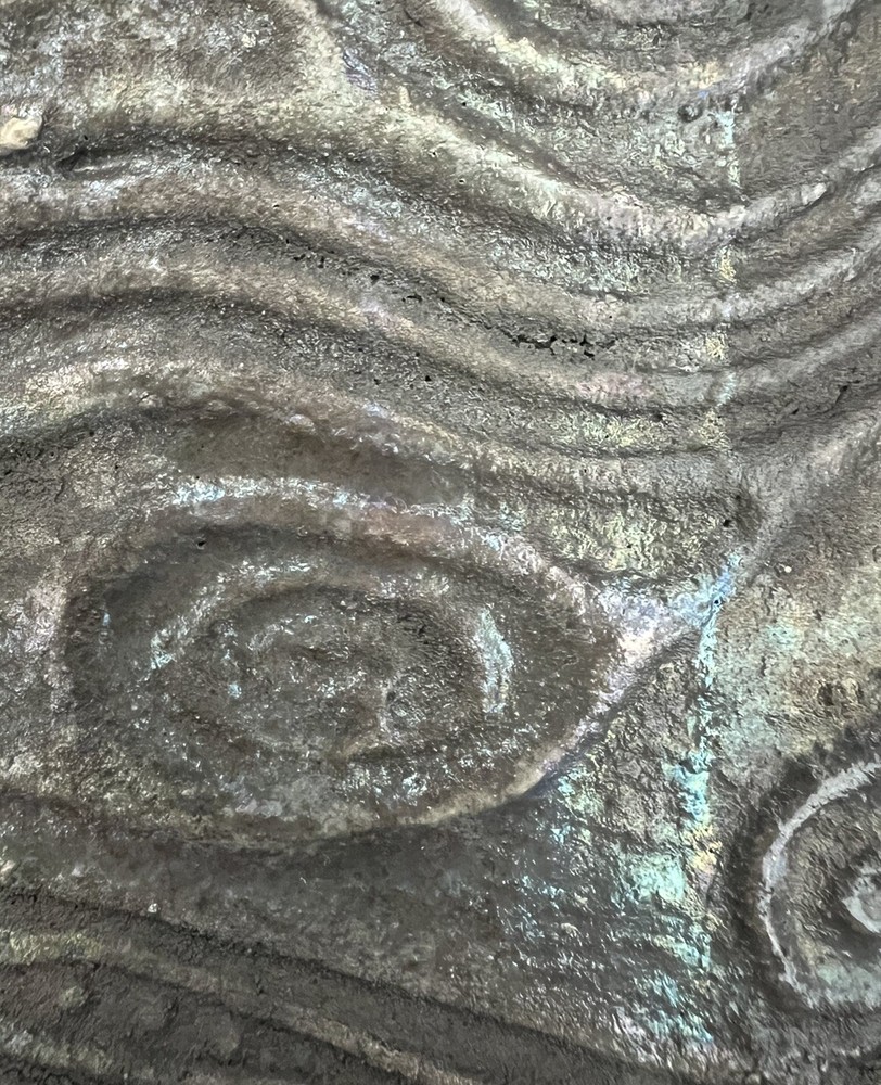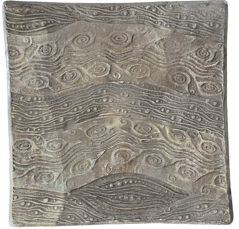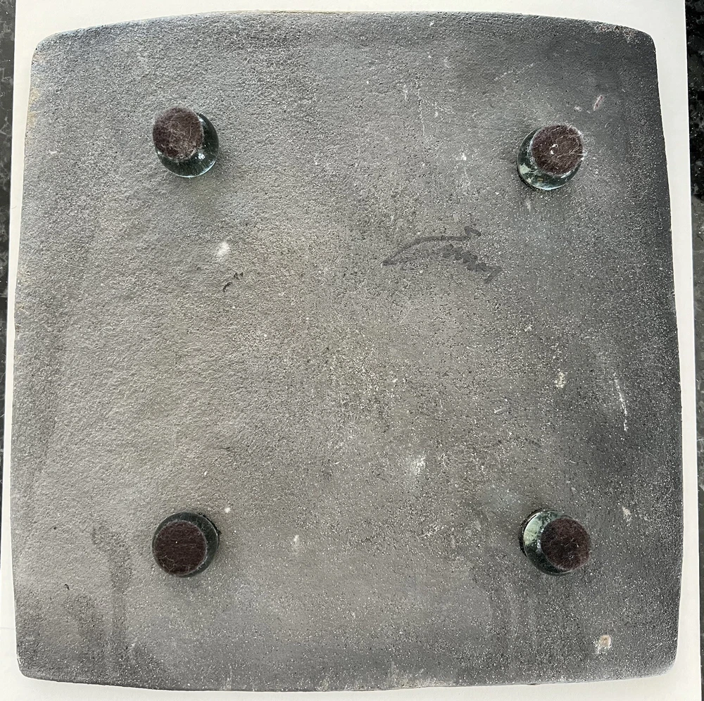 This stunning studio art pottery plate boasts a unique organic elemental design that is sure to add uniqueness to any collection. Shades of grays and light browns with beautiful traces of iridescent glazes. The plate measures 11 inches square and is signed by the artist. The bottom has clear balls with felt pads on to protect your surface. It is perfect for collectors of studio art pottery and is sure to be a standout piece in any display.